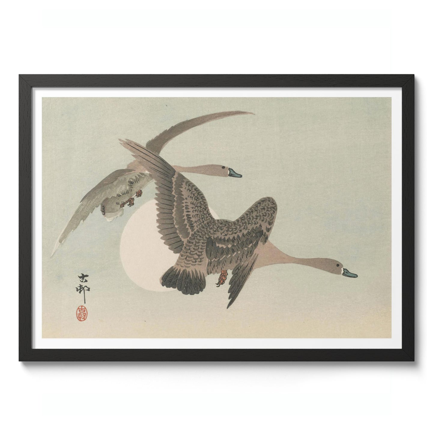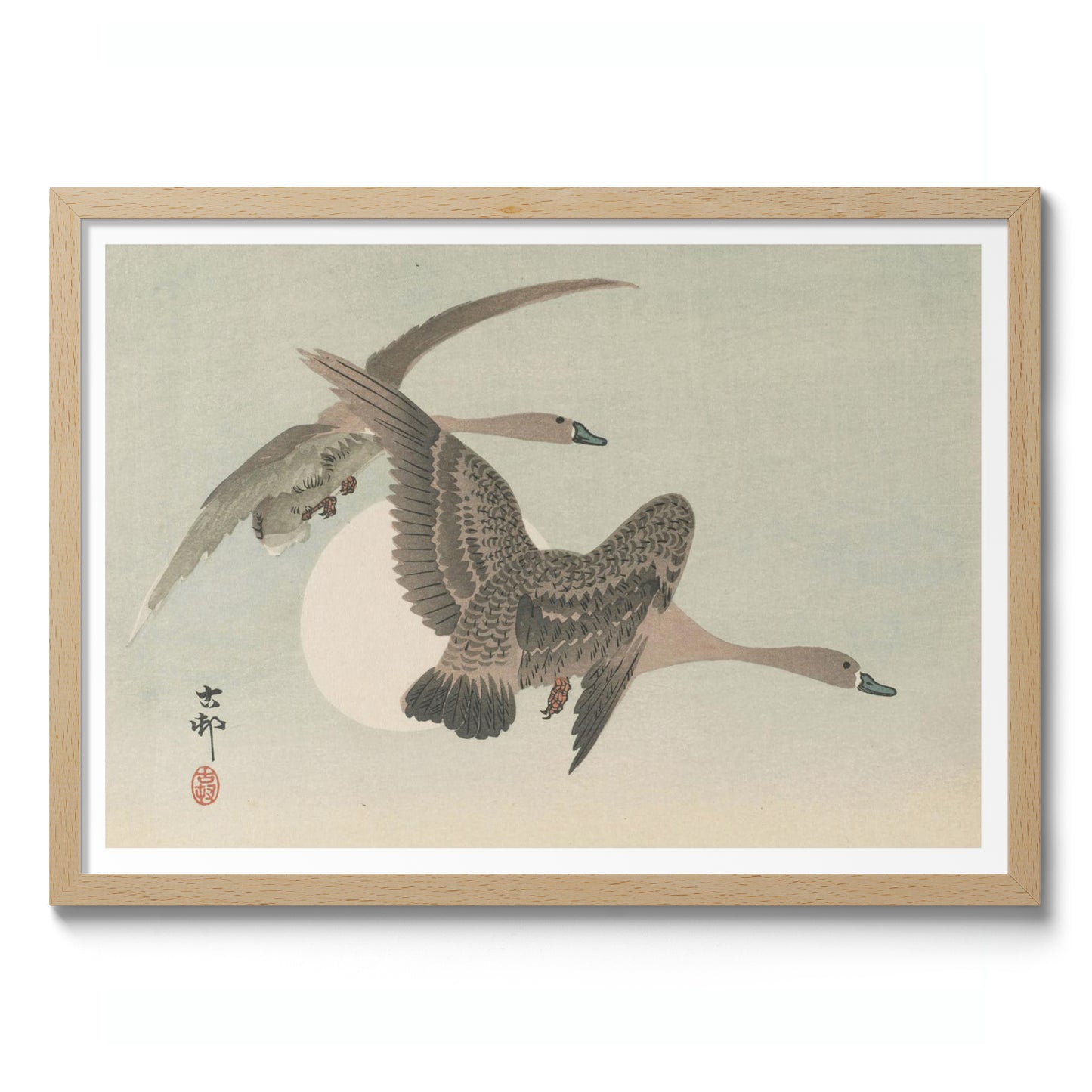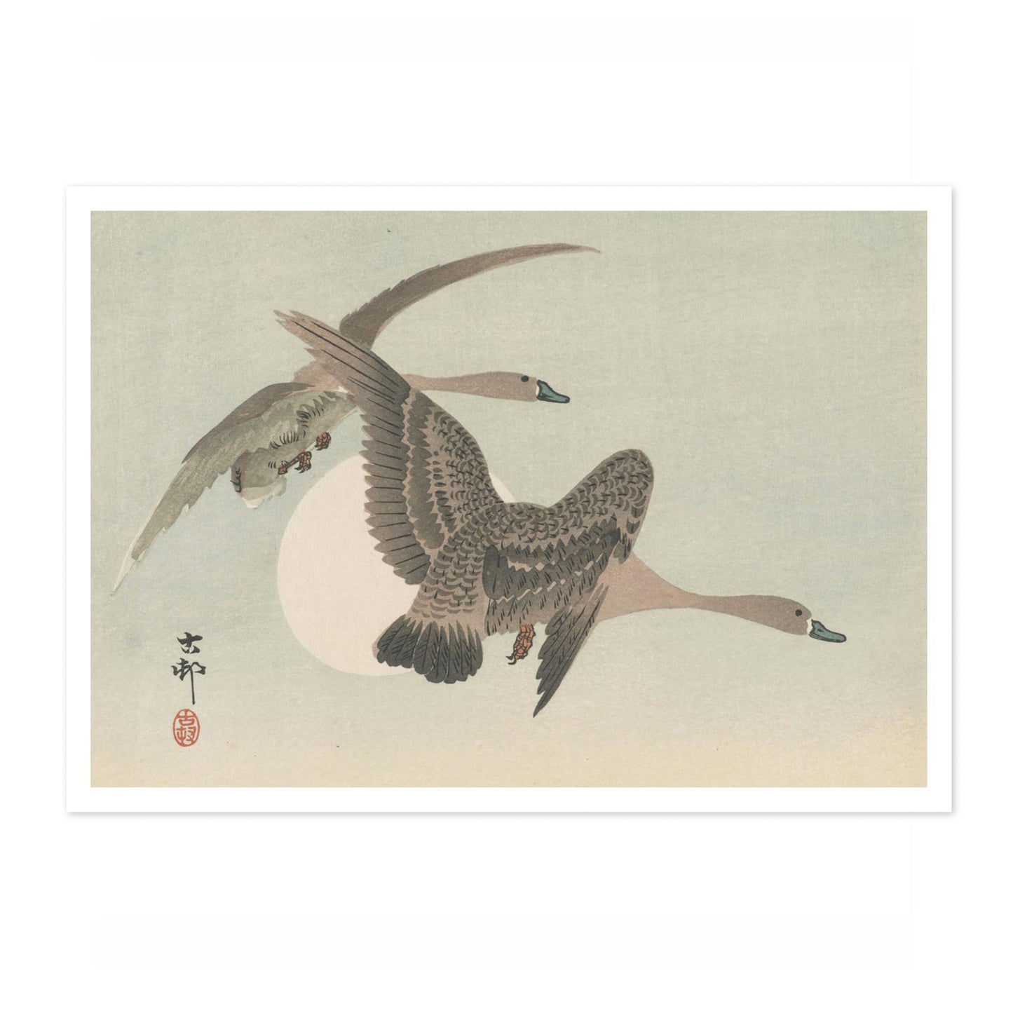This poster, "Two Geese in Flight and Full Moon" by Ohara Koson, captures the serene beauty of two geese gracefully soaring against a pale sky, with a luminous full moon as their backdrop. Rendered in traditional Japanese woodblock style, the artwork showcases delicate textures and muted tones of grey, beige, and brown, highlighting the elegance of natural flight.