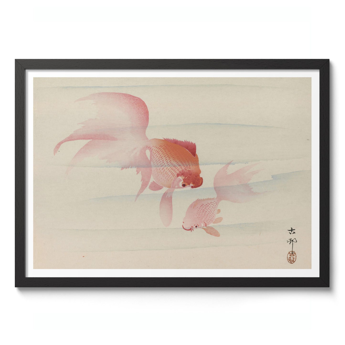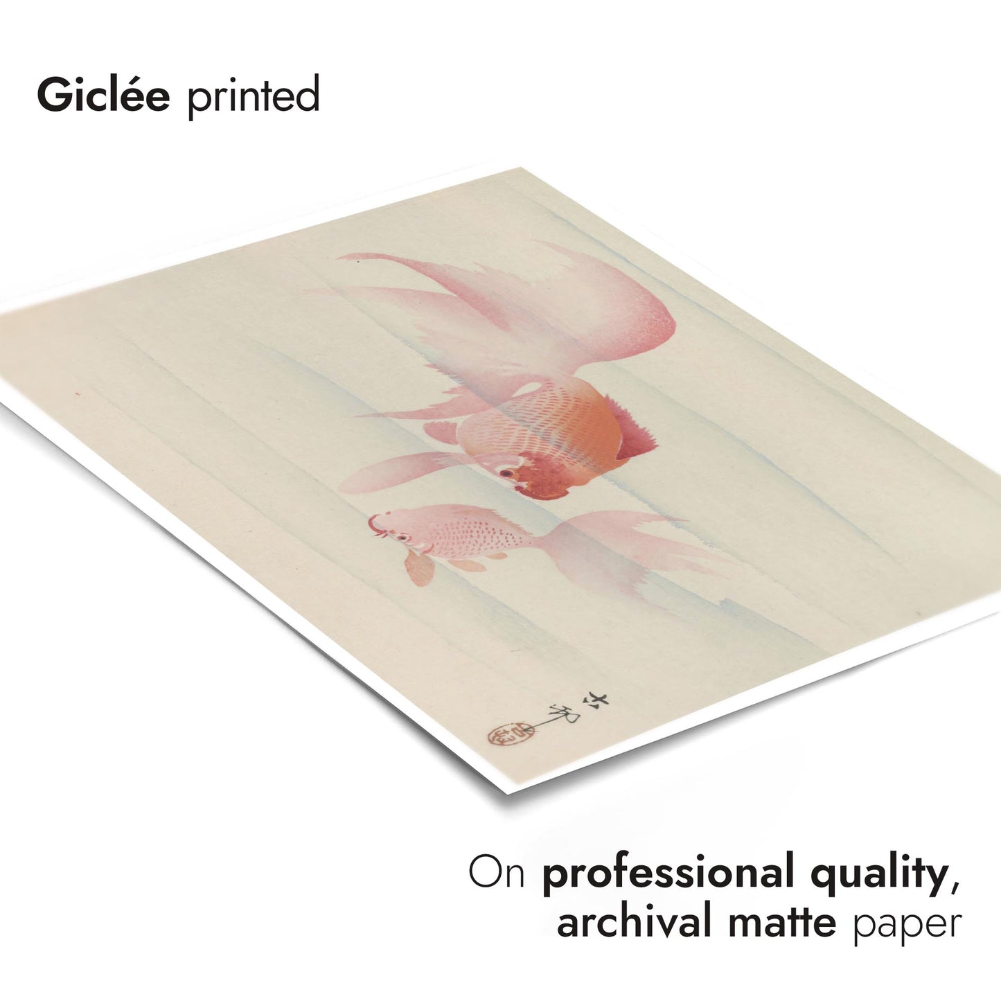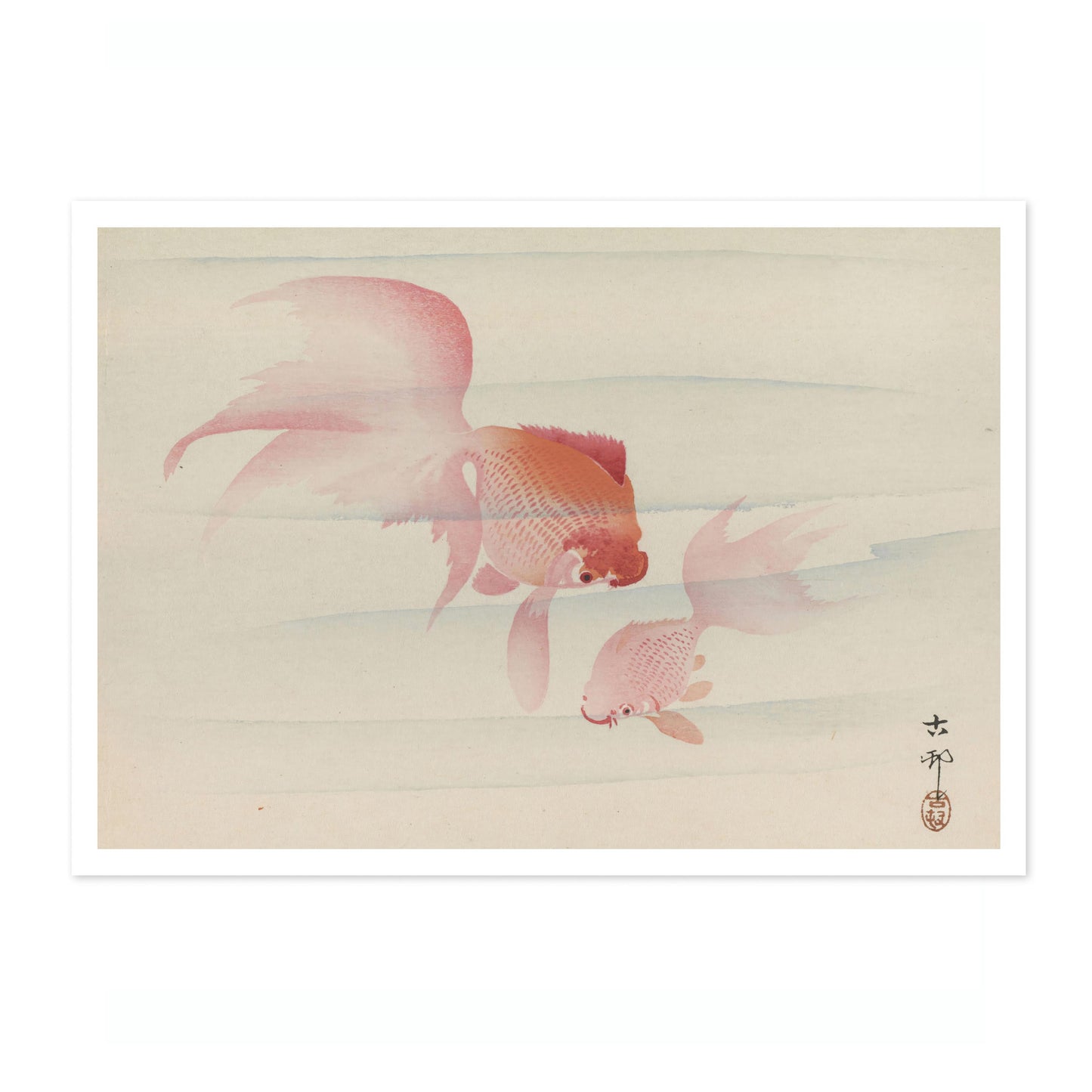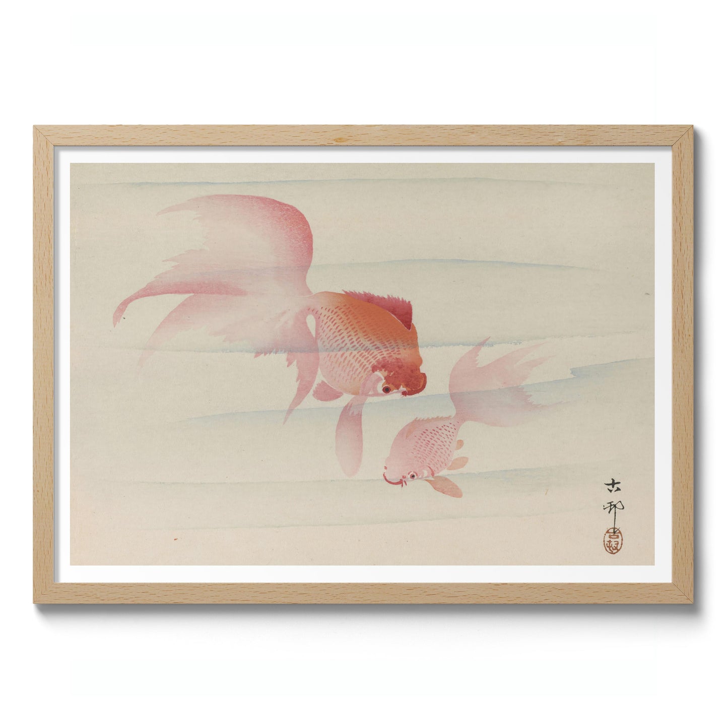 This "Two Goldfish" poster by Ohara Koson captures the delicate grace of traditional Japanese art. Featuring two gently swimming goldfish with flowing fins, the painting creates a sense of serene movement against a minimalist background. Perfect for adding a tranquil touch to any space, this landscape art print highlights the intricate beauty of aquatic life.