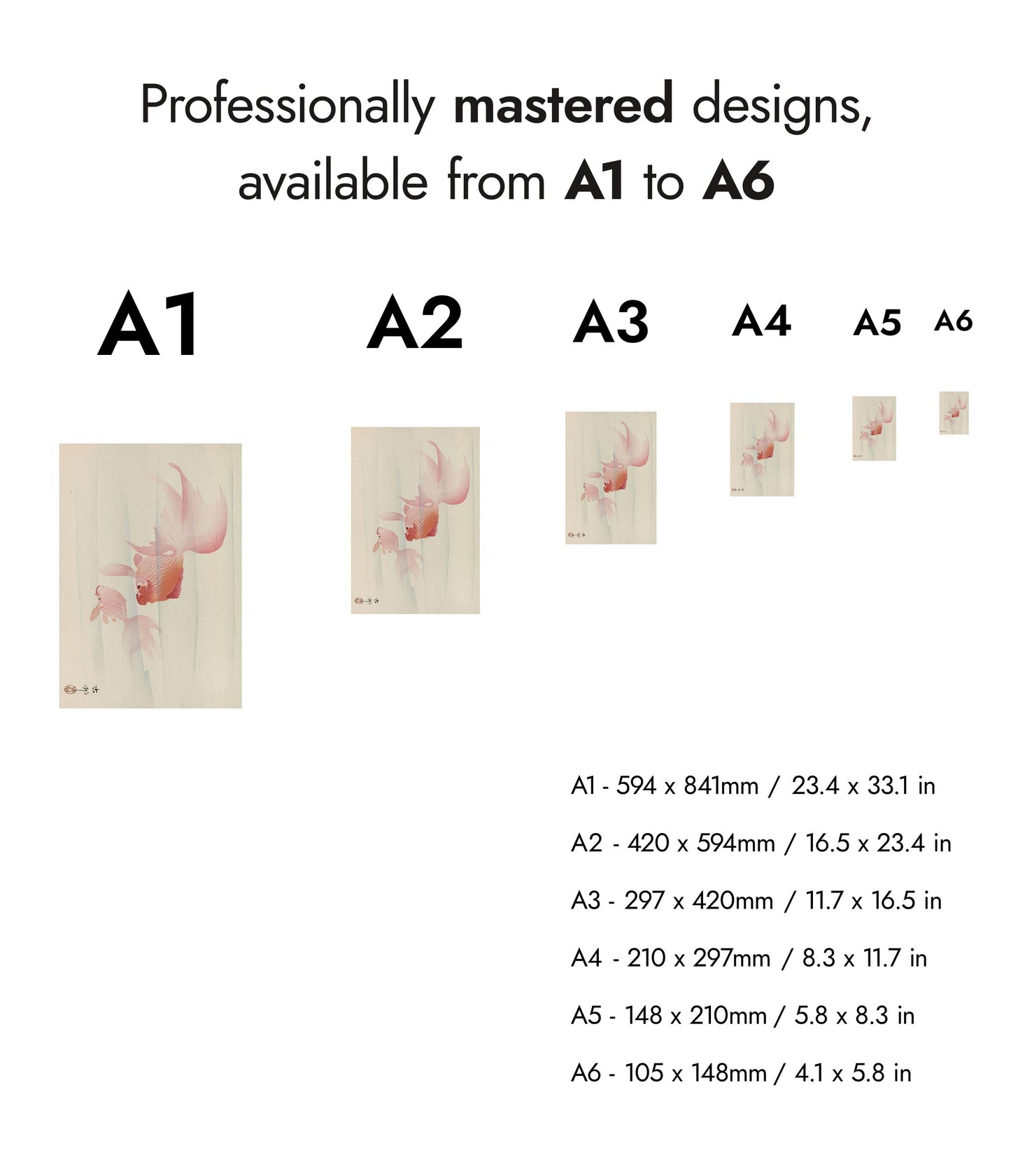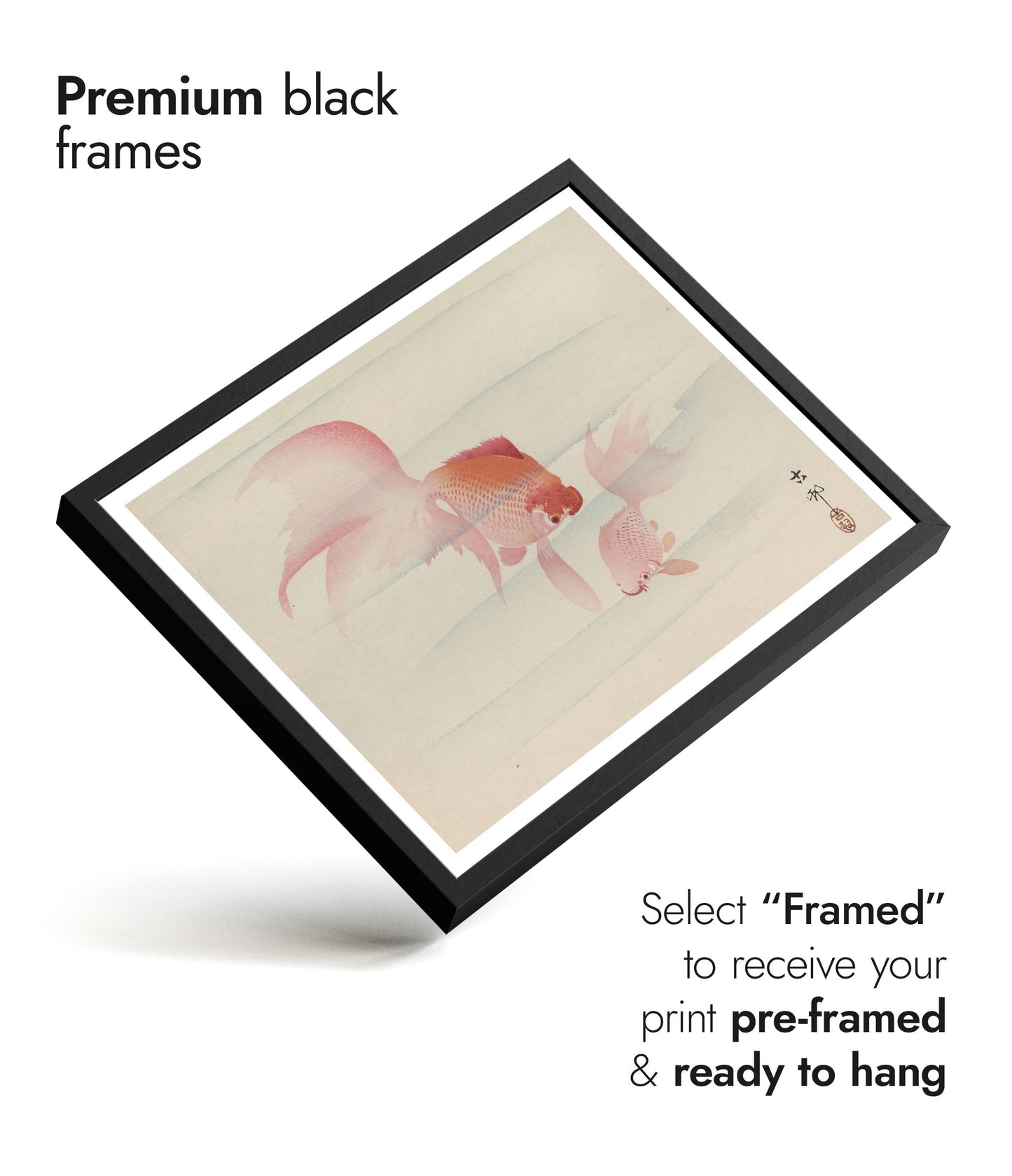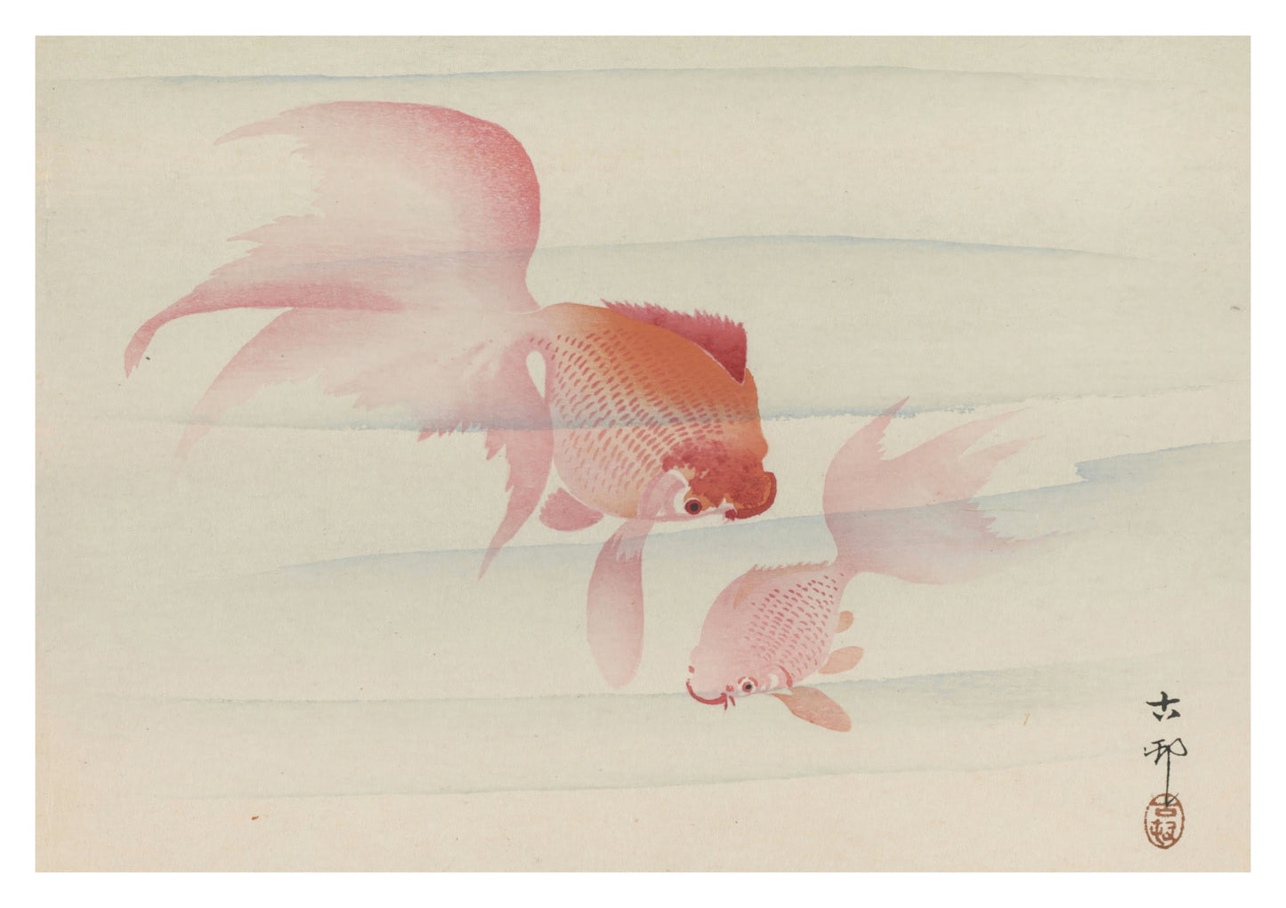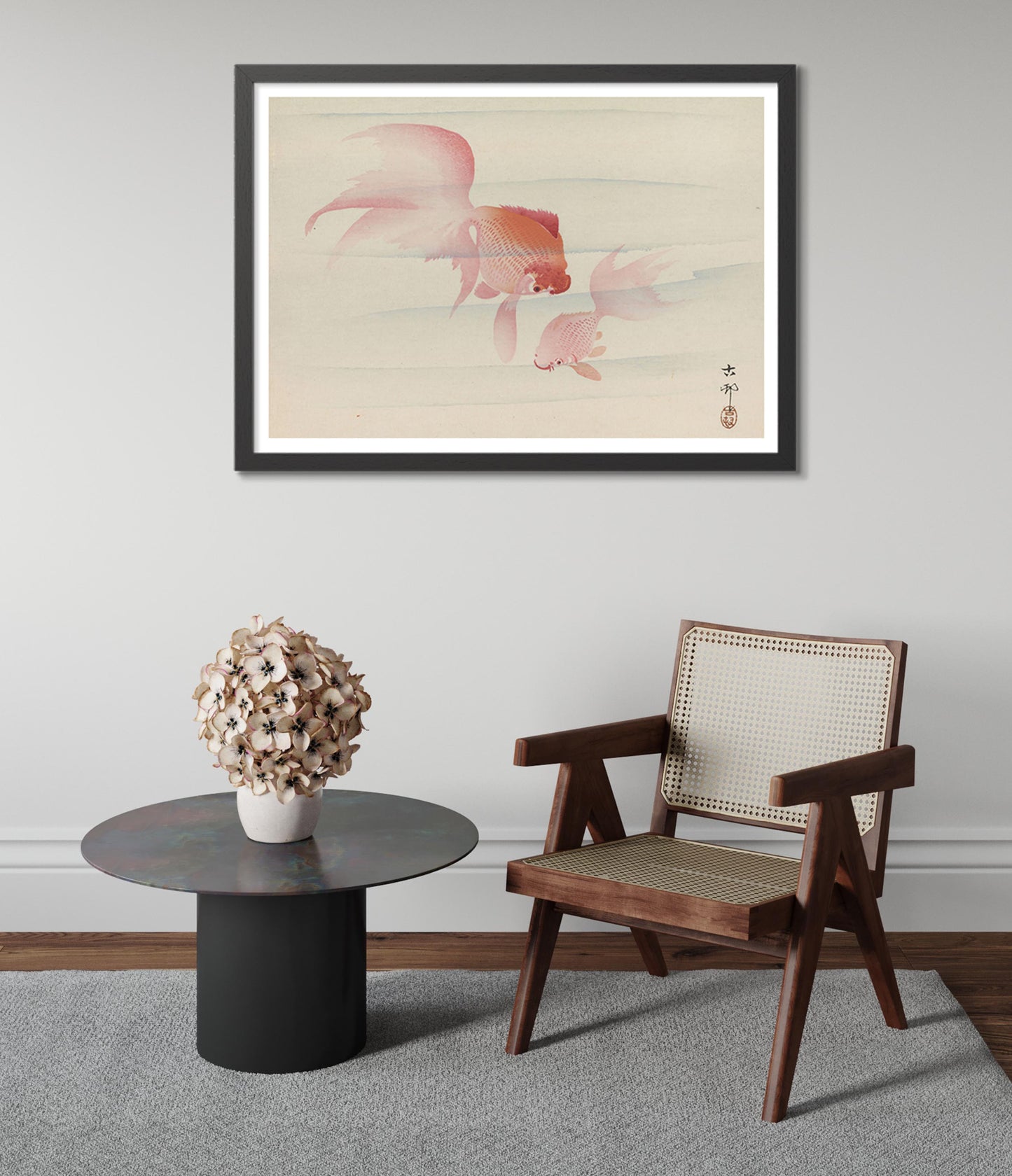 This "Two Goldfish" poster by Ohara Koson captures the delicate grace of traditional Japanese art. Featuring two gently swimming goldfish with flowing fins, the painting creates a sense of serene movement against a minimalist background. Perfect for adding a tranquil touch to any space, this landscape art print highlights the intricate beauty of aquatic life.