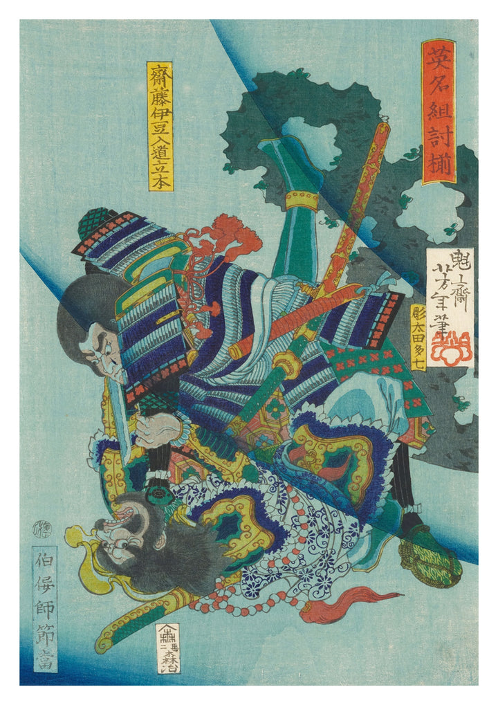 This poster features the dynamic woodblock illustration "Two Men Fighting Underwater" by Tsukioka Yoshitoshi. Depicting a vivid underwater battle between two samurais, the traditional Ukiyo-E style captures the intense motion and detailed armor of the warriors. The composition showcases Yoshitoshi's mastery in portraying action and emotion, making it a striking addition to any collection focusing on Japanese art and samurai themes.