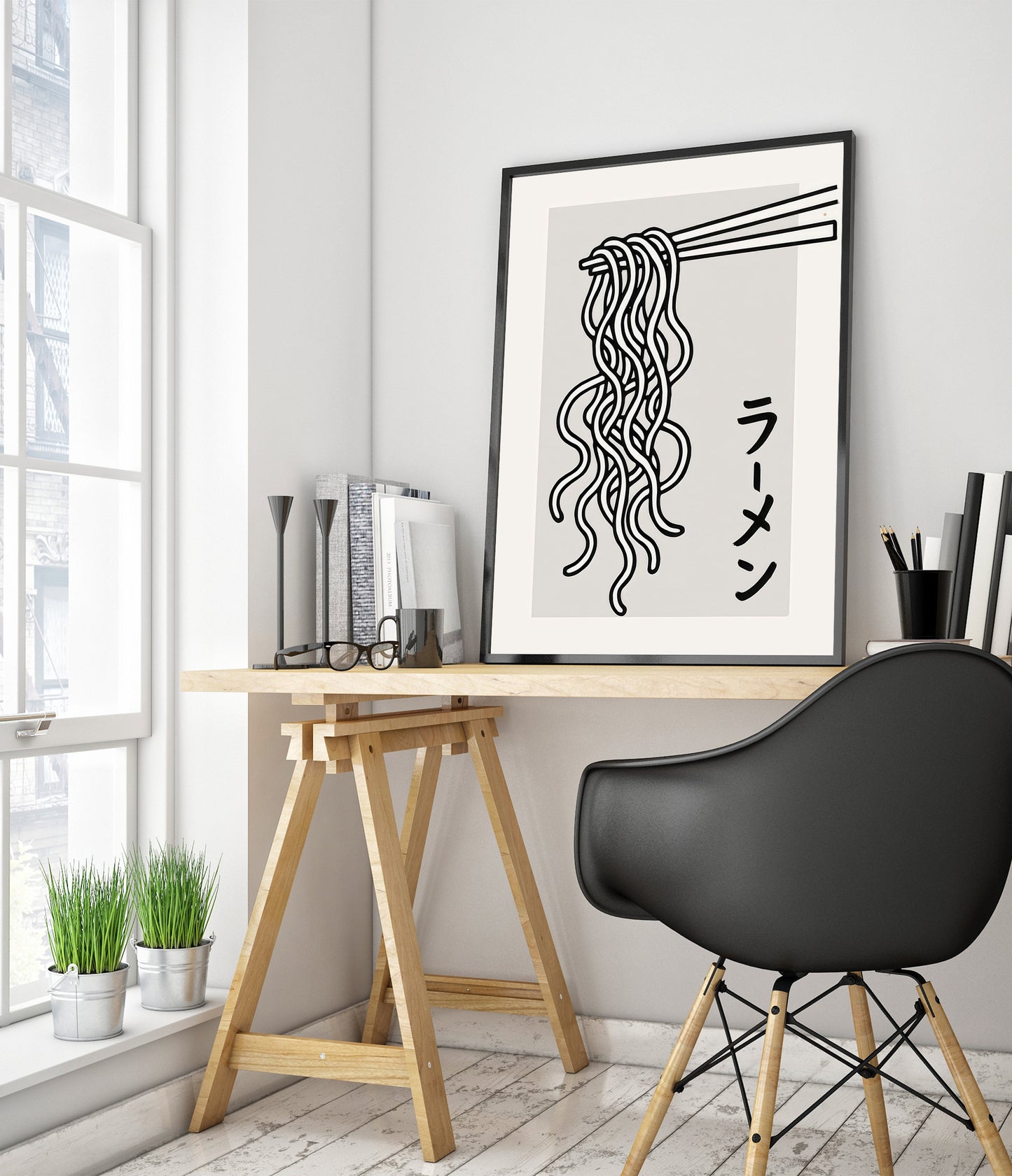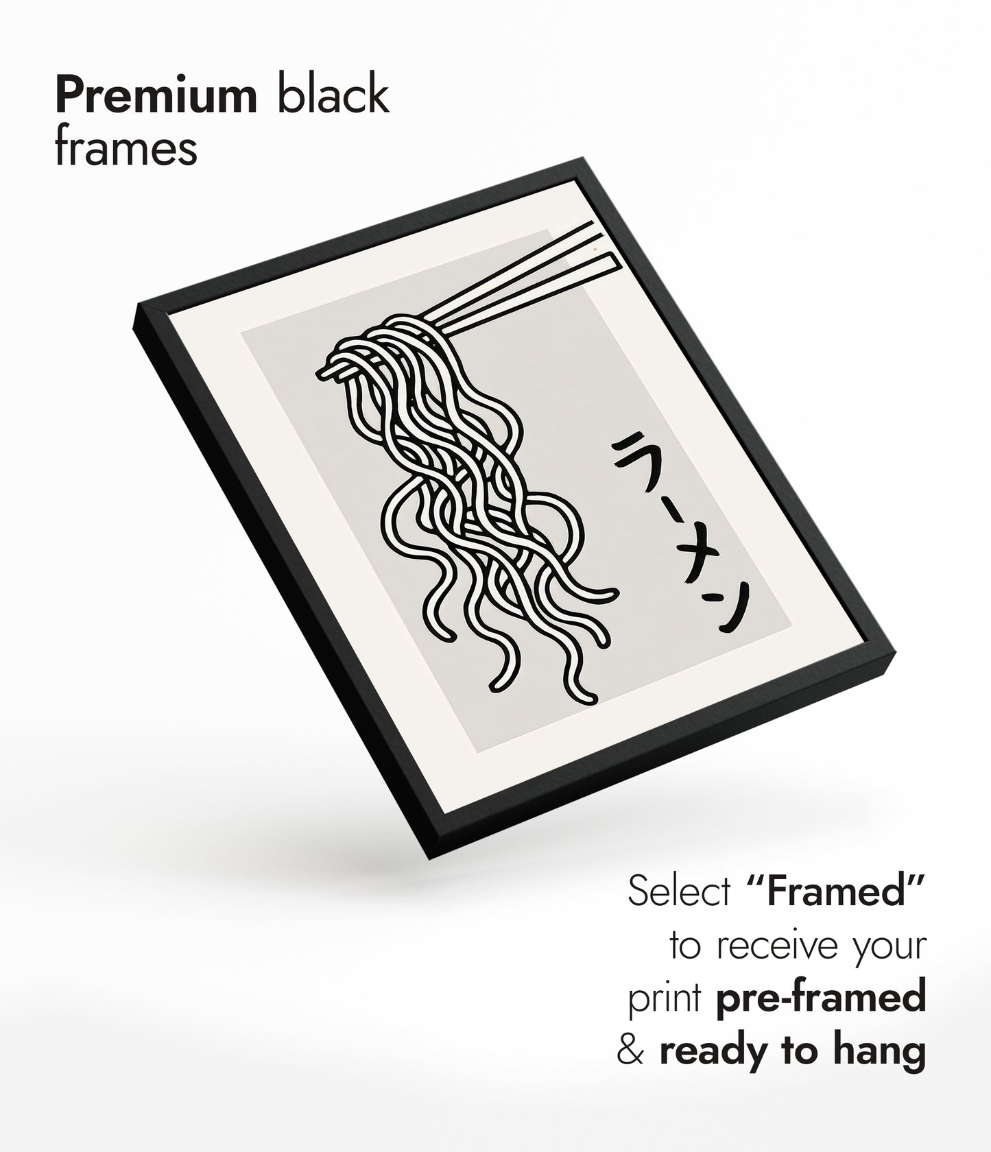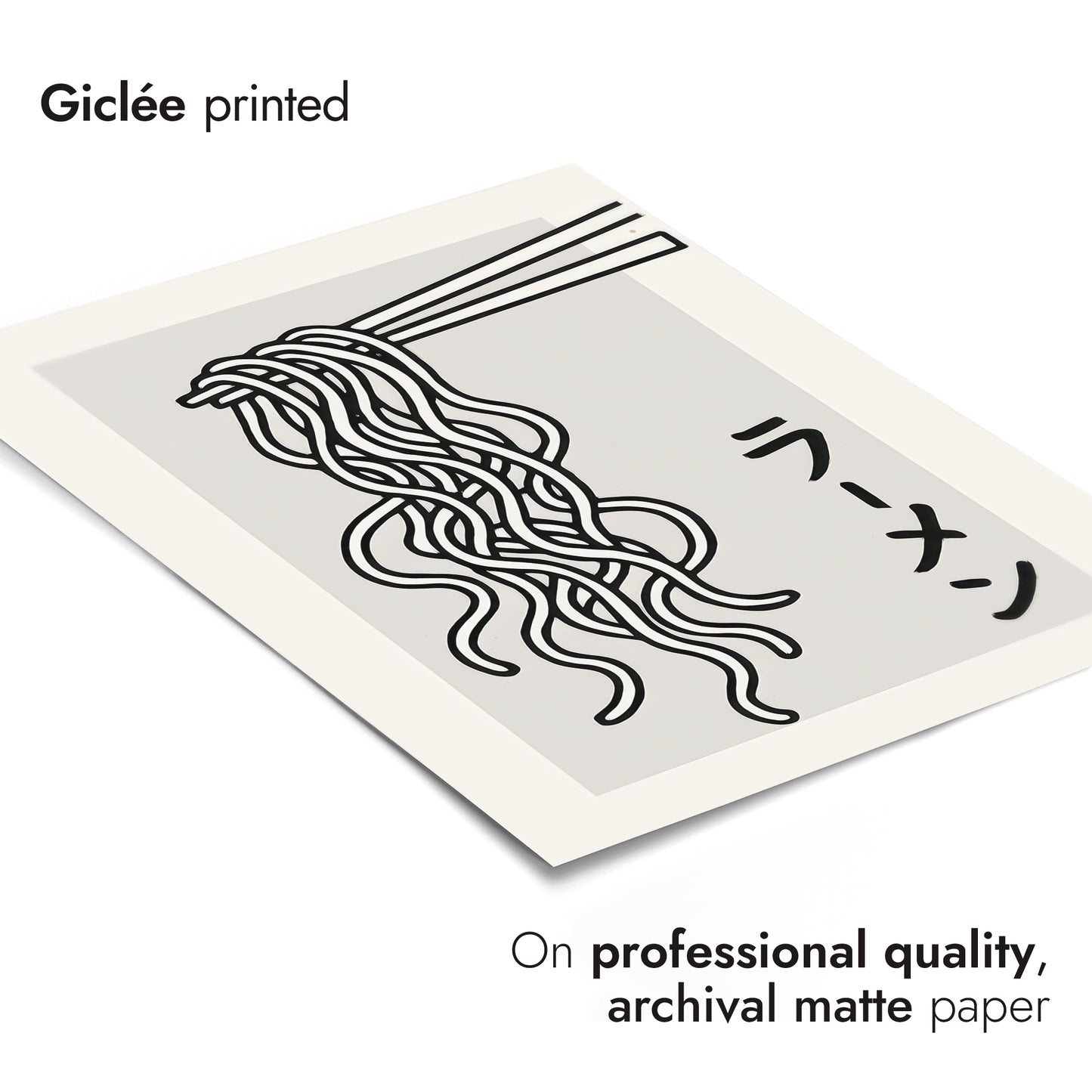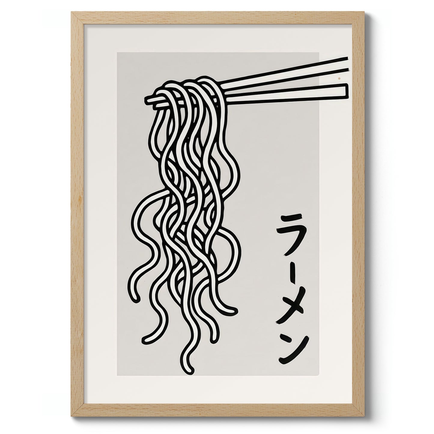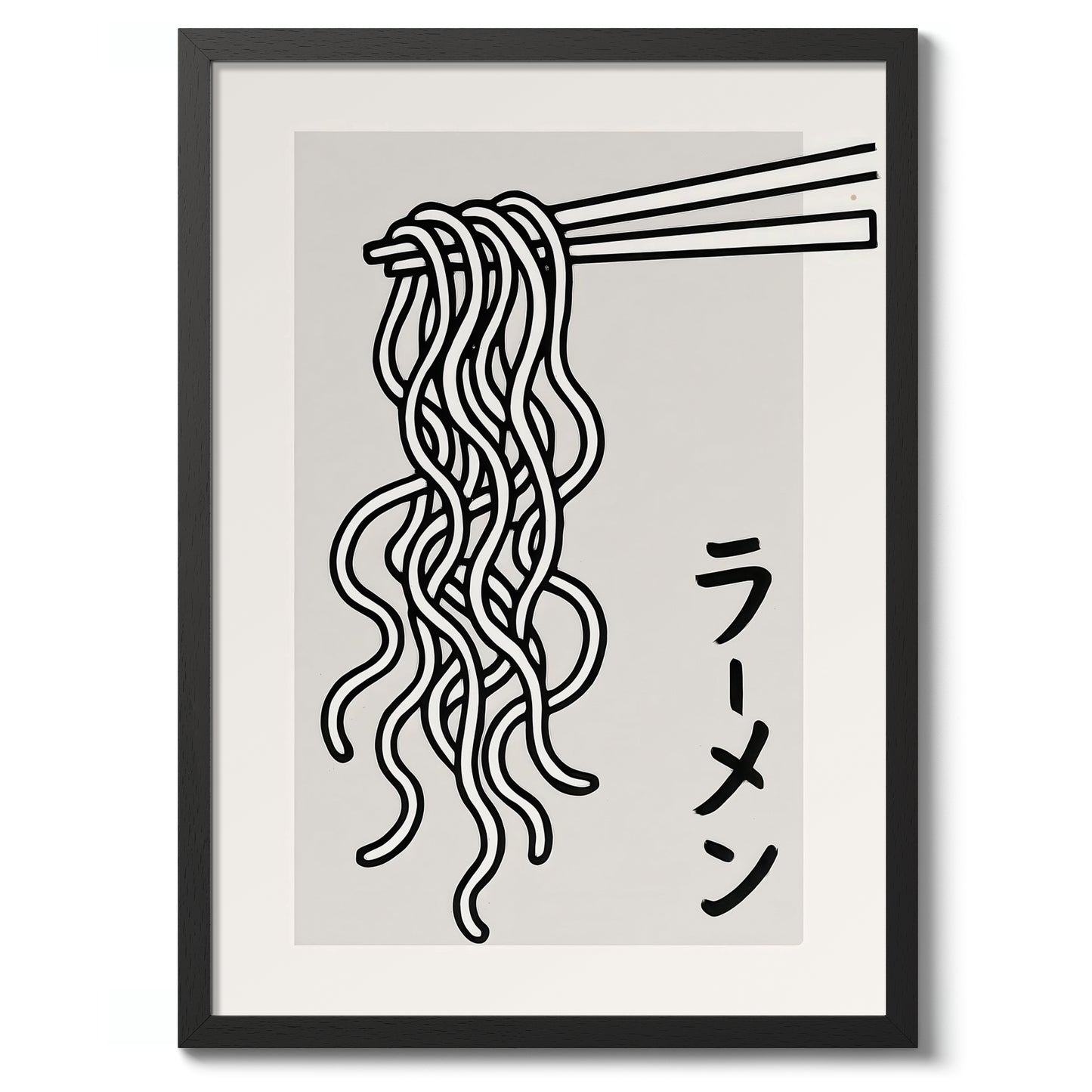 This modern graphic print features a minimalist depiction of udon noodles delicately suspended by chopsticks, highlighting Japanese cuisine's elegance. Rendered in black and white, the clean lines enhance its contemporary style. The Japanese text for "ramen" adds authenticity, complementing this monochromatic poster's appeal. Perfect for food enthusiasts or Japanese culture admirers, this artwork brings a stylish touch to any space.