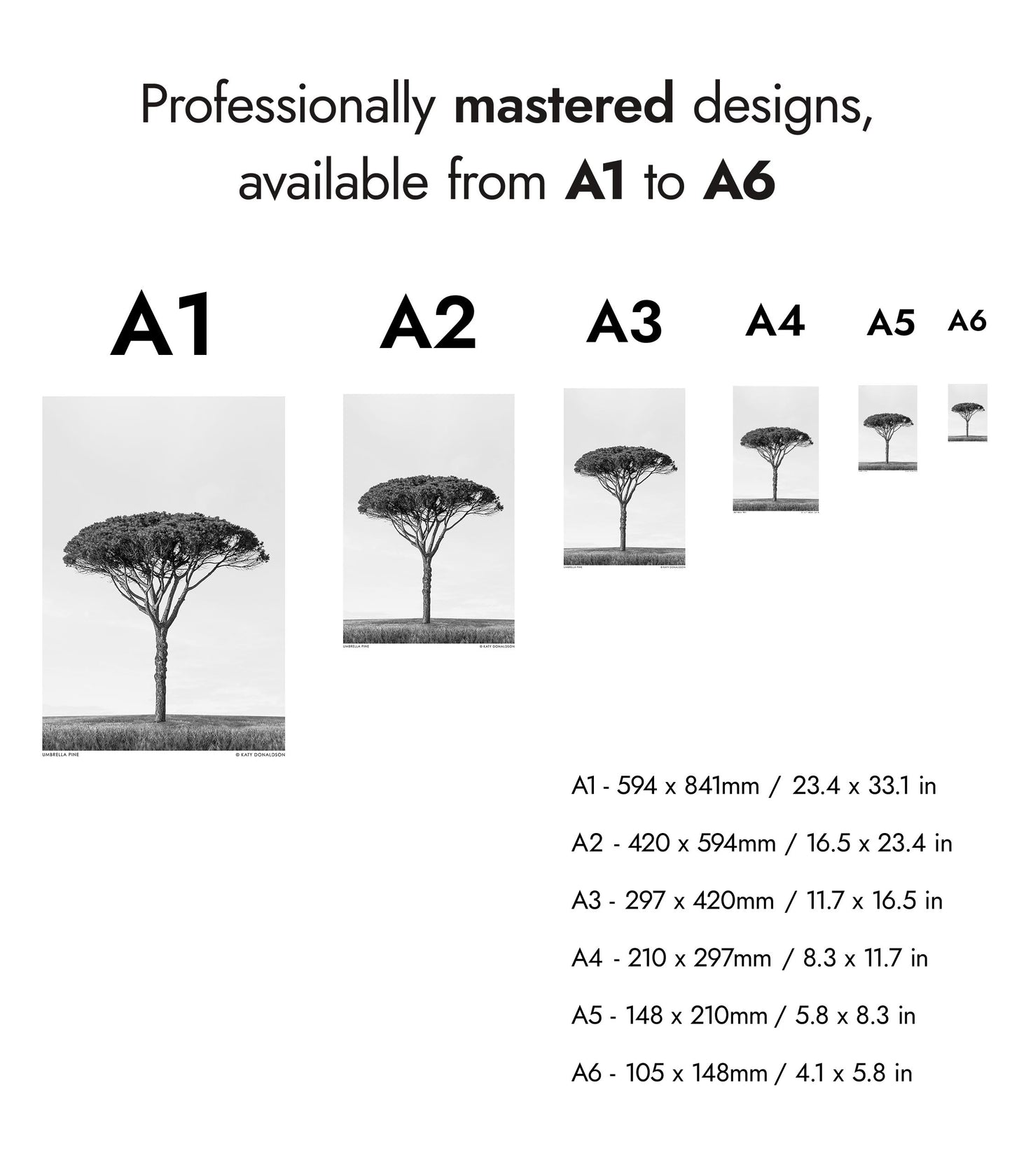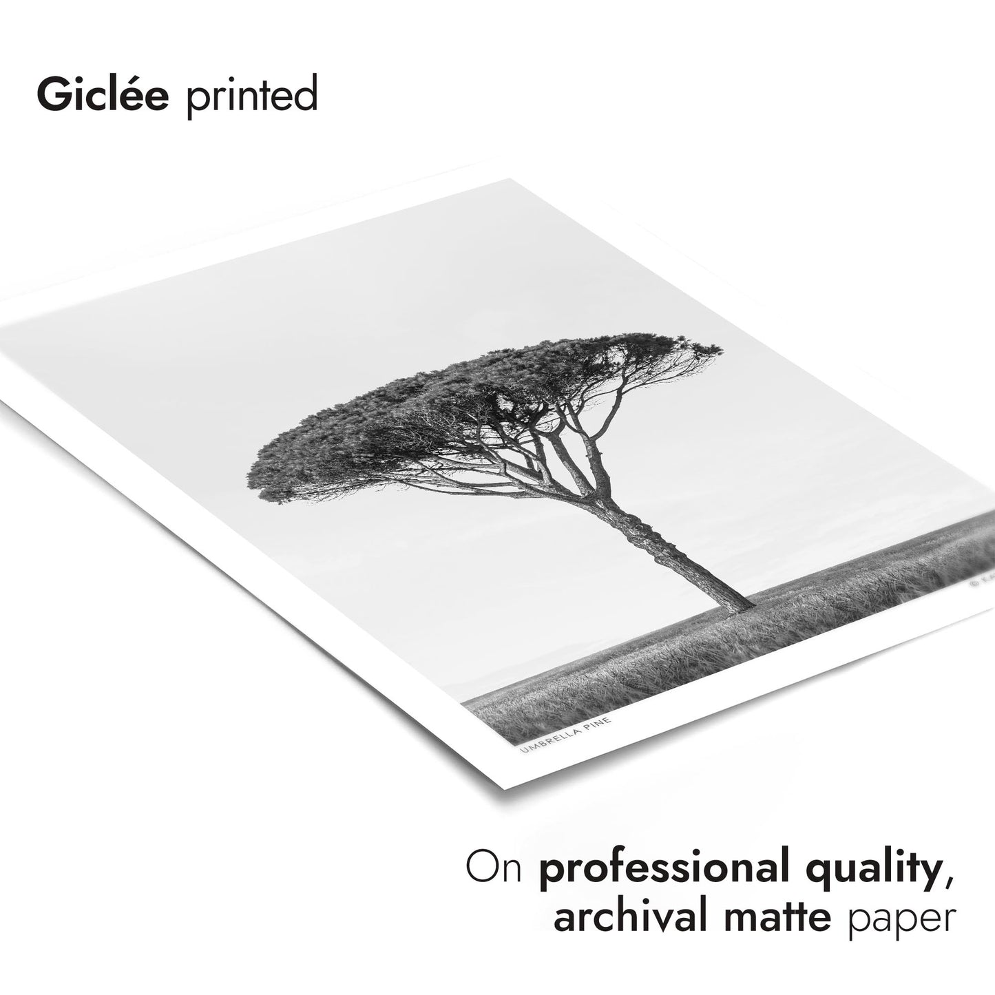 8 colour giclée print process on high-quality 230gsm archival matte paper. All our paper is FSC Certified and prints come with a lifetime fade-resistance guarantee.
