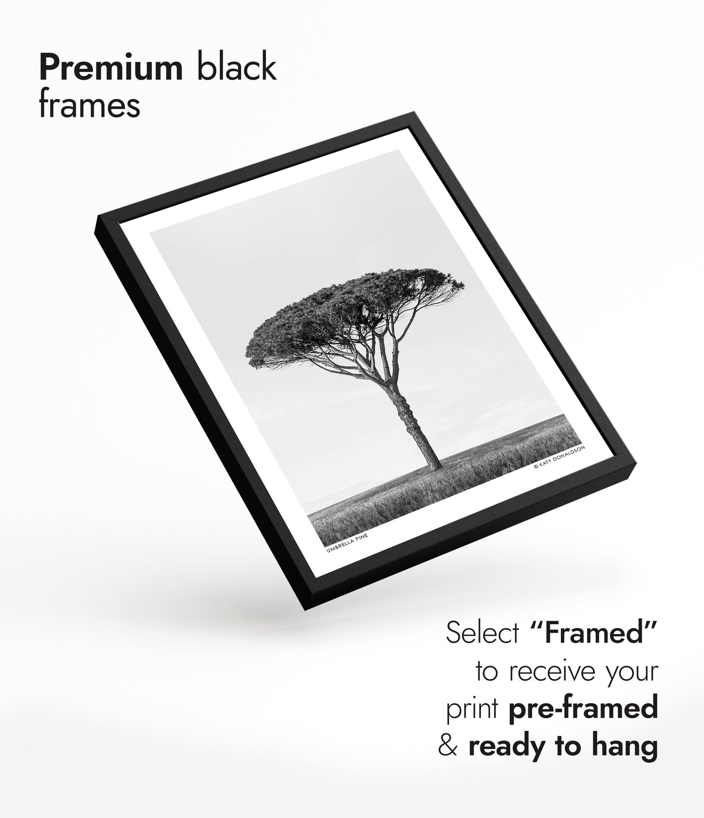 Solid wood frames available in black stained or natural finishes, with UV resistant acrylic glass. Framed orders arrive pre-installed with your choice of print, ready to hang. Available in all print sizes.