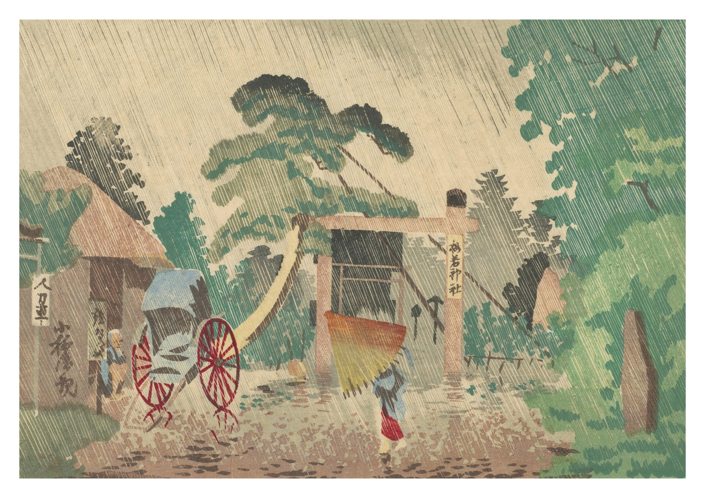 This art print, "Umewaka Shrine" by Kobayashi Kiyochika, captures the serene scene of a traditional Japanese shrine during a rainstorm. The detailed woodblock illustration features a quaint village setting with lush trees and a shaded temple entrance, highlighted by a lone figure and a colourful rickshaw. Ideal for lovers of Ukiyo-E art and historical Japanese landscapes.