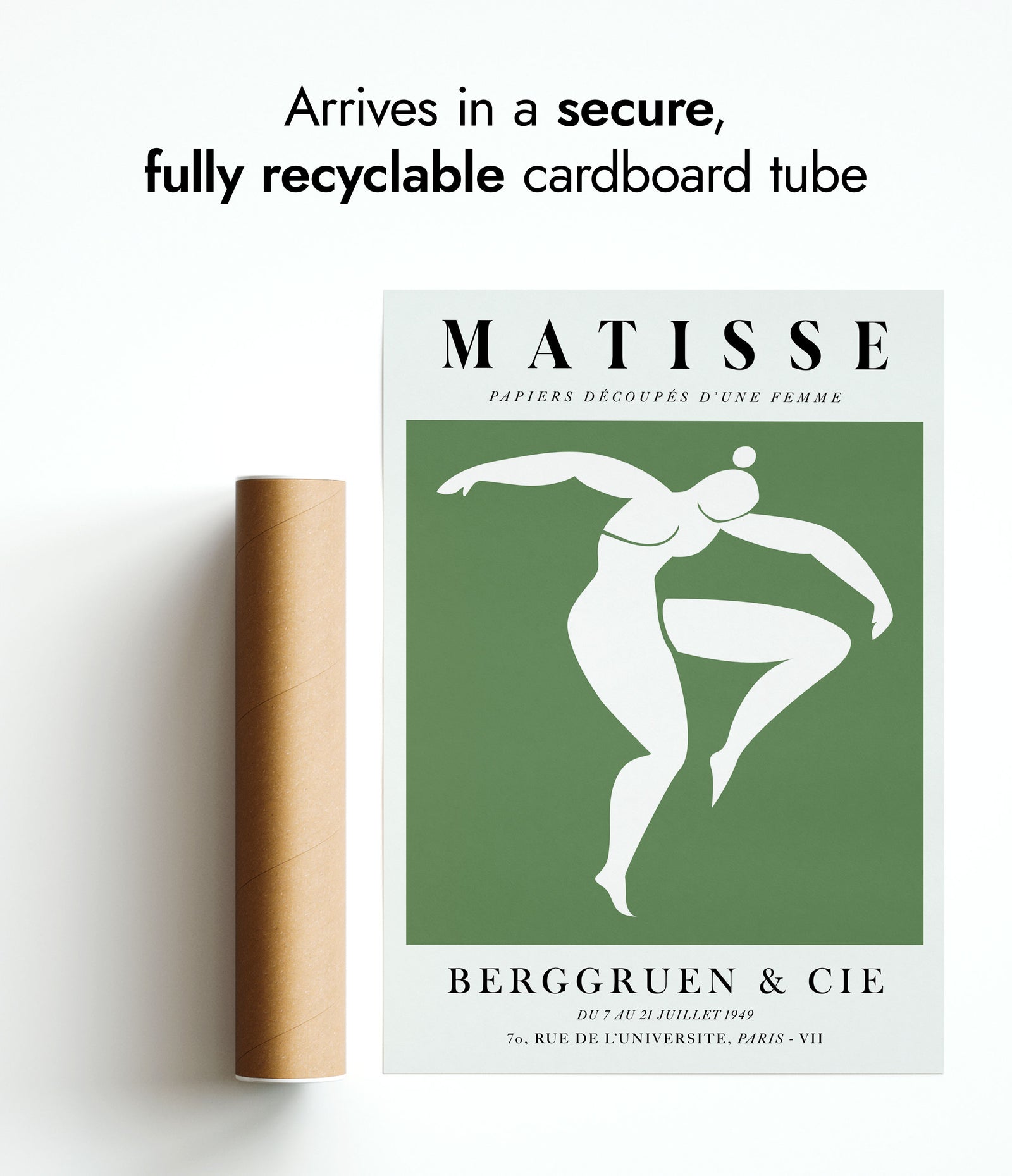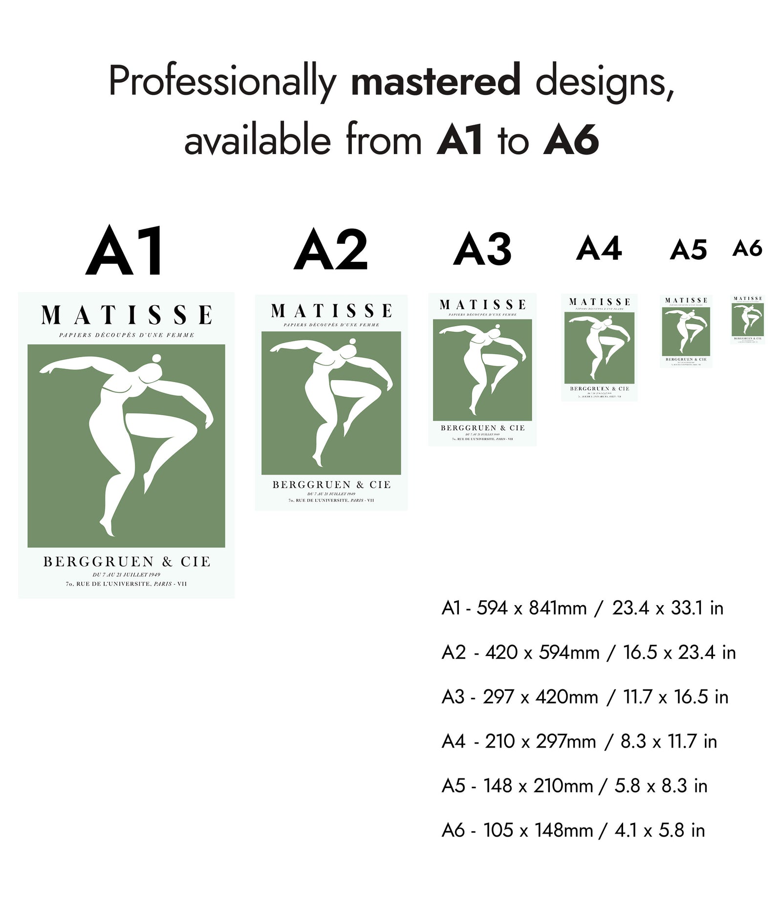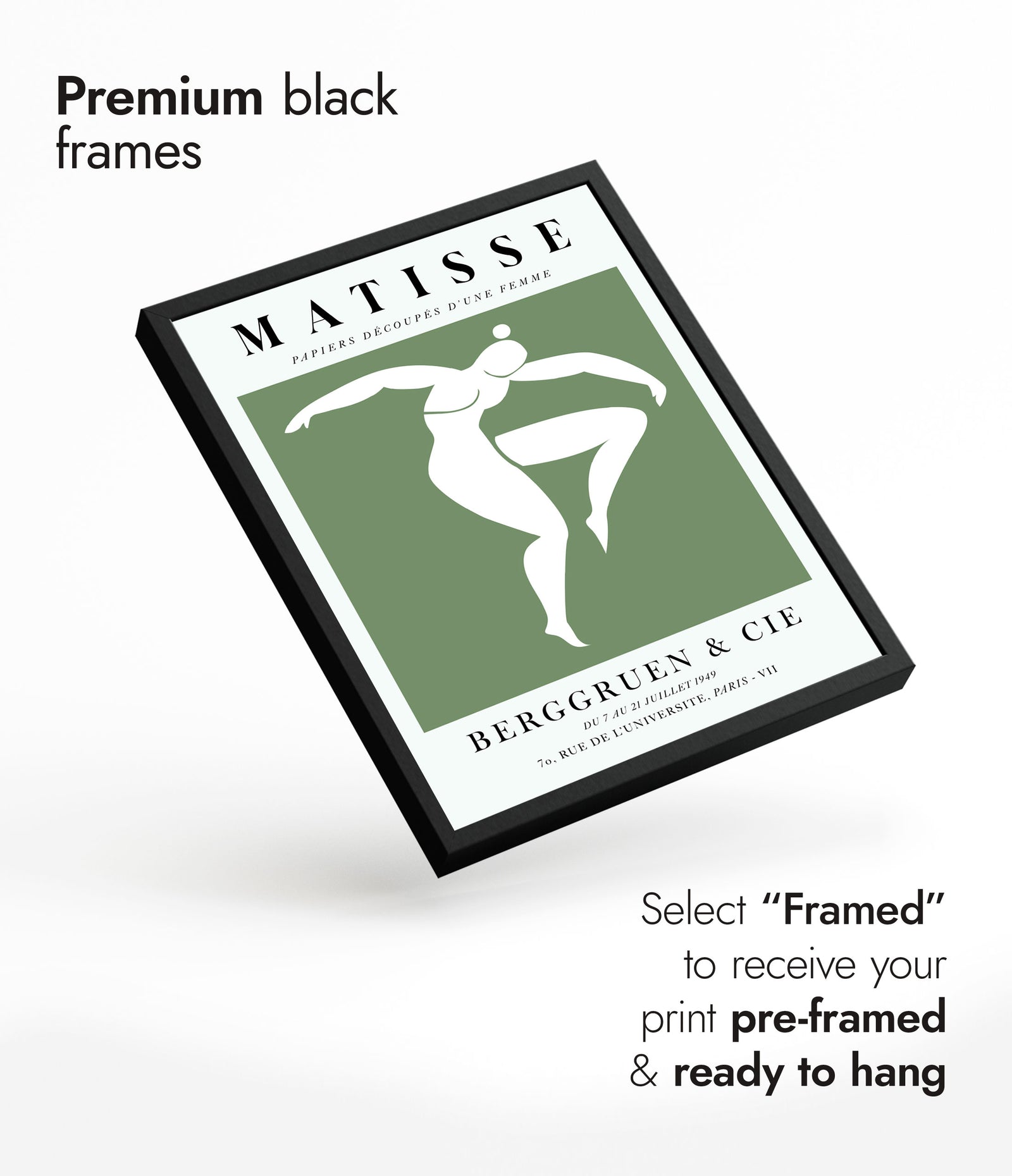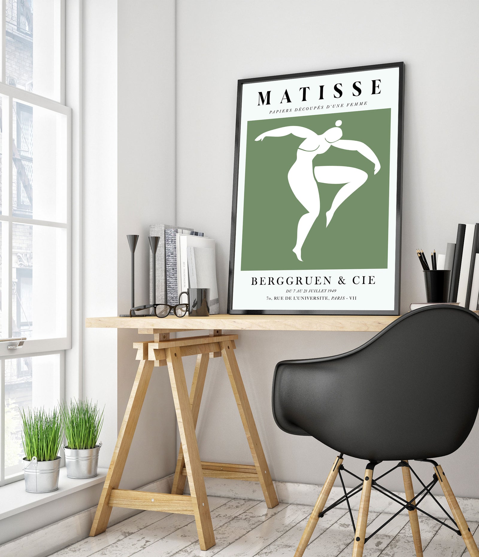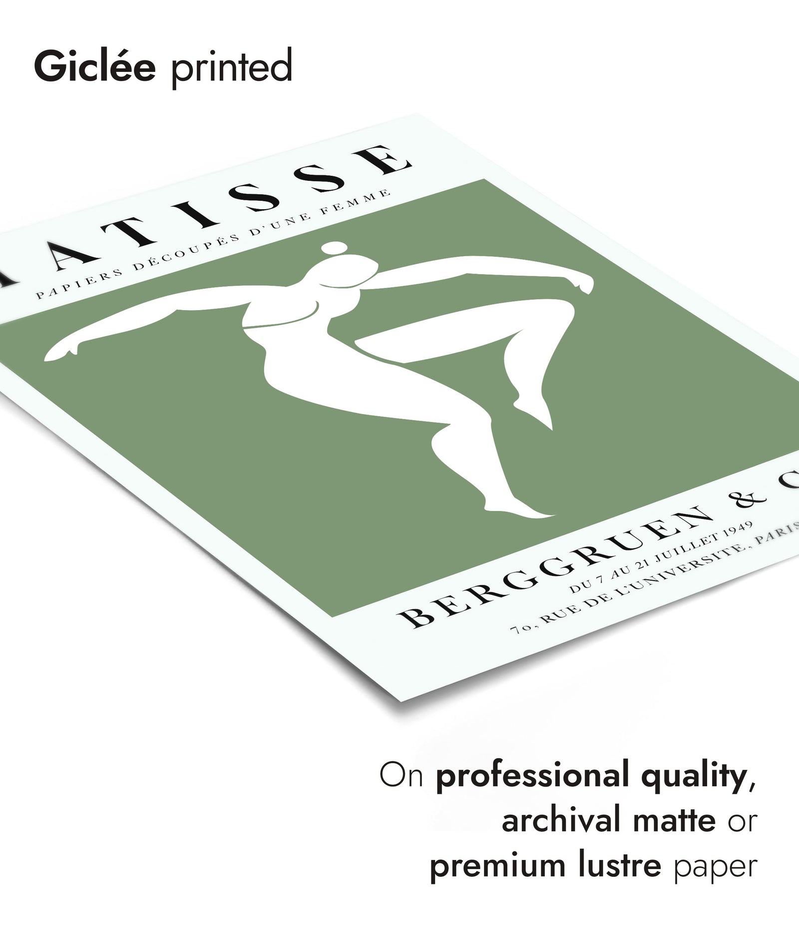 This "Une Femme Verte, Dansante" poster by Henri Matisse captures the elegance of dance through his iconic cutout style. Showcasing a nude woman in fluid motion against a muted green background, this graphic exhibition piece reflects the essence of Matisse's artistic innovation. Ideal for those appreciating minimalist, yet profound art. Perfect for adding a touch of sophistication to any space.