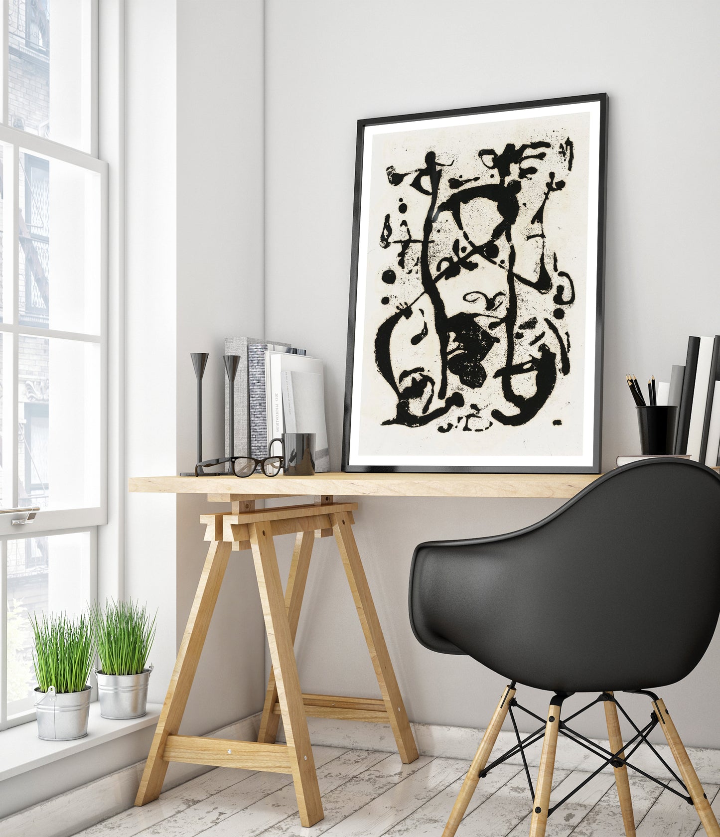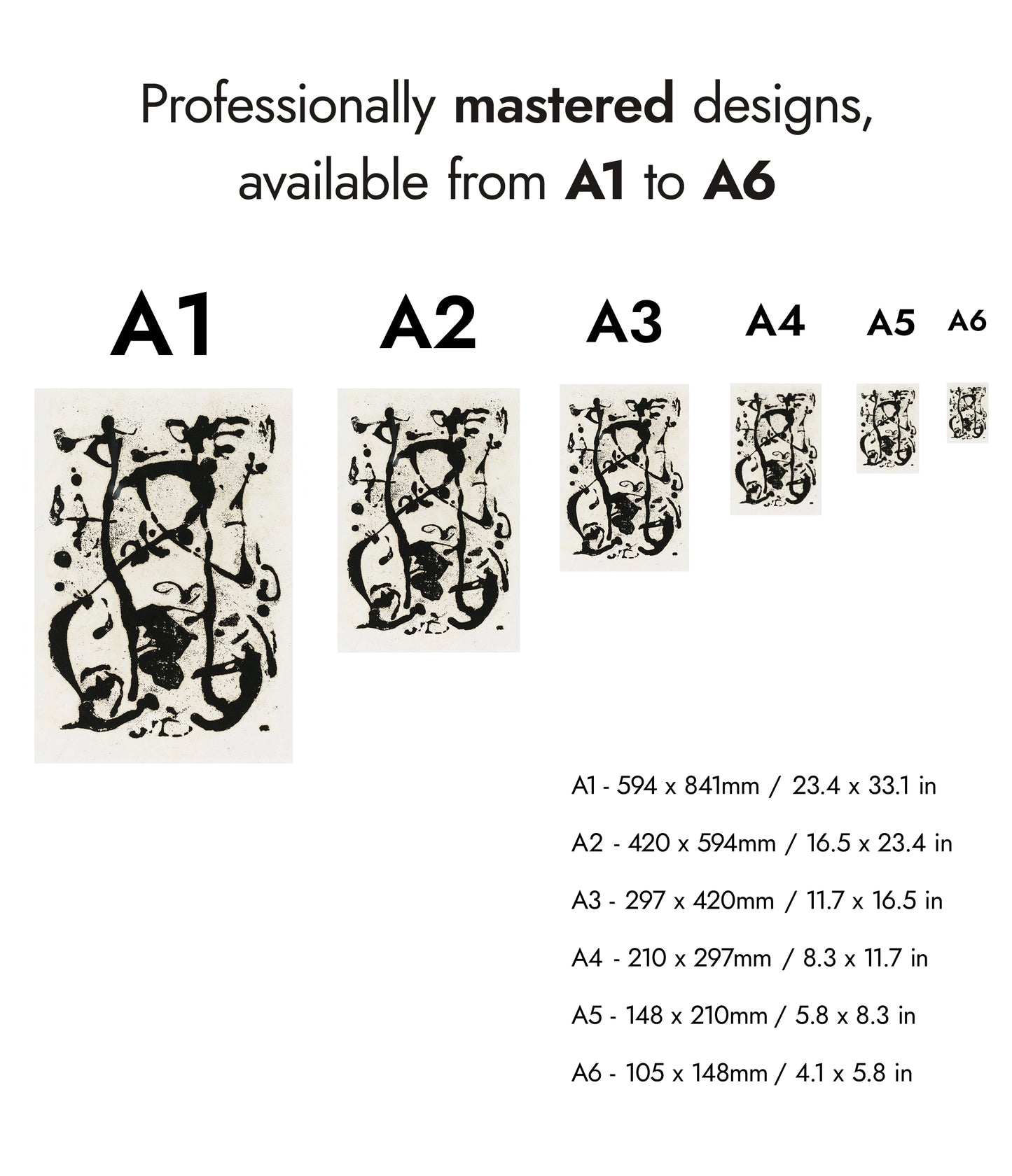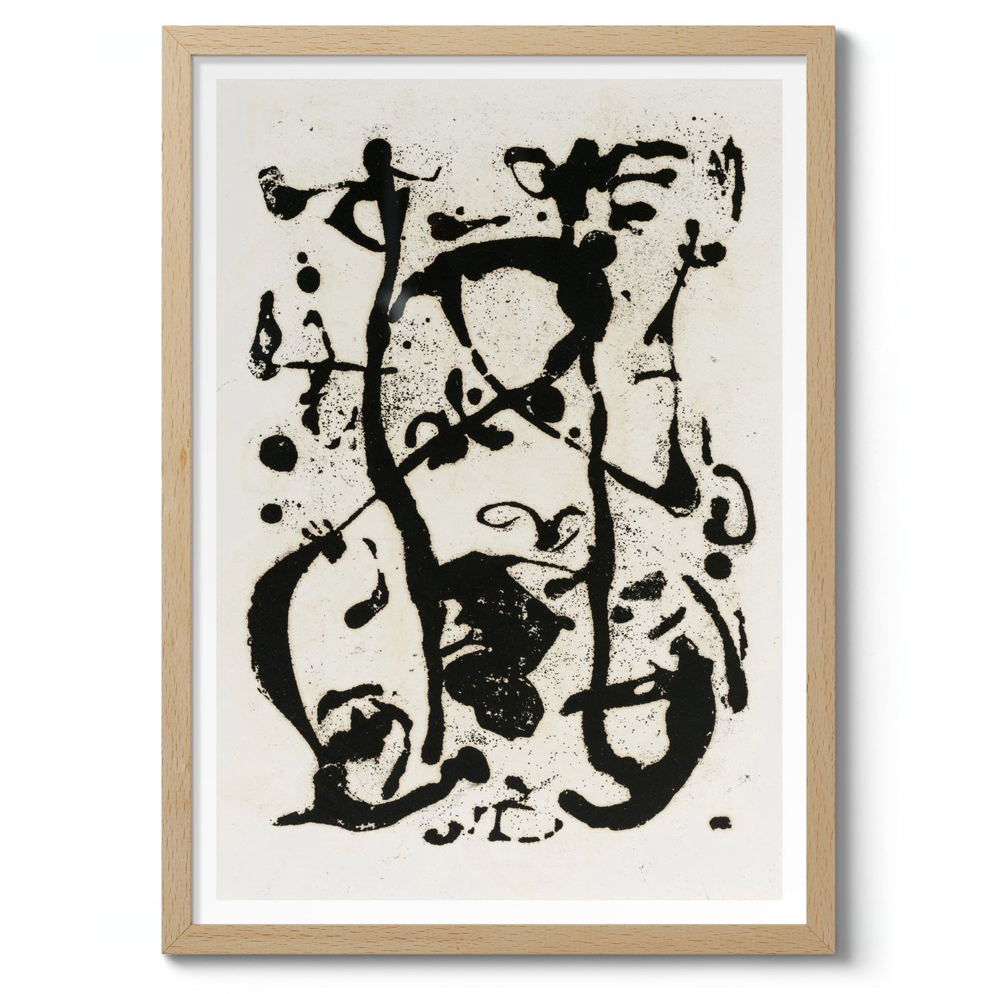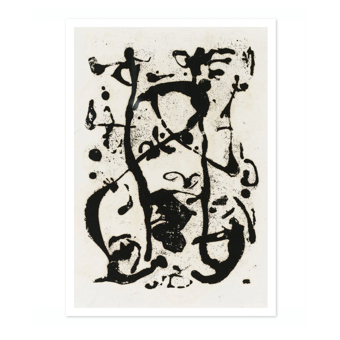 This untitled poster by Jackson Pollock showcases the dynamic energy of 1950s expressionism. Featuring bold black splatters and drips on a white background, the abstract composition captures movement and spontaneity, characteristic of Pollock's iconic style. This black and white abstract art piece is a testament to the power of expression through splatter and drip painting.