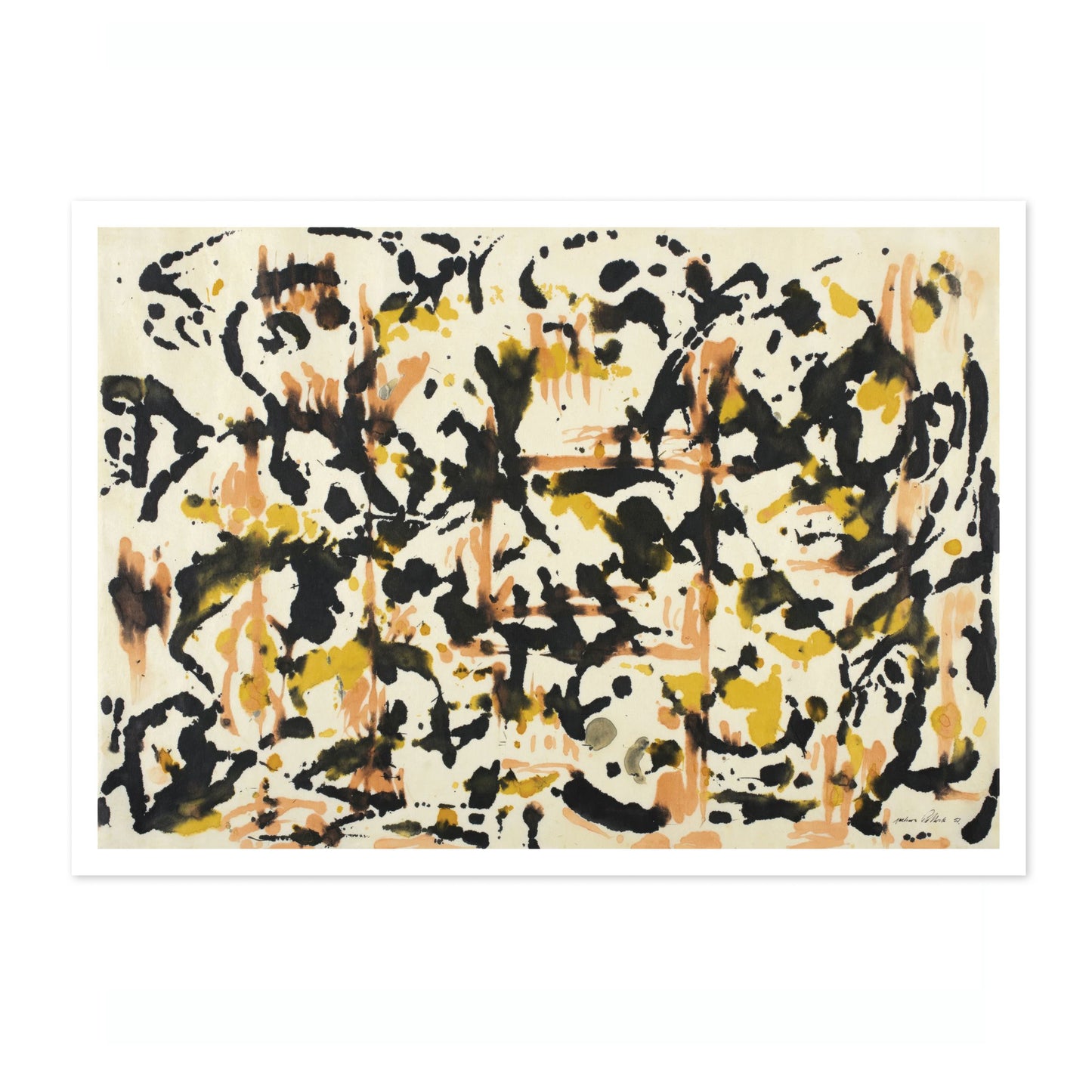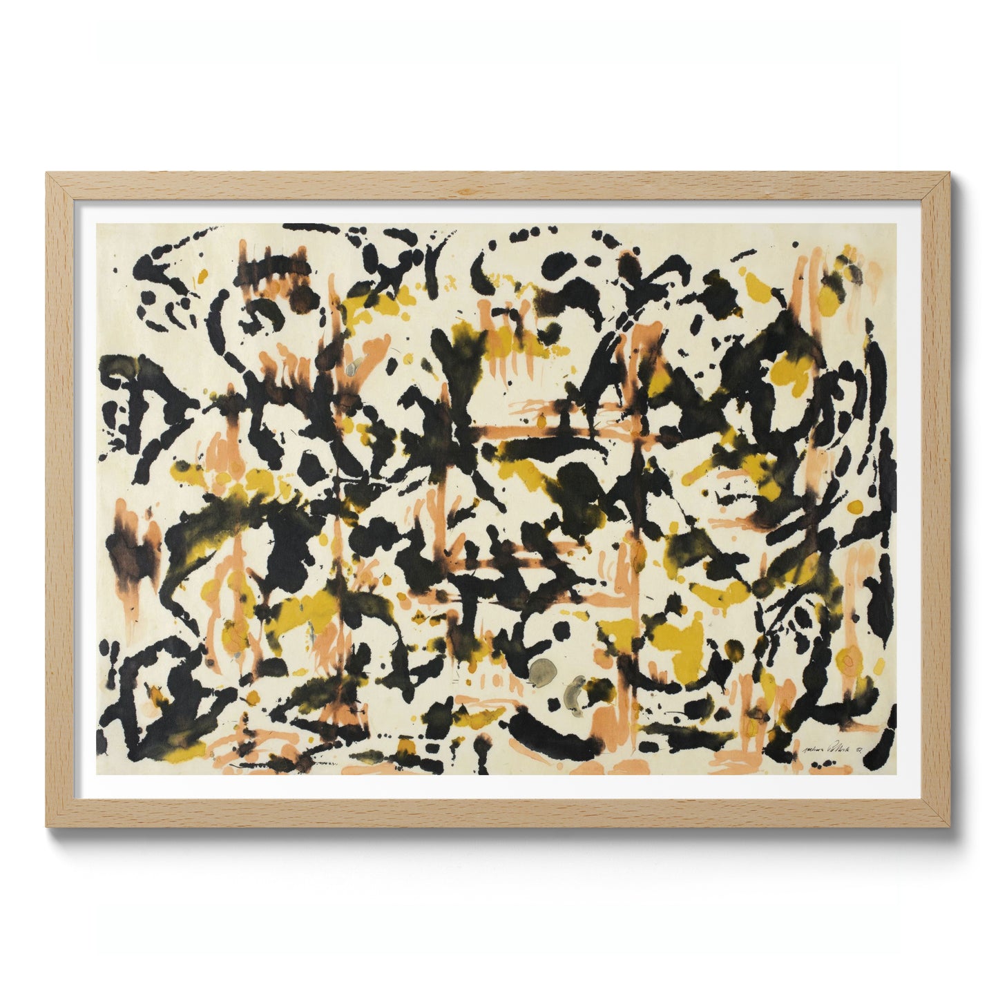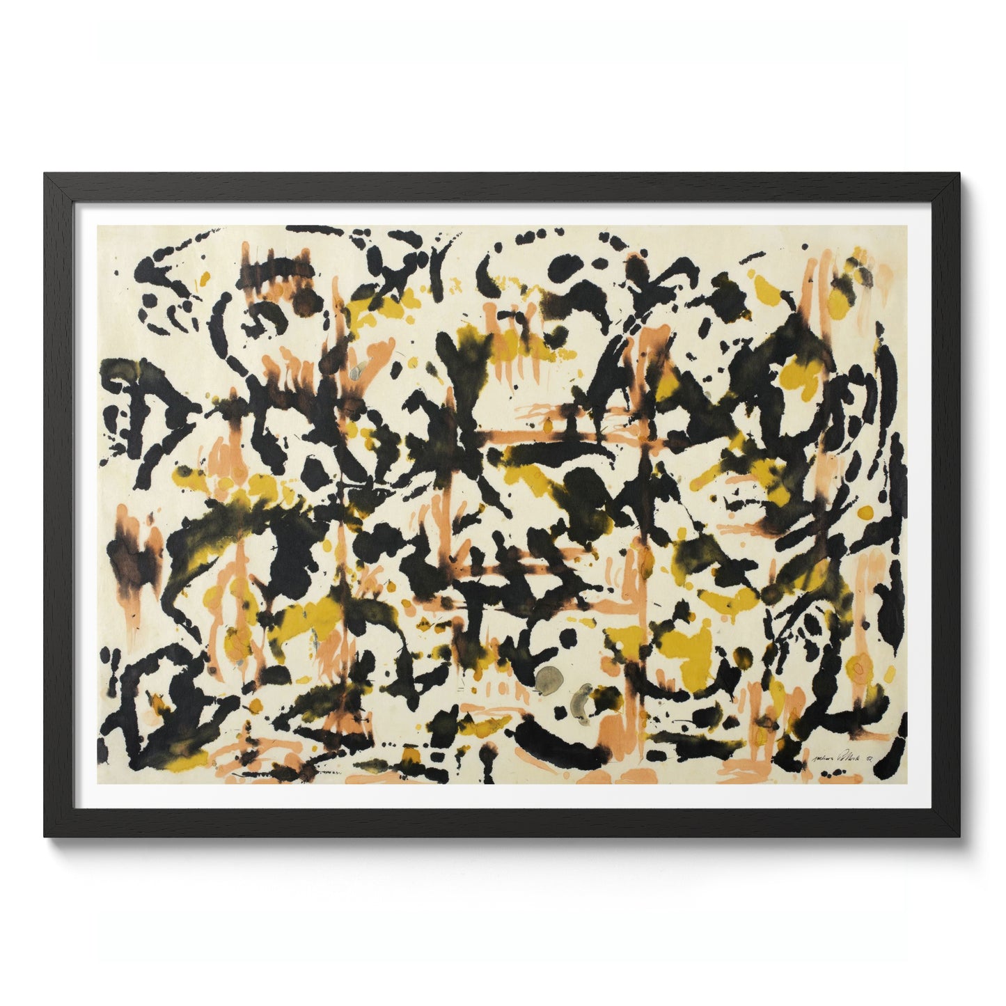 "Untitled II" by Jackson Pollock, created in 1951, exemplifies abstract expressionism through its dynamic splatter and drip painting technique. This art print features an interplay of earthy tones such as black, yellow, and salmon against a light backdrop, generating an energetic and chaotic visual experience. Ideal as a striking poster, it captures Pollock’s signature embodiment of motion and emotion in art.