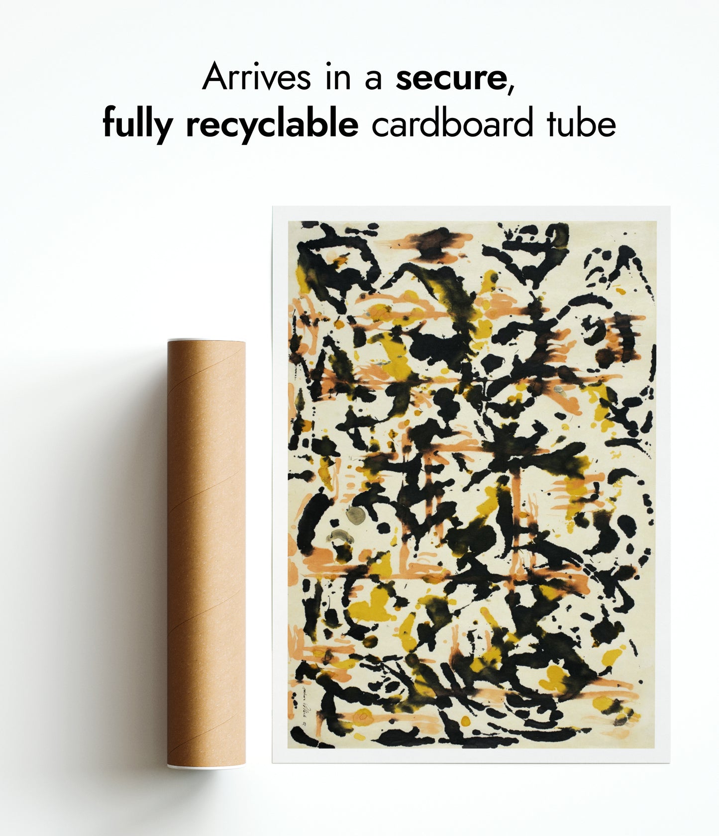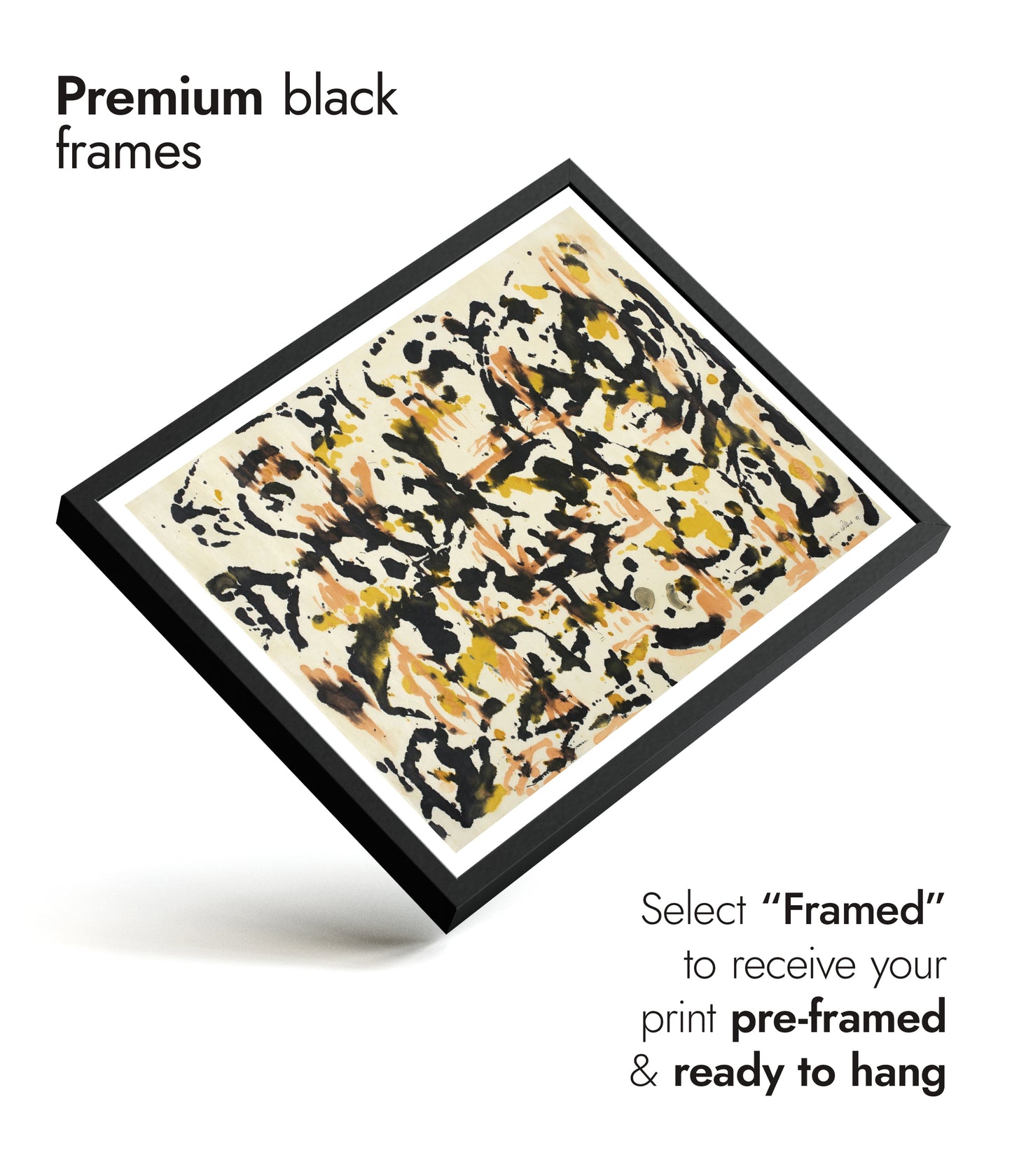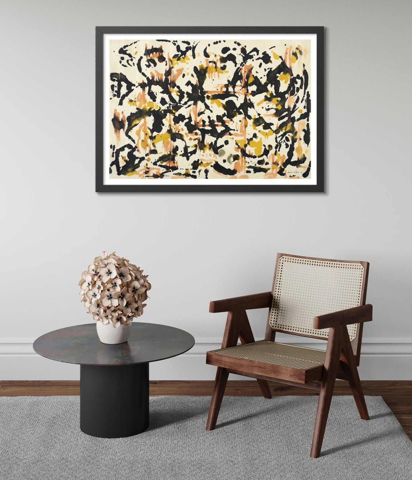 "Untitled II" by Jackson Pollock, created in 1951, exemplifies abstract expressionism through its dynamic splatter and drip painting technique. This art print features an interplay of earthy tones such as black, yellow, and salmon against a light backdrop, generating an energetic and chaotic visual experience. Ideal as a striking poster, it captures Pollock’s signature embodiment of motion and emotion in art.