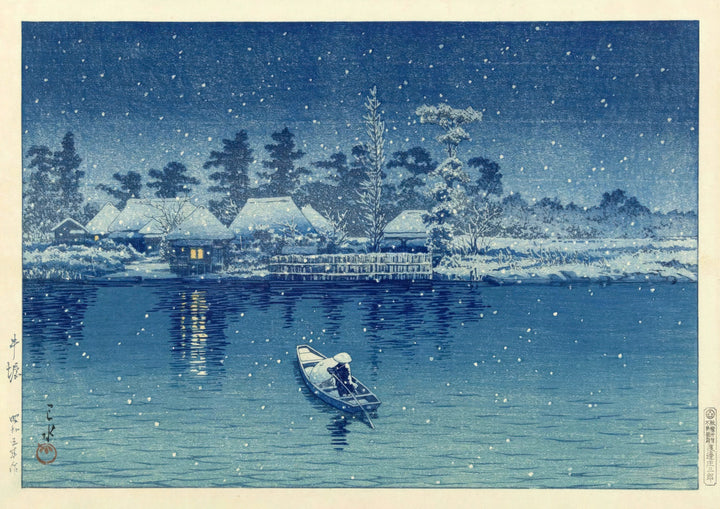 This "Ushibori" poster by Kawase Hasui captures a serene winter night. The woodblock print features a lone boatman rowing on a calm lake under falling snow. The village in the background, adorned with illuminated houses, reflects traditional Japanese architecture. Perfect for enthusiasts of Ukiyo-E landscapes and traditional woodblock art.