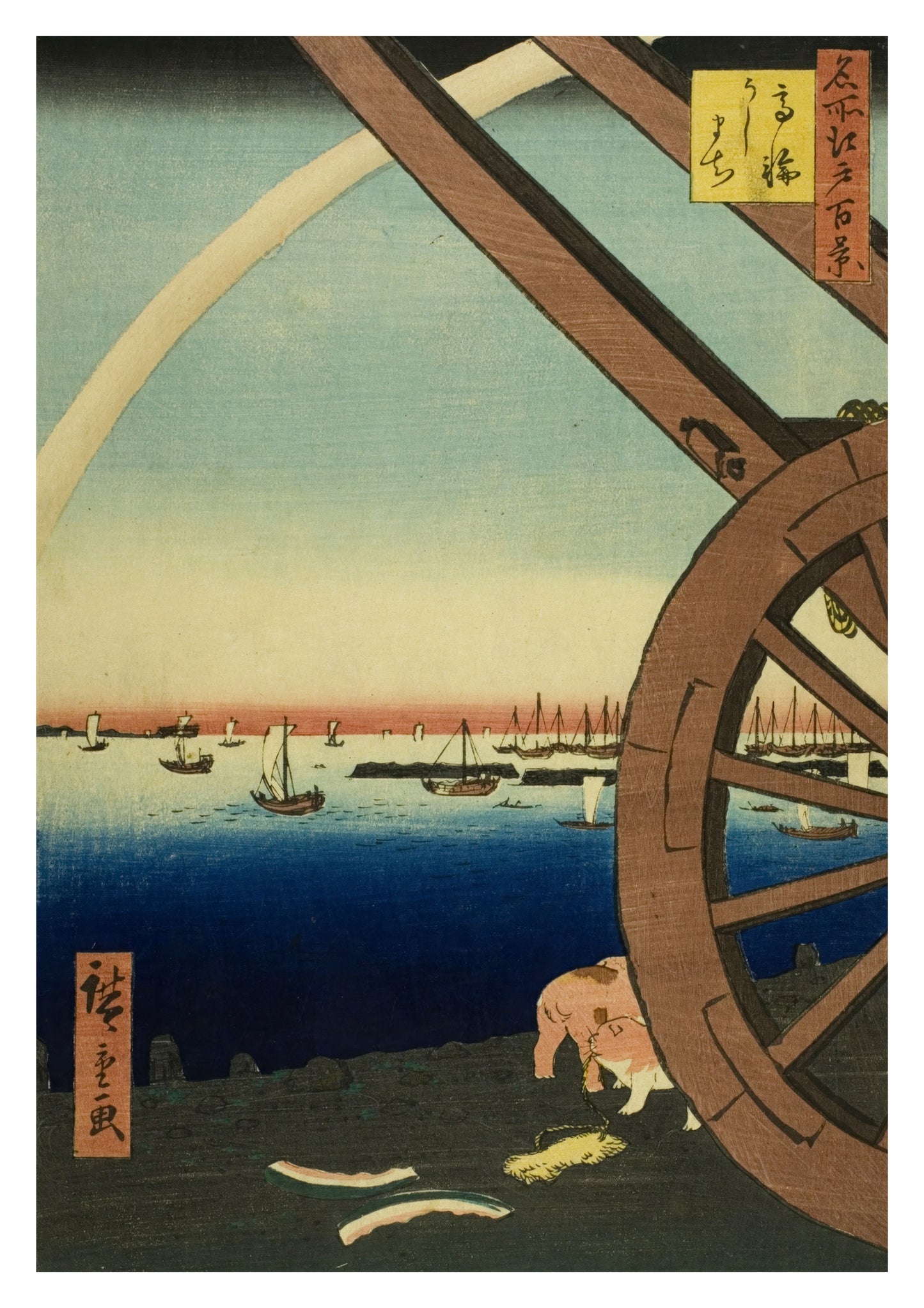 "Ushimachi at Takanawa" by Utagawa Hiroshige, is a traditional Japanese woodblock print poster. It depicts a serene coastal scene with boats in the distance, framed by a large wooden cart wheel. A small puppy plays near the shoreline, adding a charming touch to the tranquil seaside landscape. Perfect for lovers of Japanese art and iconic ukiyo-e style.