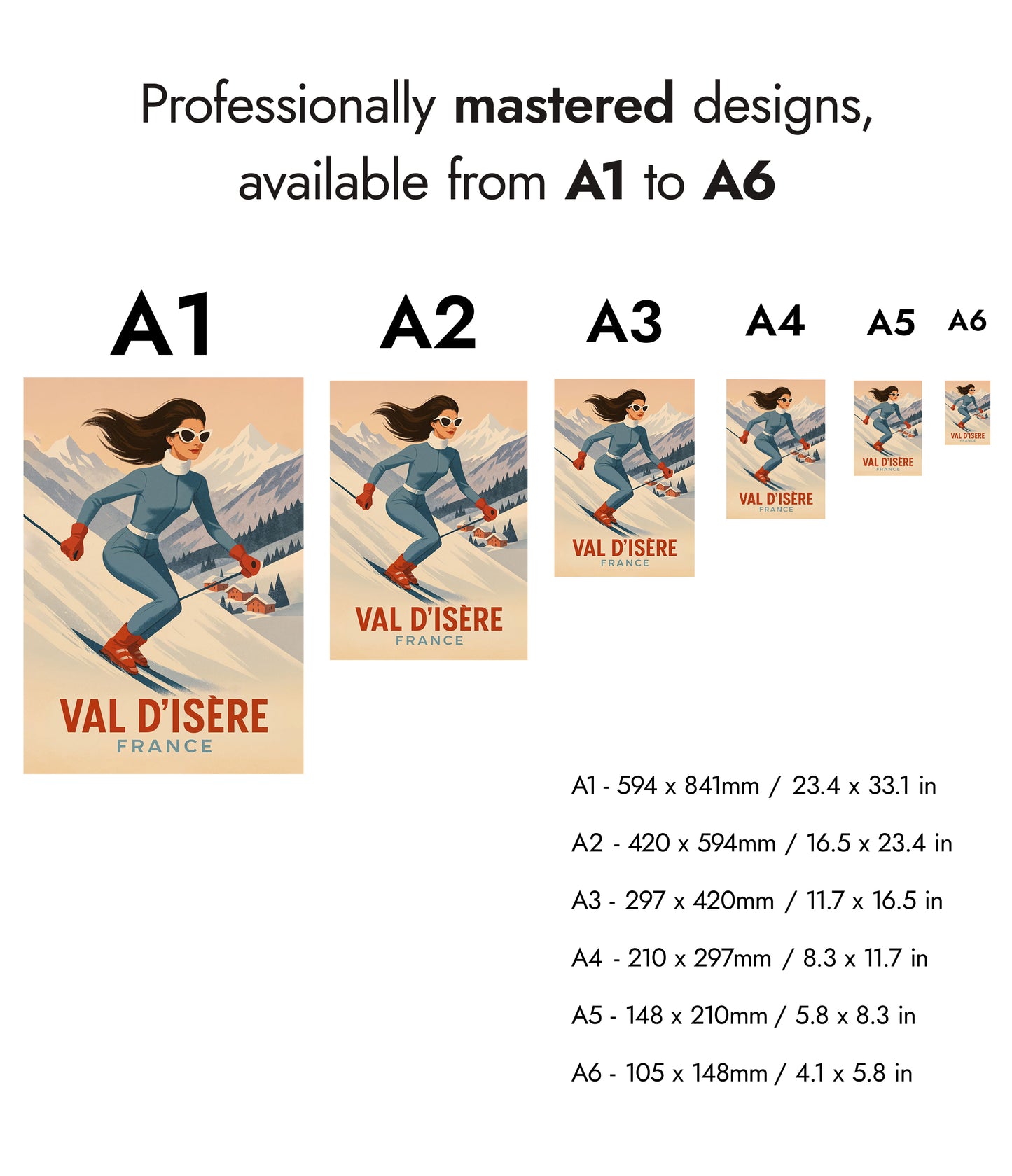 This vintage-inspired Val D'Isère ski poster captures a stylish woman gracefully skiing through the pristine snow of the French Alps. Her blue ski suit and red accessories stand out against the backdrop of majestic mountains and cozy cabins. Perfect for adding a touch of retro elegance to any space, this graphic artwork embodies the allure of winter sports in Val D'Isère, France.