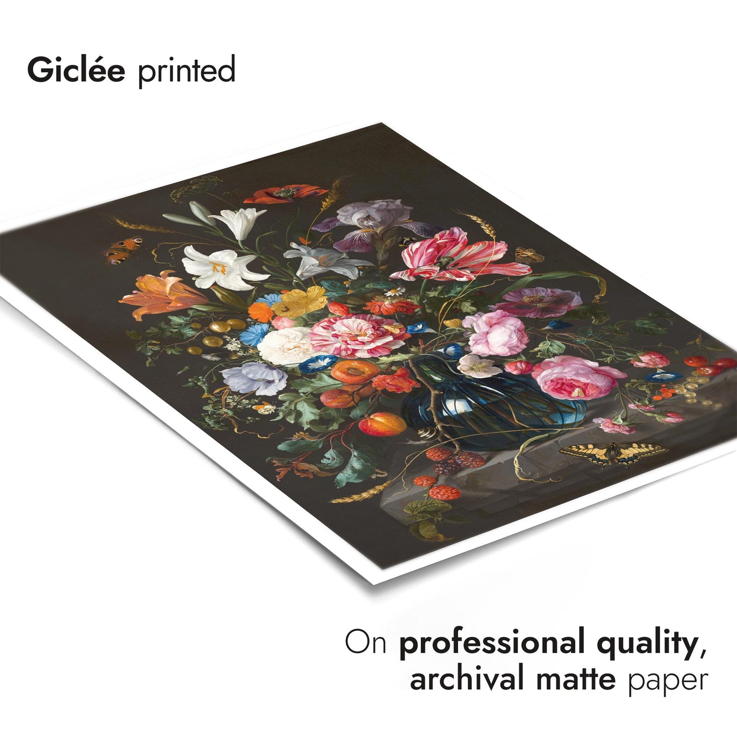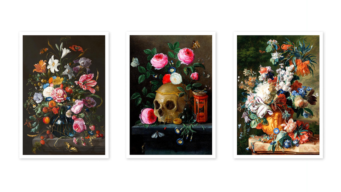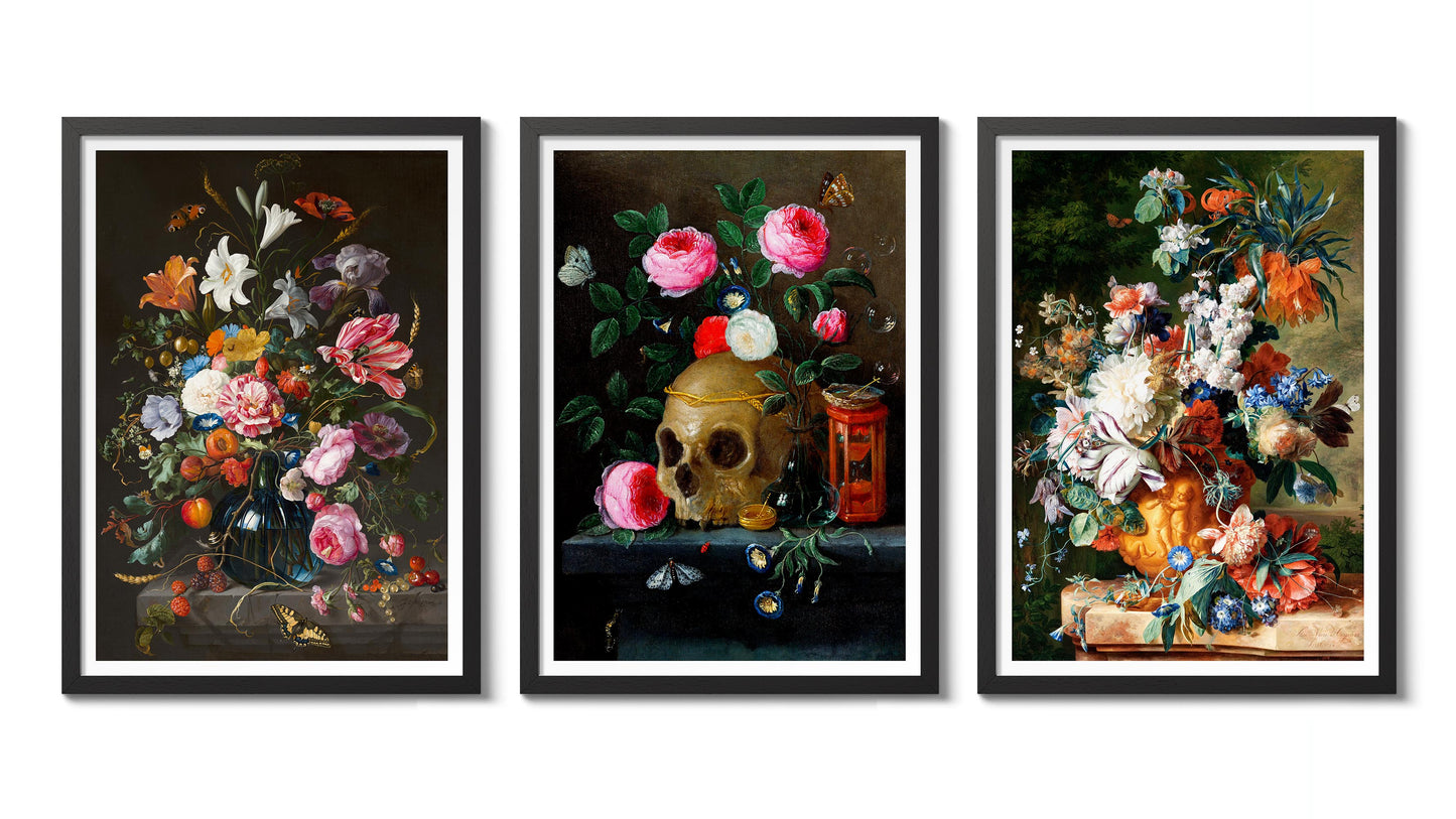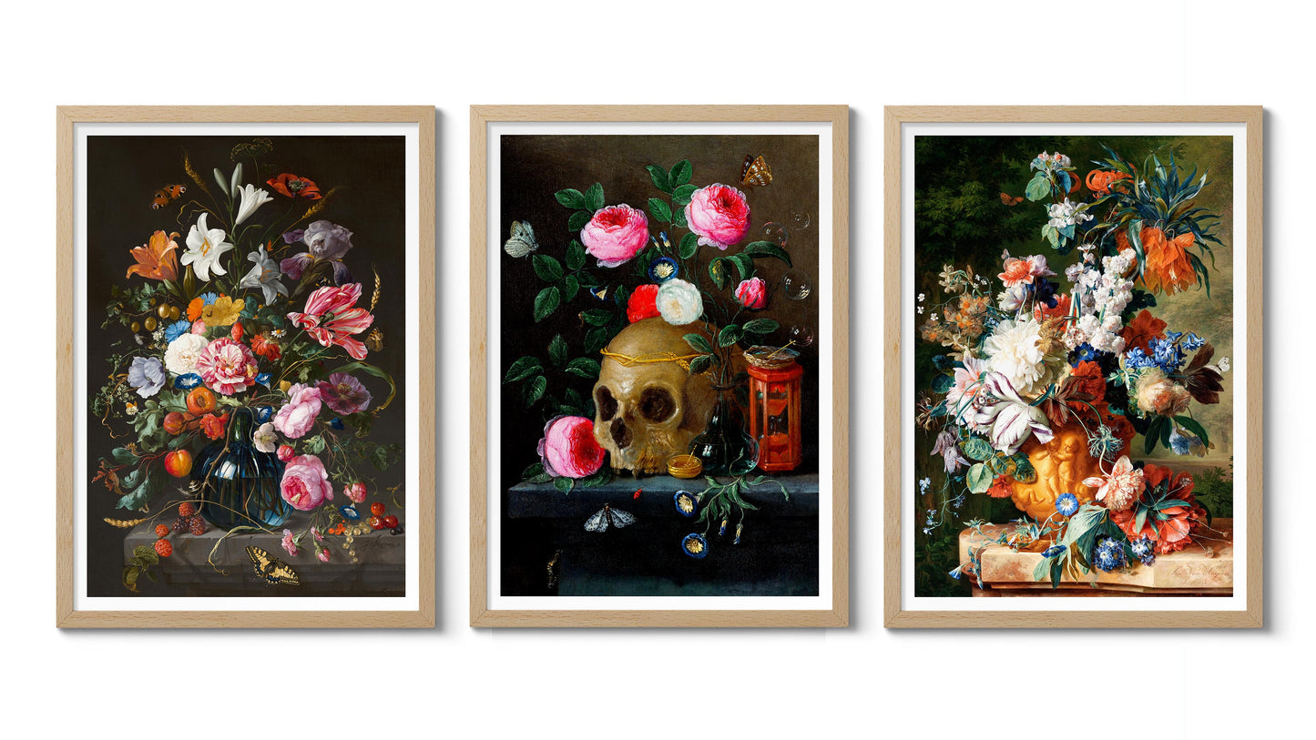 This "Vase of Flowers" poster set showcases the exquisite still life paintings of Jan Davidsz De Heem, featuring vibrant floral arrangements. With lush bouquets of roses and lilies, and a contemplative skull amidst petals, these pieces blend themes of life and mortality. The multicoloured compositions celebrate natural beauty, making a striking addition to any art lover's collection.
