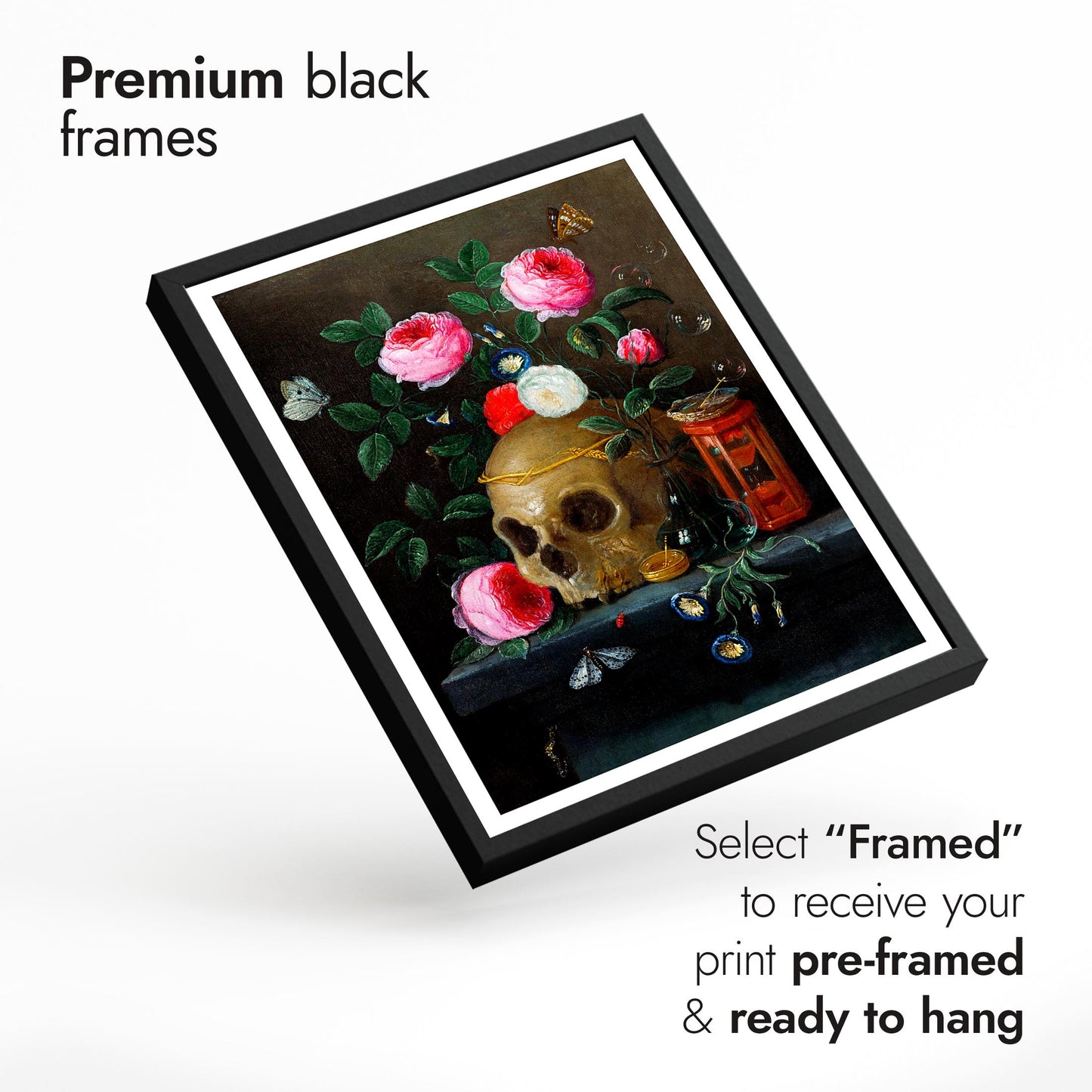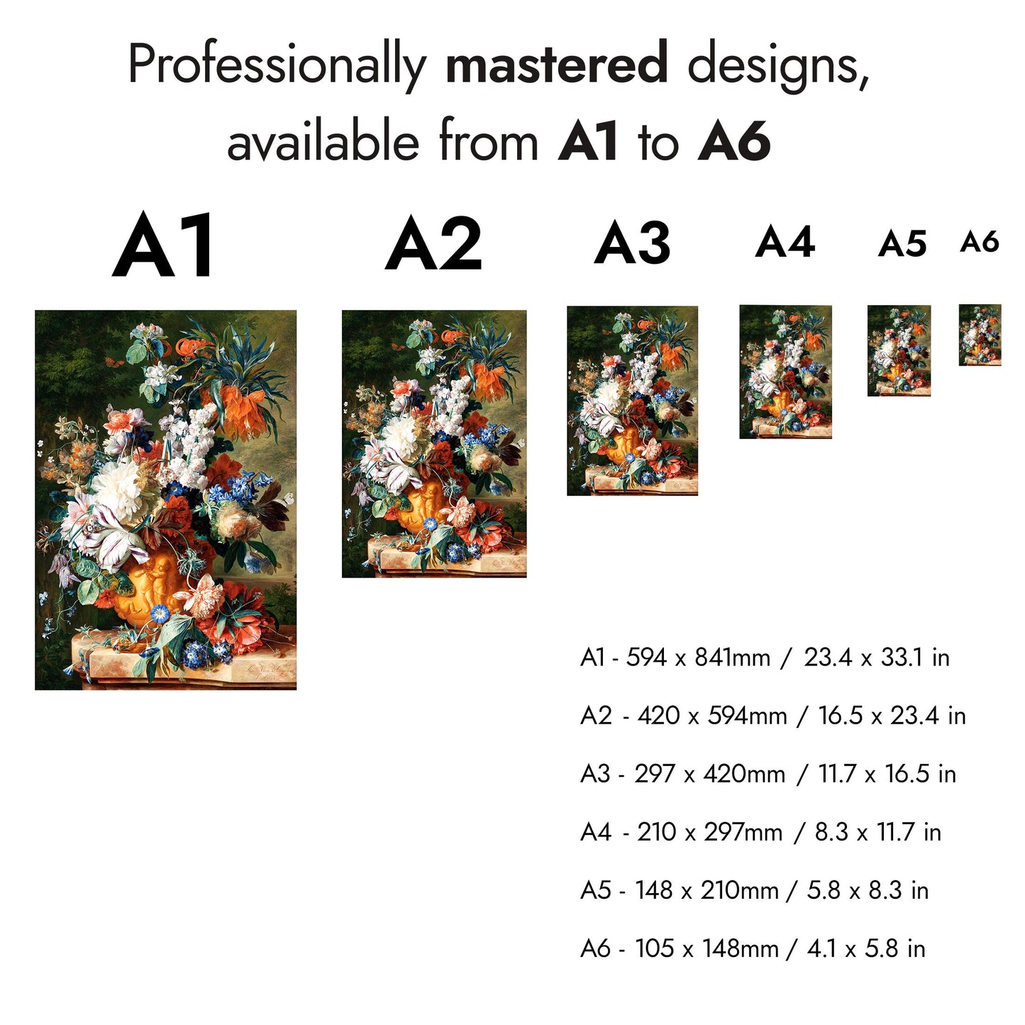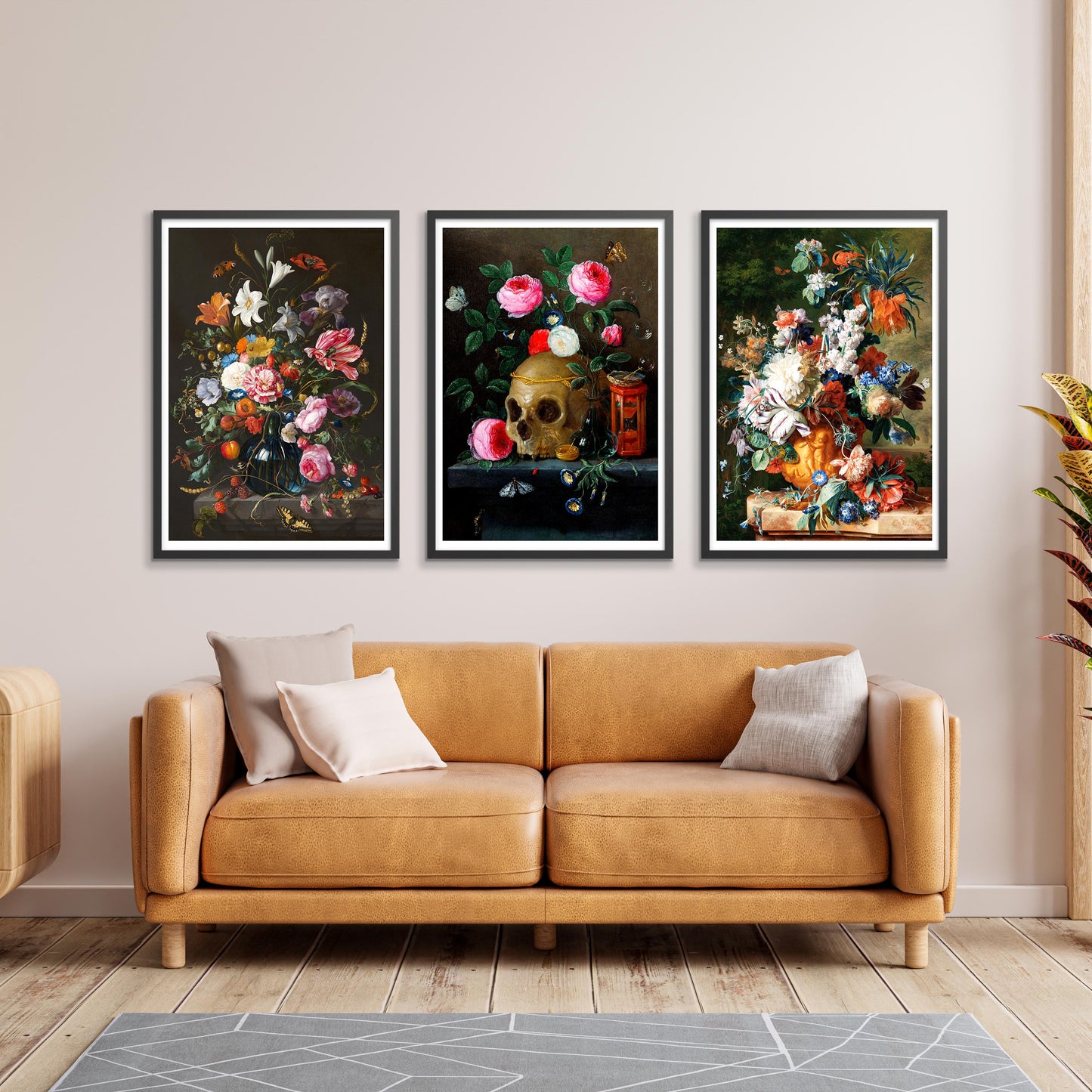 This "Vase of Flowers" poster set showcases the exquisite still life paintings of Jan Davidsz De Heem, featuring vibrant floral arrangements. With lush bouquets of roses and lilies, and a contemplative skull amidst petals, these pieces blend themes of life and mortality. The multicoloured compositions celebrate natural beauty, making a striking addition to any art lover's collection.