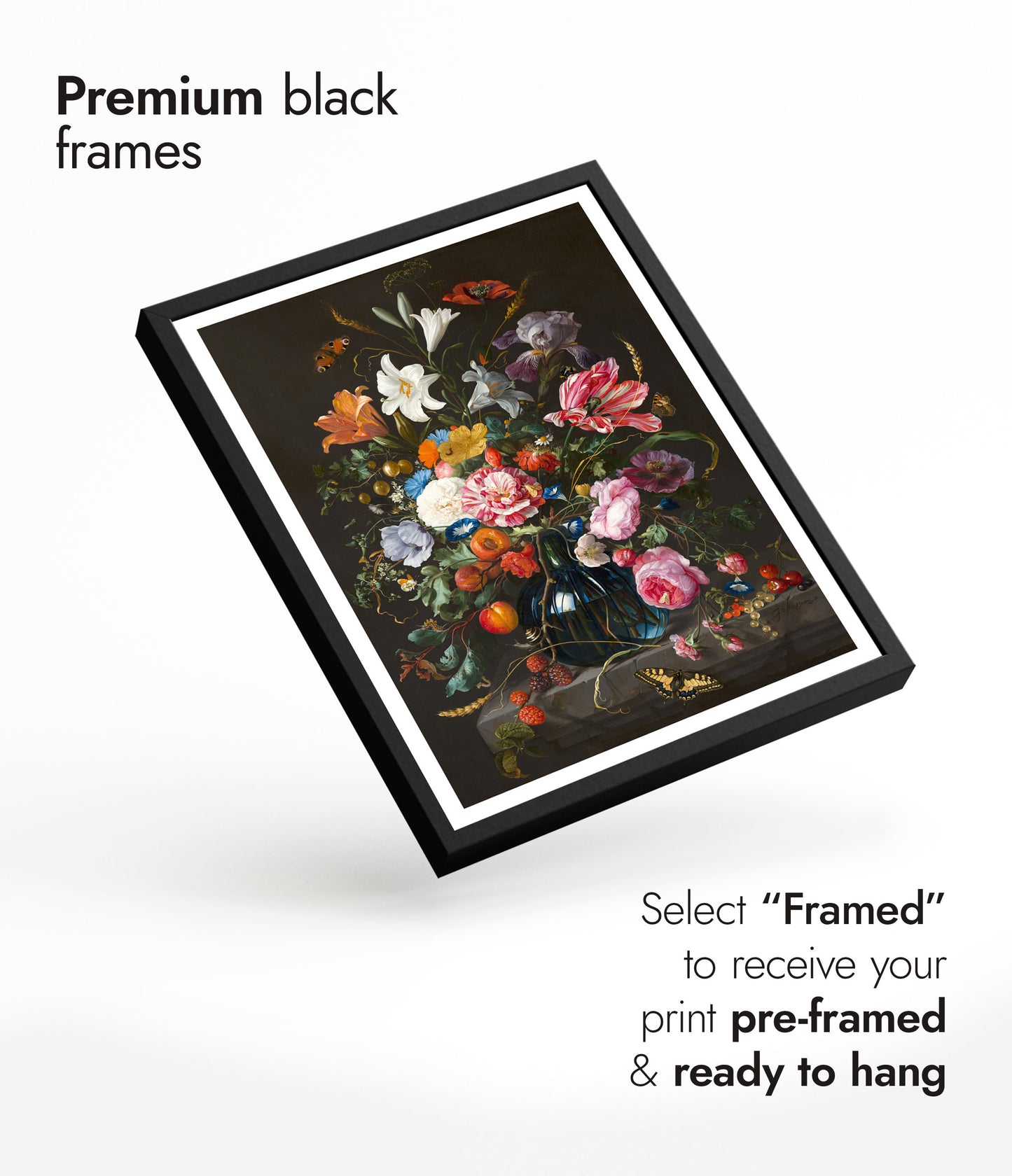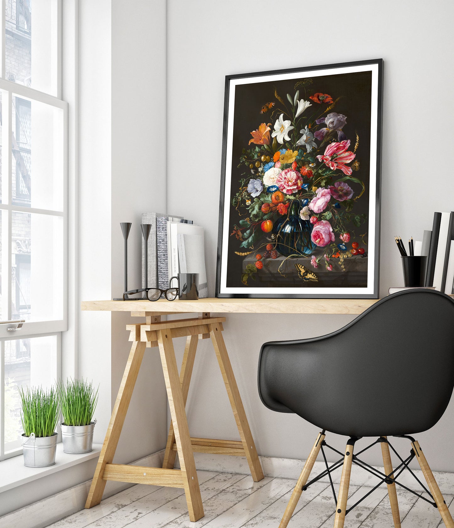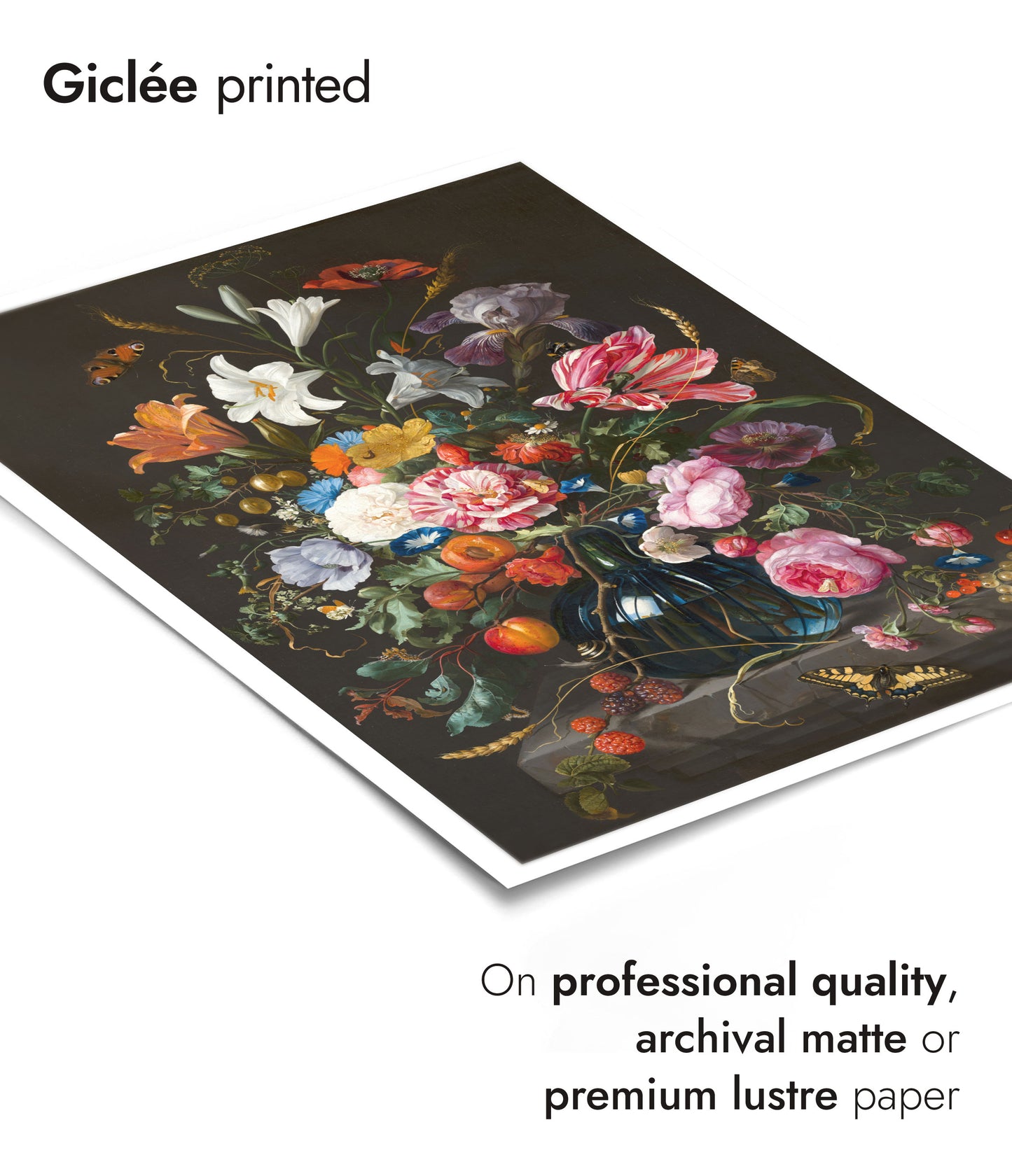 "Vase of Flowers" by Jan Davidsz de Heem captures a stunning floral arrangement in a dark, elegant vase. This vintage still life poster showcases vibrant blooms like lilies, roses, and tulips, complemented by delicate butterflies and vivid greenery. The intricate details and rich colours of this traditional painting bring a touch of classic beauty to any space. Perfect for floral and nature enthusiasts.