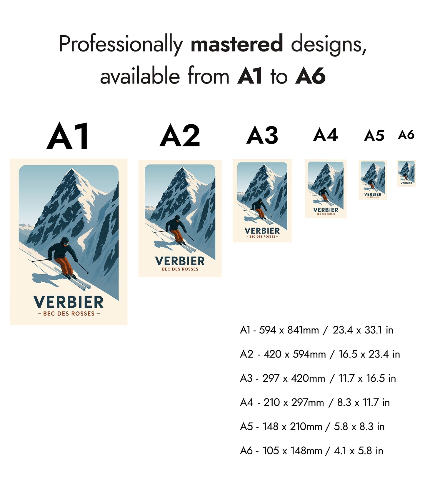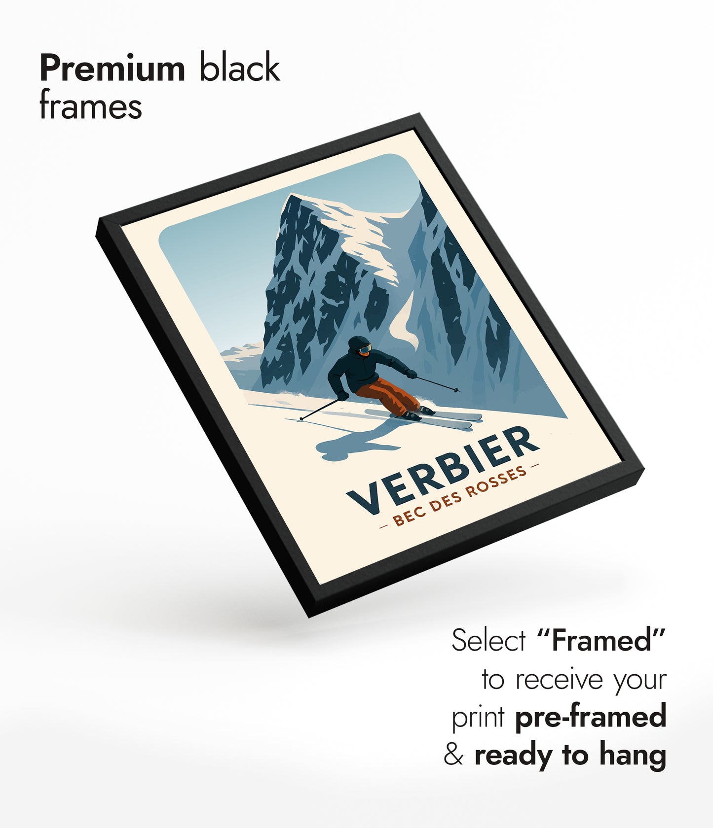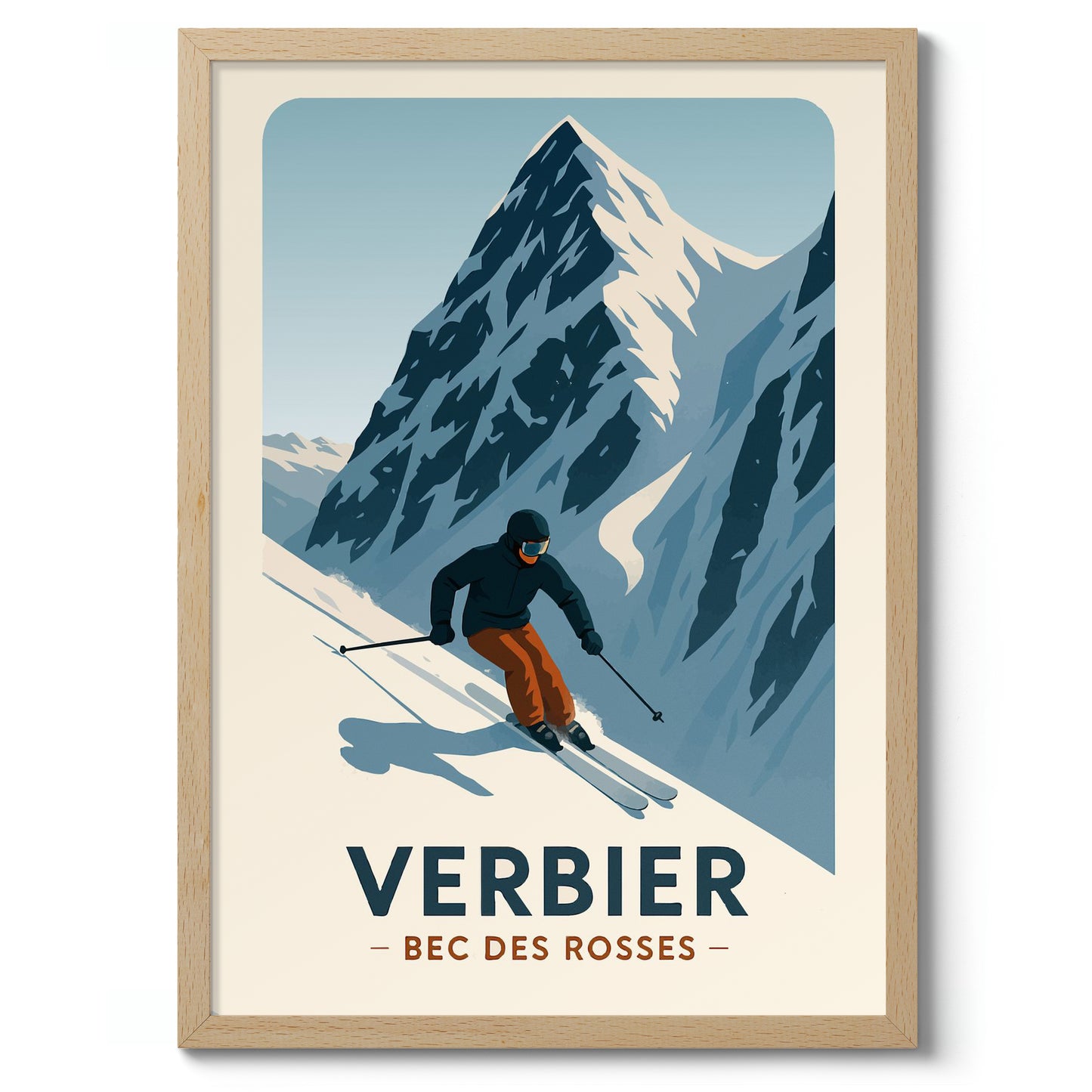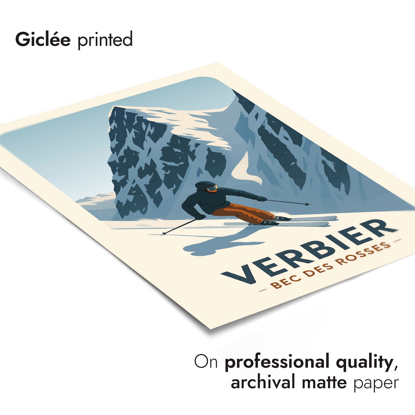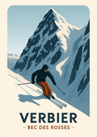 Capture the thrill of winter sports with the "Verbier - Bec des Rosses" poster. This graphic artwork features a skilled skier navigating a steep slope against the dramatic backdrop of snow-clad peaks. The crisp lines and bold contrasts embody the adventurous spirit of Verbier, making it a perfect piece for ski enthusiasts and mountain lovers alike.