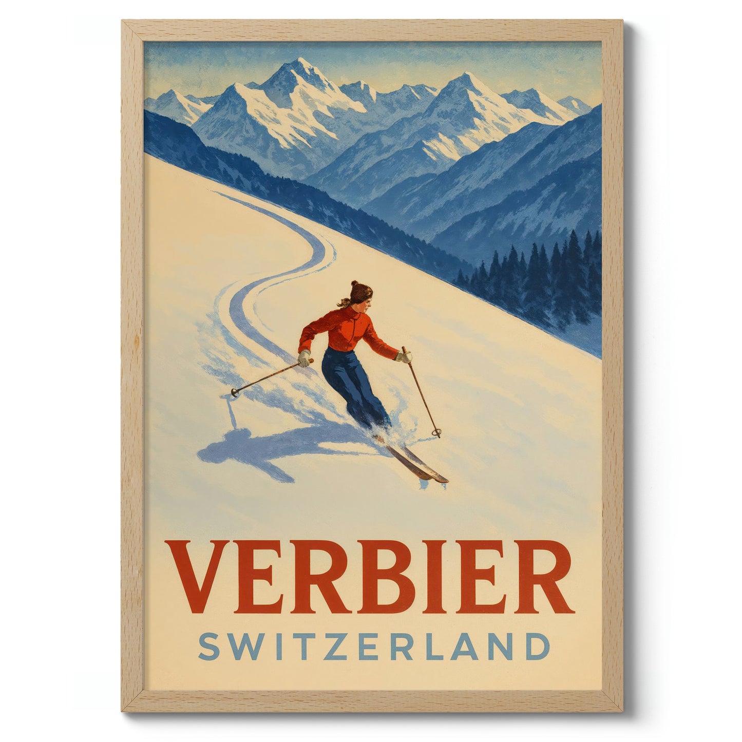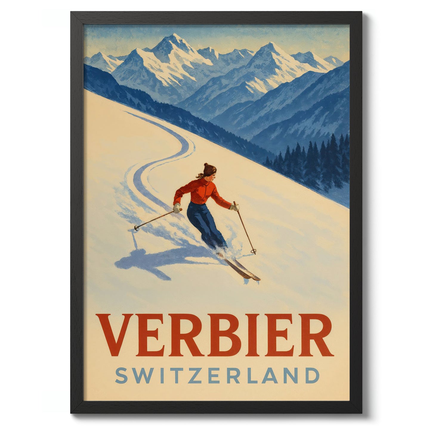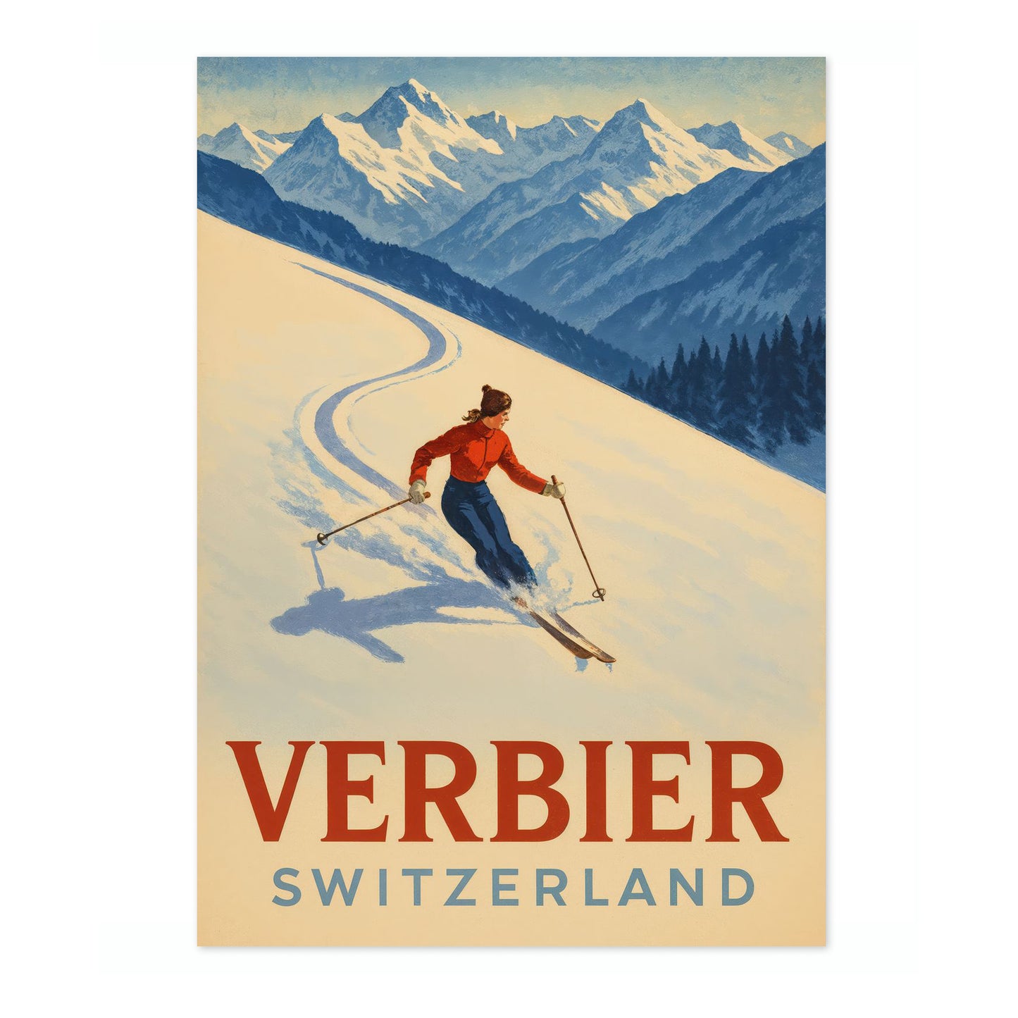 This Verbier Switzerland Ski poster showcases a skier carving elegantly through pristine snow against the backdrop of the majestic Swiss Alps. The vintage graphic style captures the exhilarating essence of winter sports, with its dynamic movement and vibrant colors. Ideal for travel and ski enthusiasts, this artwork celebrates the picturesque beauty of Verbier's snow-laden landscapes.