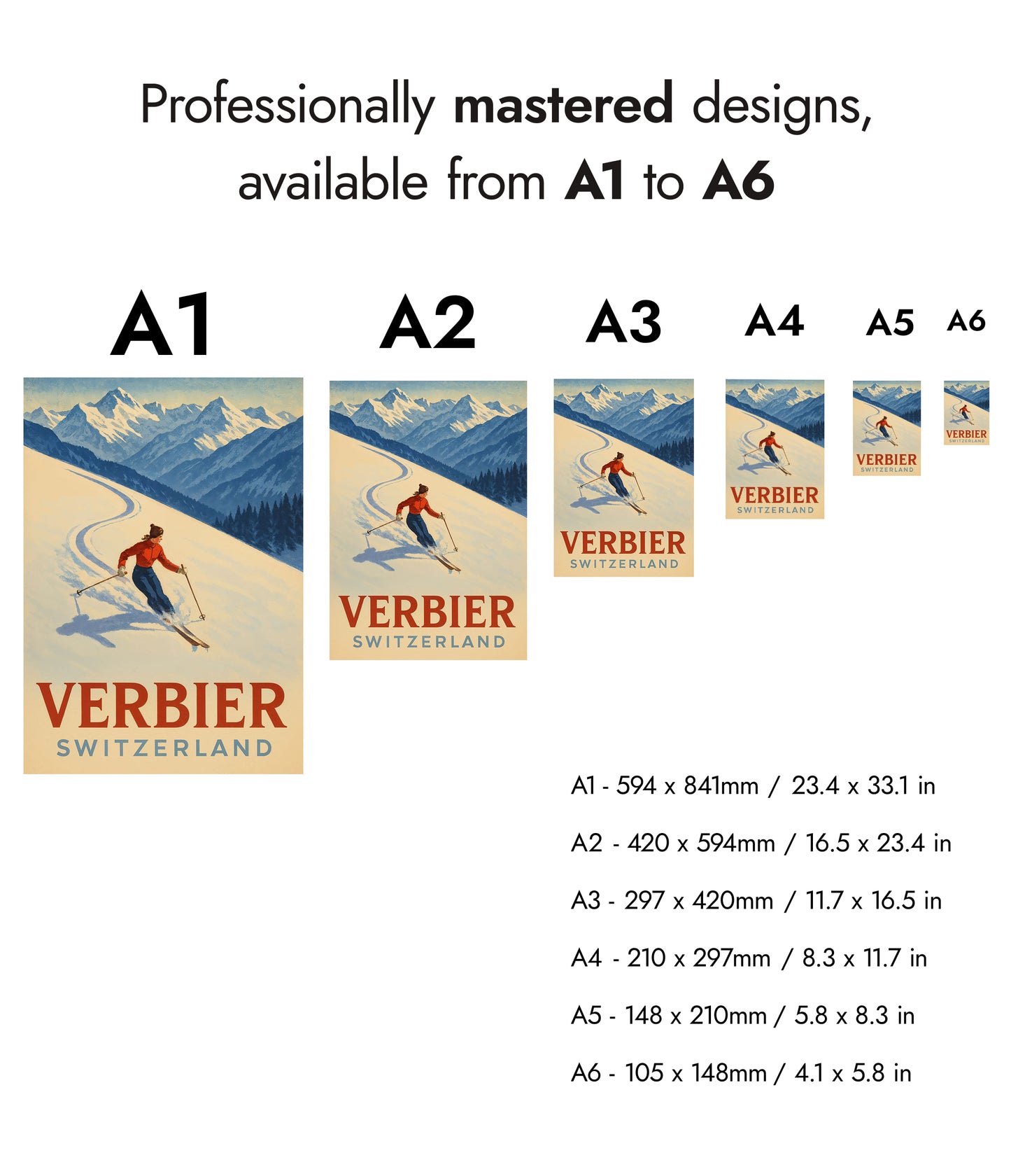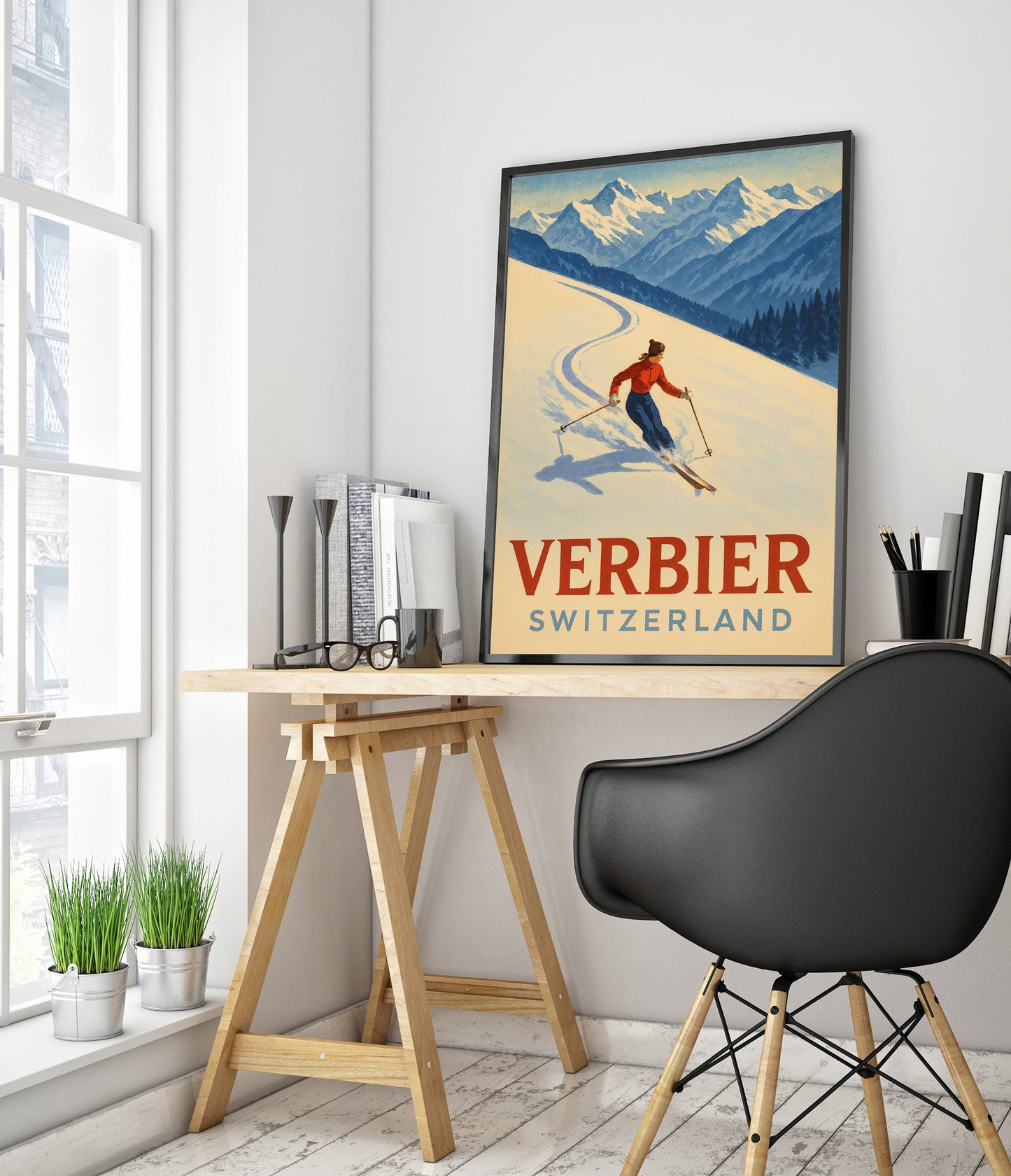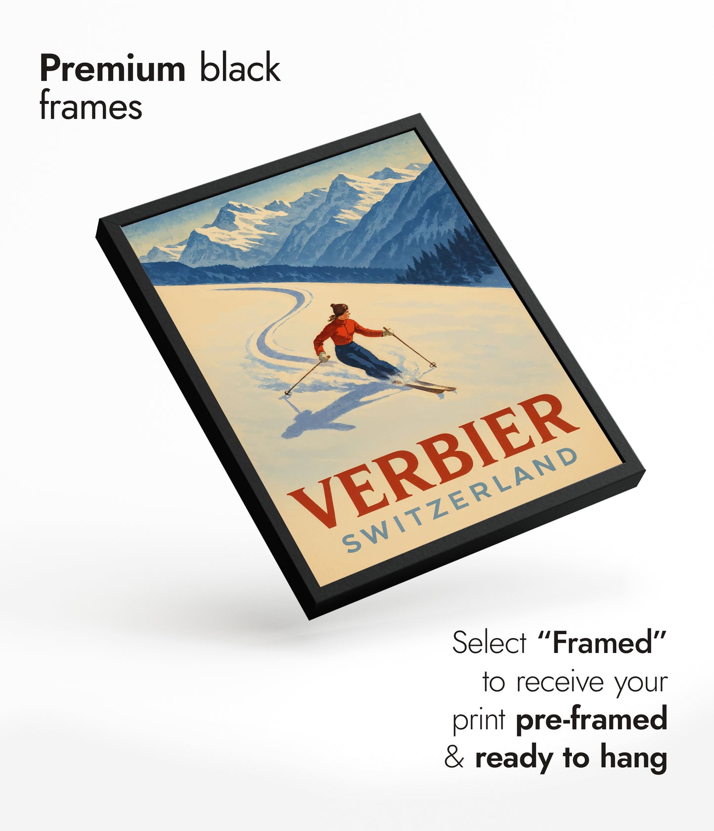 This Verbier Switzerland Ski poster showcases a skier carving elegantly through pristine snow against the backdrop of the majestic Swiss Alps. The vintage graphic style captures the exhilarating essence of winter sports, with its dynamic movement and vibrant colors. Ideal for travel and ski enthusiasts, this artwork celebrates the picturesque beauty of Verbier's snow-laden landscapes.