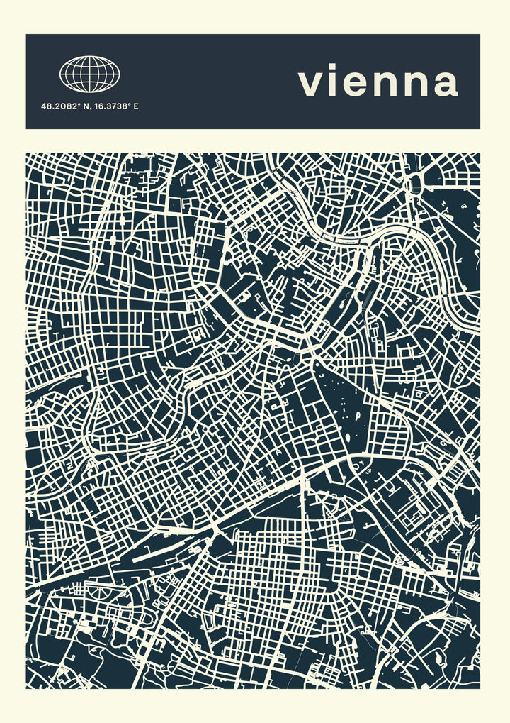 This "Vienna Map Poster" beautifully illustrates the intricate street layout of Austria's capital city. Rendered in a modern, graphic style, this map print captures the essence of Vienna's urban landscape with precision and clarity. Perfect for those with a love for cartography or European cities, this detailed portrayal of Vienna makes a striking addition to any space.
