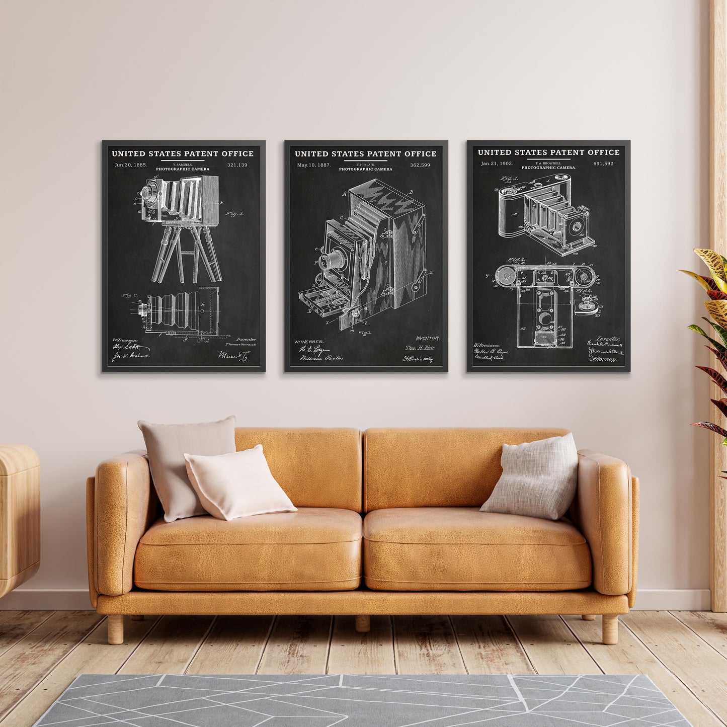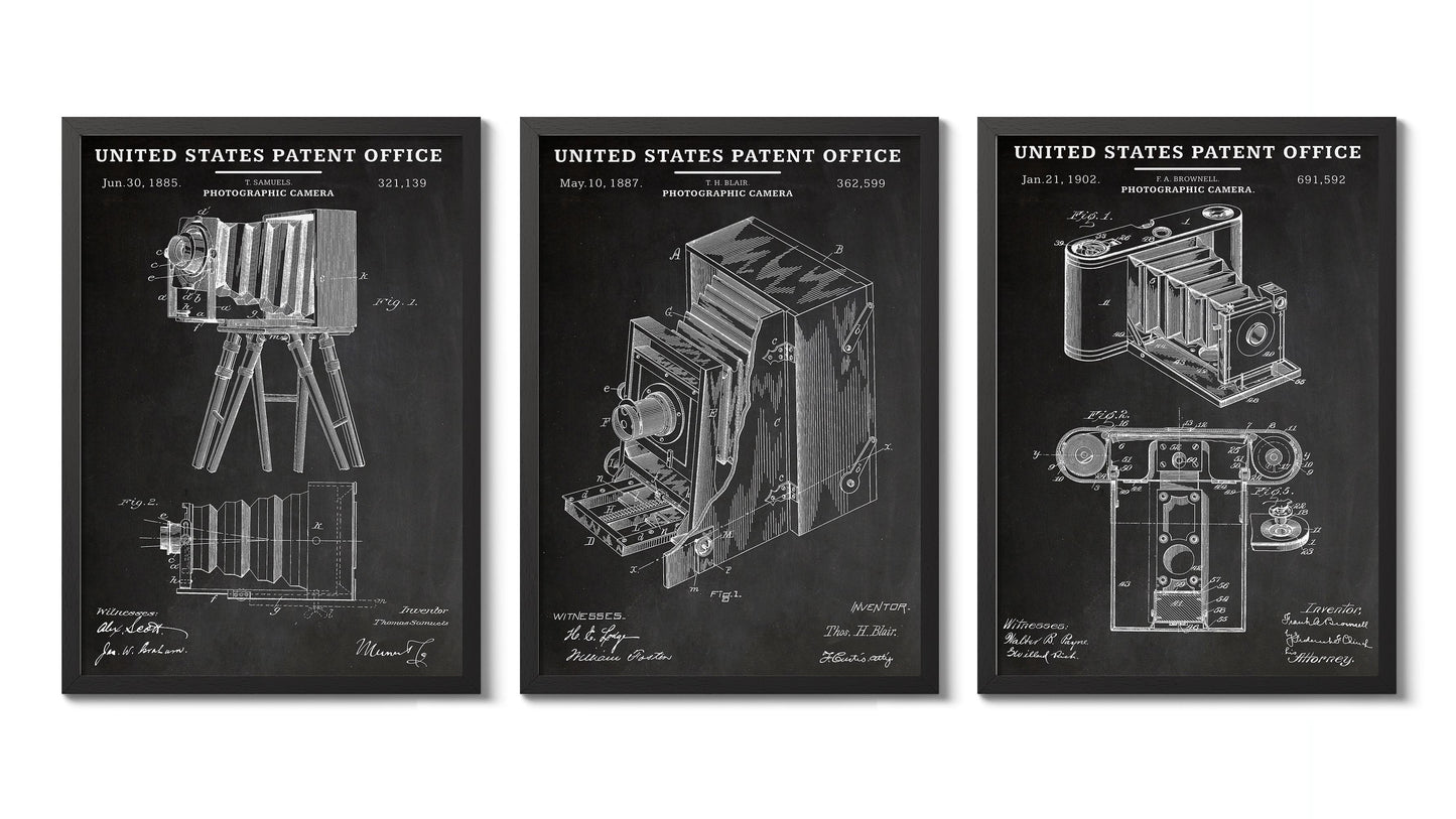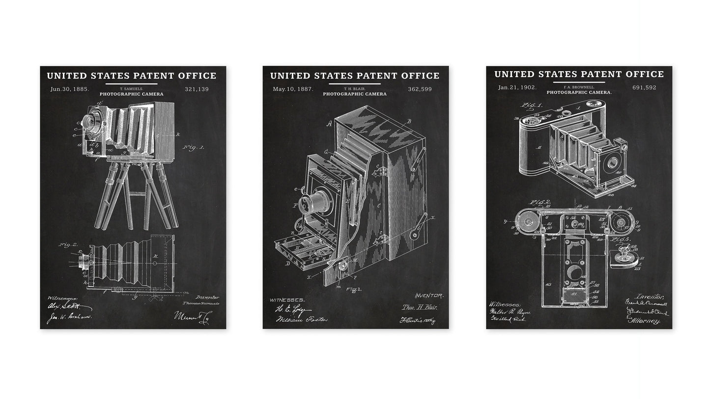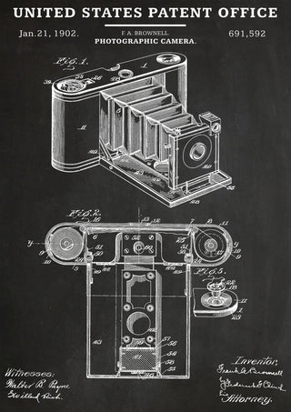 Explore the intricate details of vintage photography with this set of posters featuring U.S. patent schematics for historical cameras. The monochromatic line art illustrations accurately depict the mechanics and design of these classic photographic devices. Ideal for enthusiasts of both photography and vintage engineering, these black and white prints offer a glimpse into the technological advancements of bygone eras.