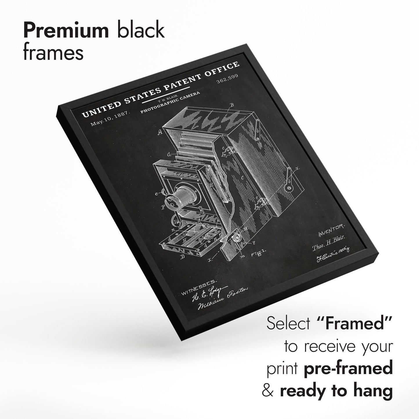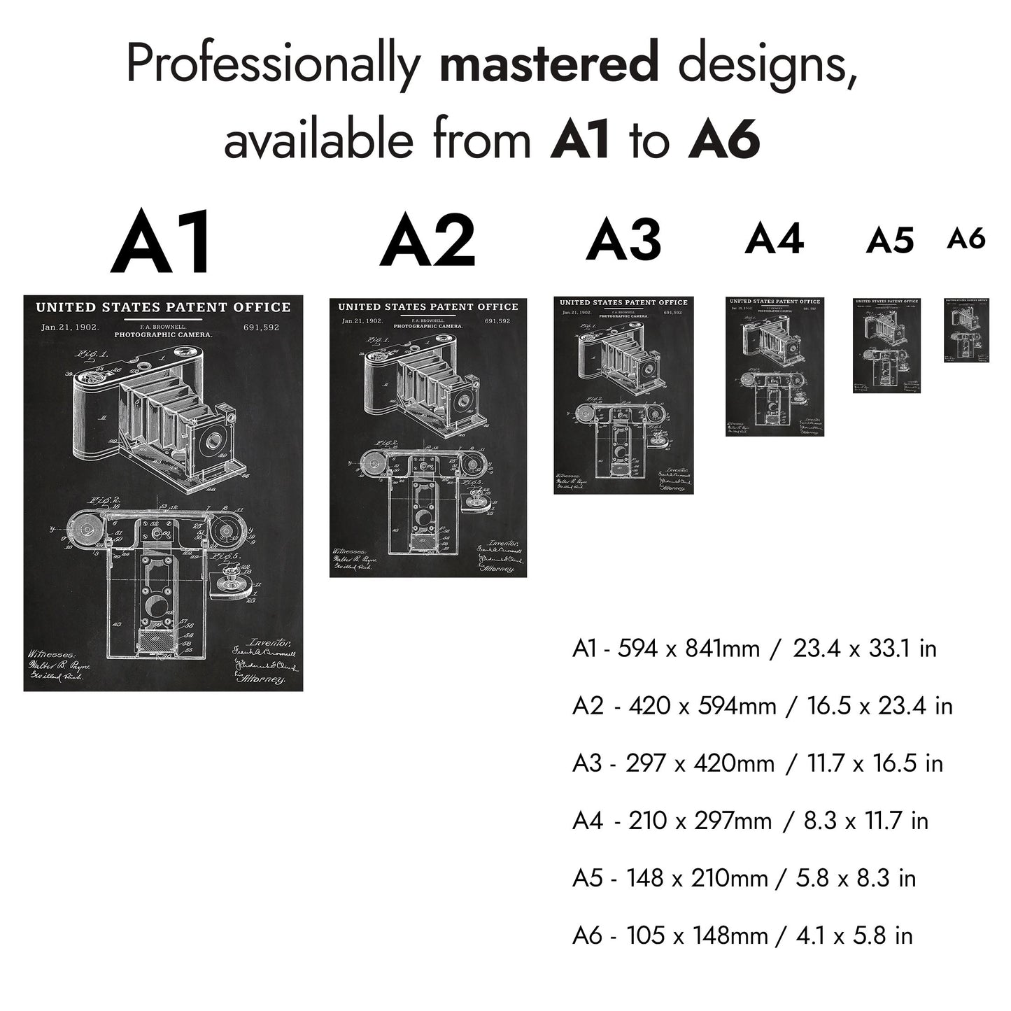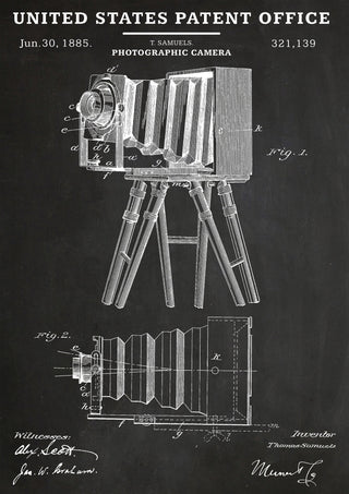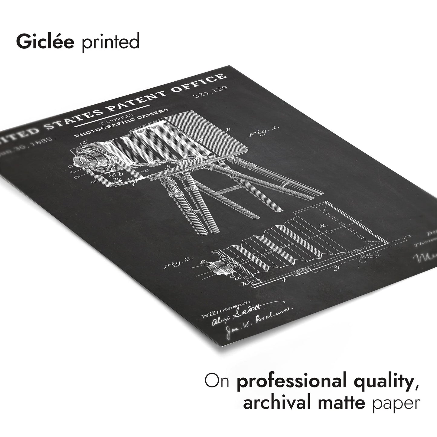 Explore the intricate details of vintage photography with this set of posters featuring U.S. patent schematics for historical cameras. The monochromatic line art illustrations accurately depict the mechanics and design of these classic photographic devices. Ideal for enthusiasts of both photography and vintage engineering, these black and white prints offer a glimpse into the technological advancements of bygone eras.