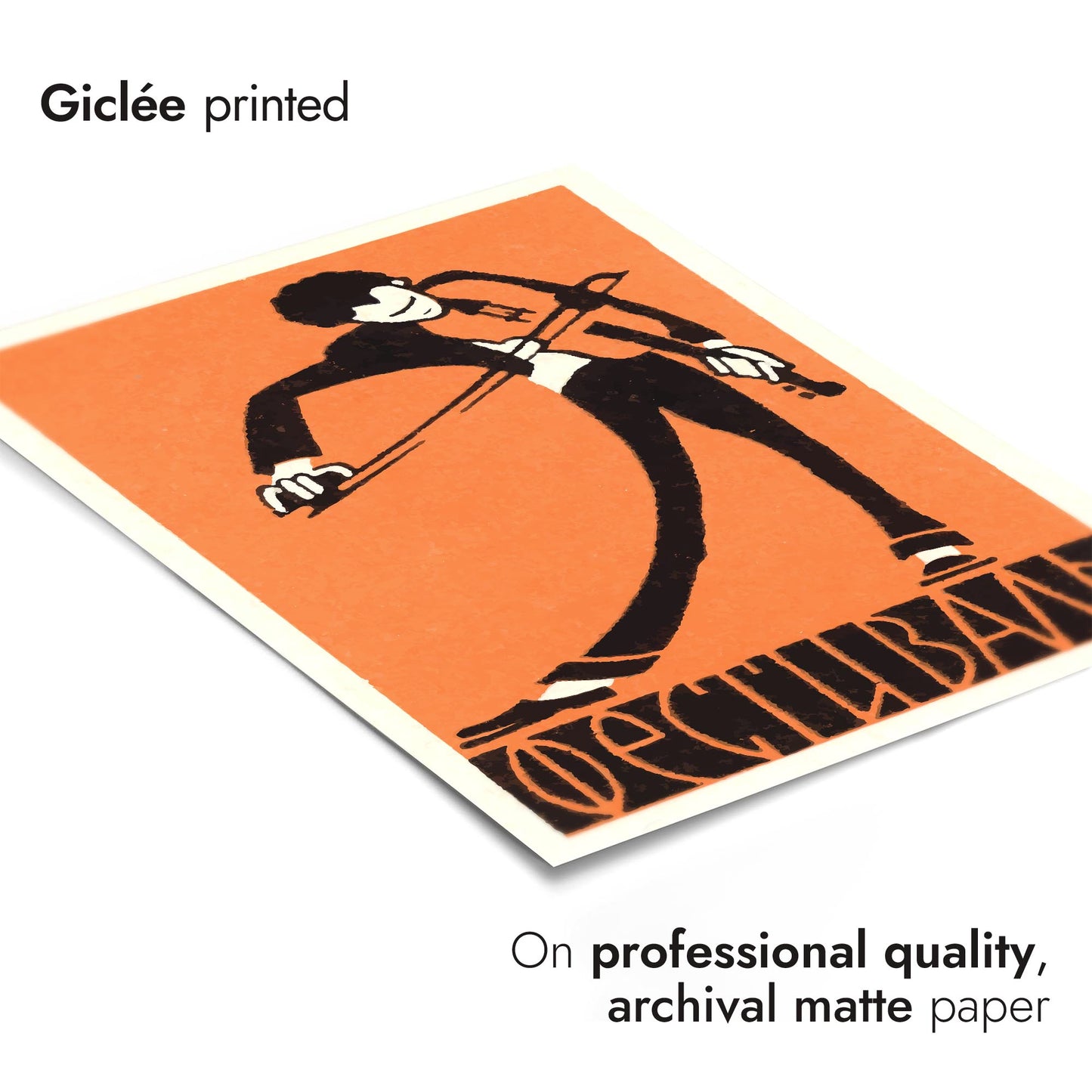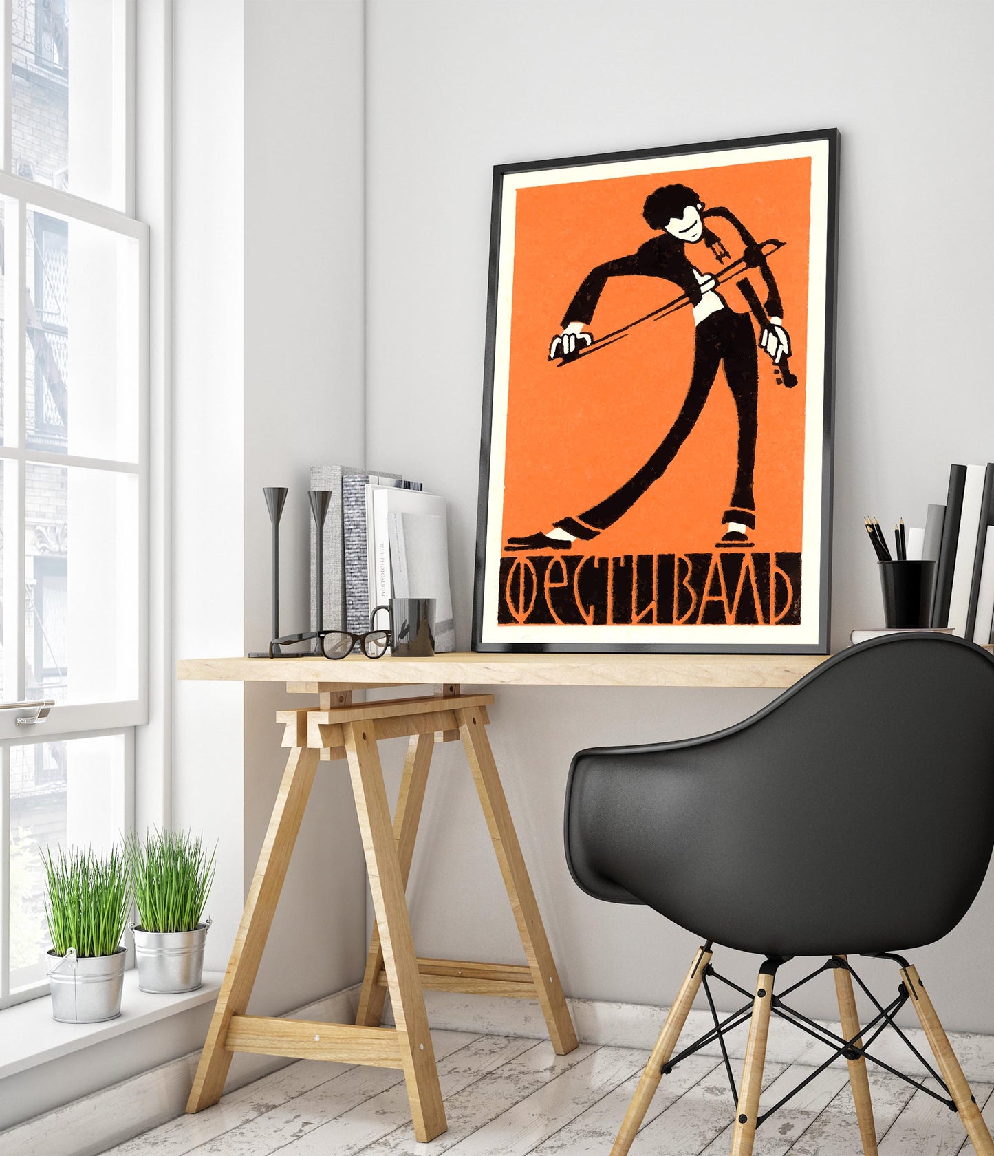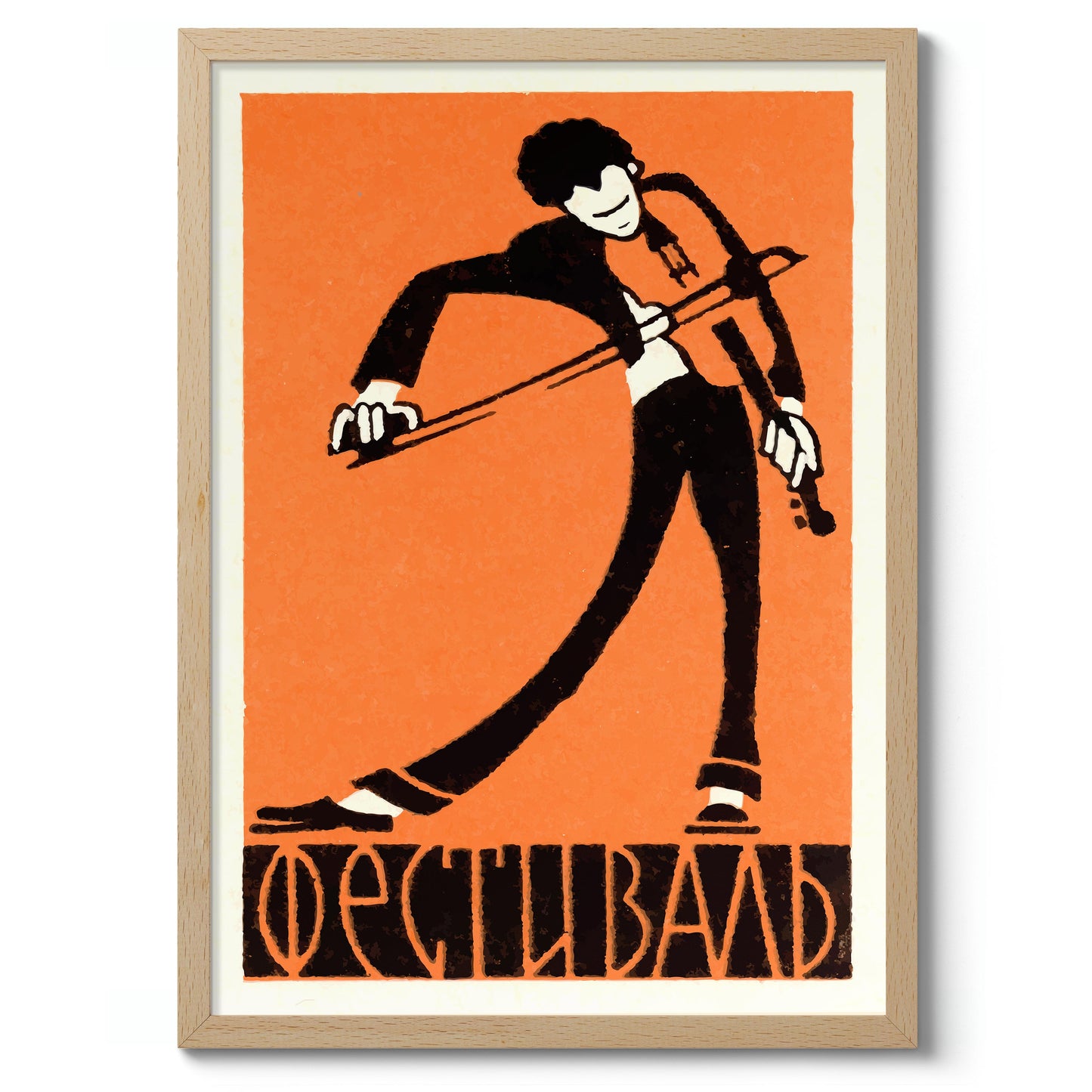 This vintage poster, titled "Violinist," features a stylized, expressive musician playing the violin against a vibrant orange backdrop. The bold black lines and minimalist design capture the essence of the performance, making it a striking piece for any music lover. Ideal for adding a retro touch to a space, this illustration celebrates orchestral art and instrumental beauty.