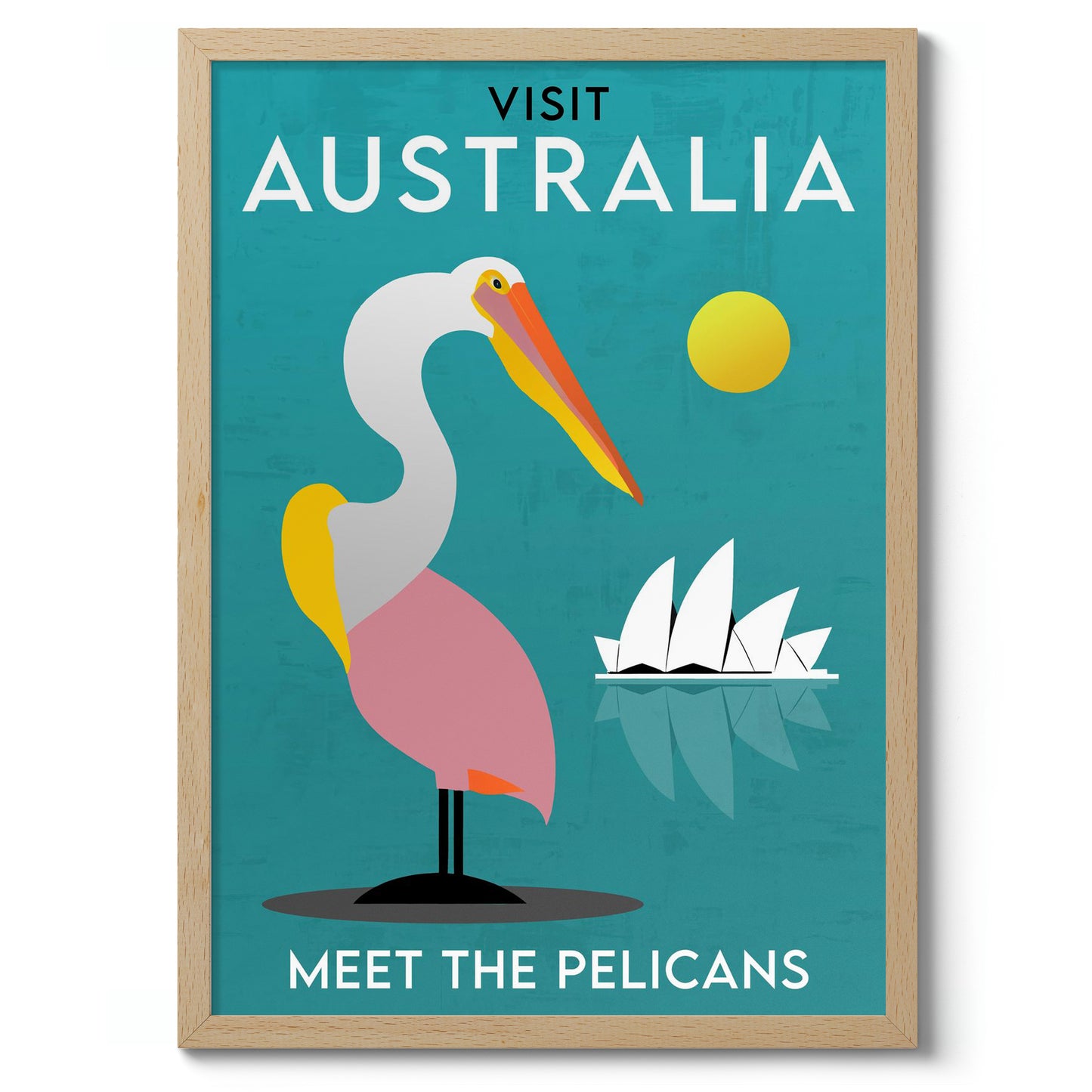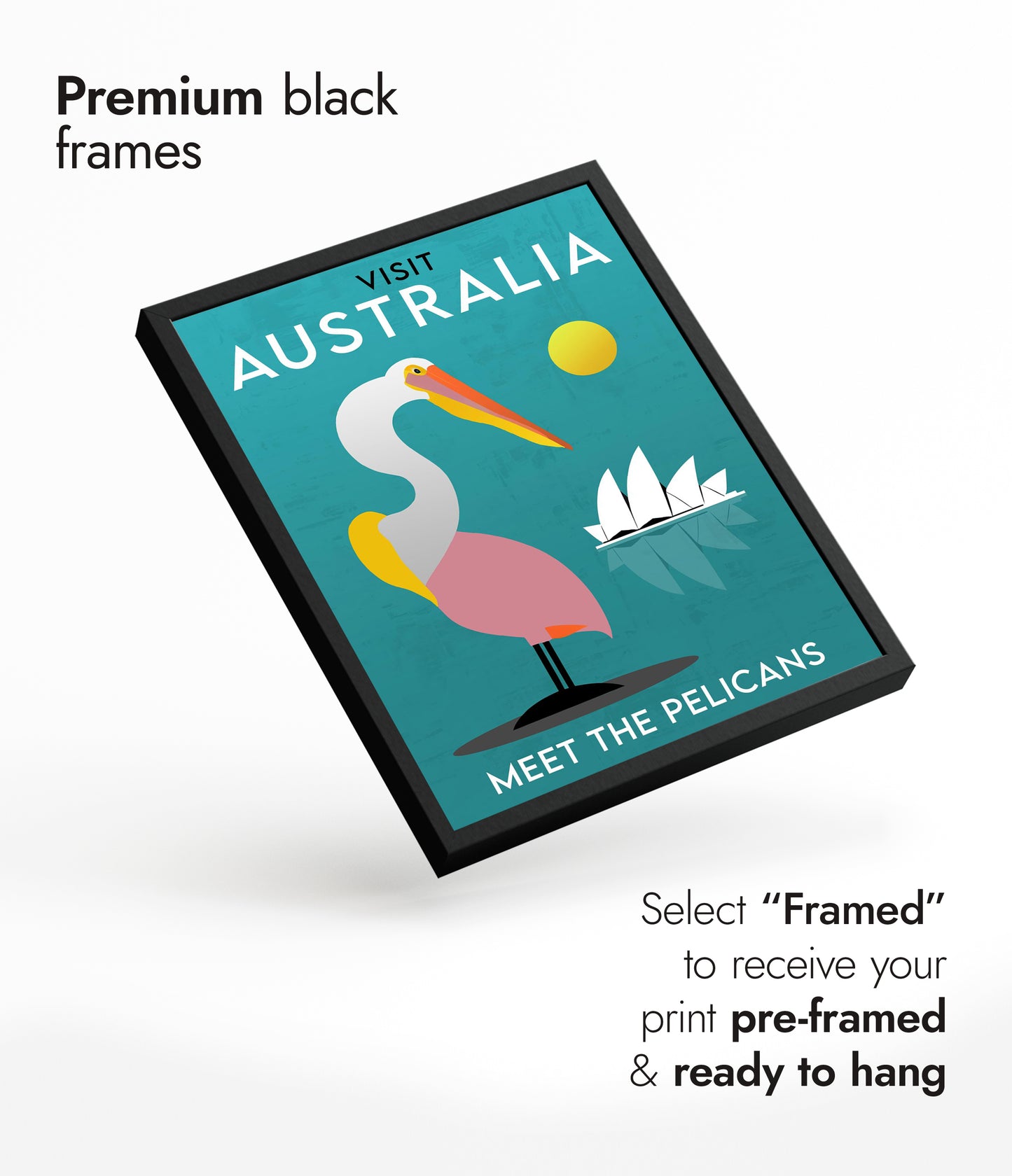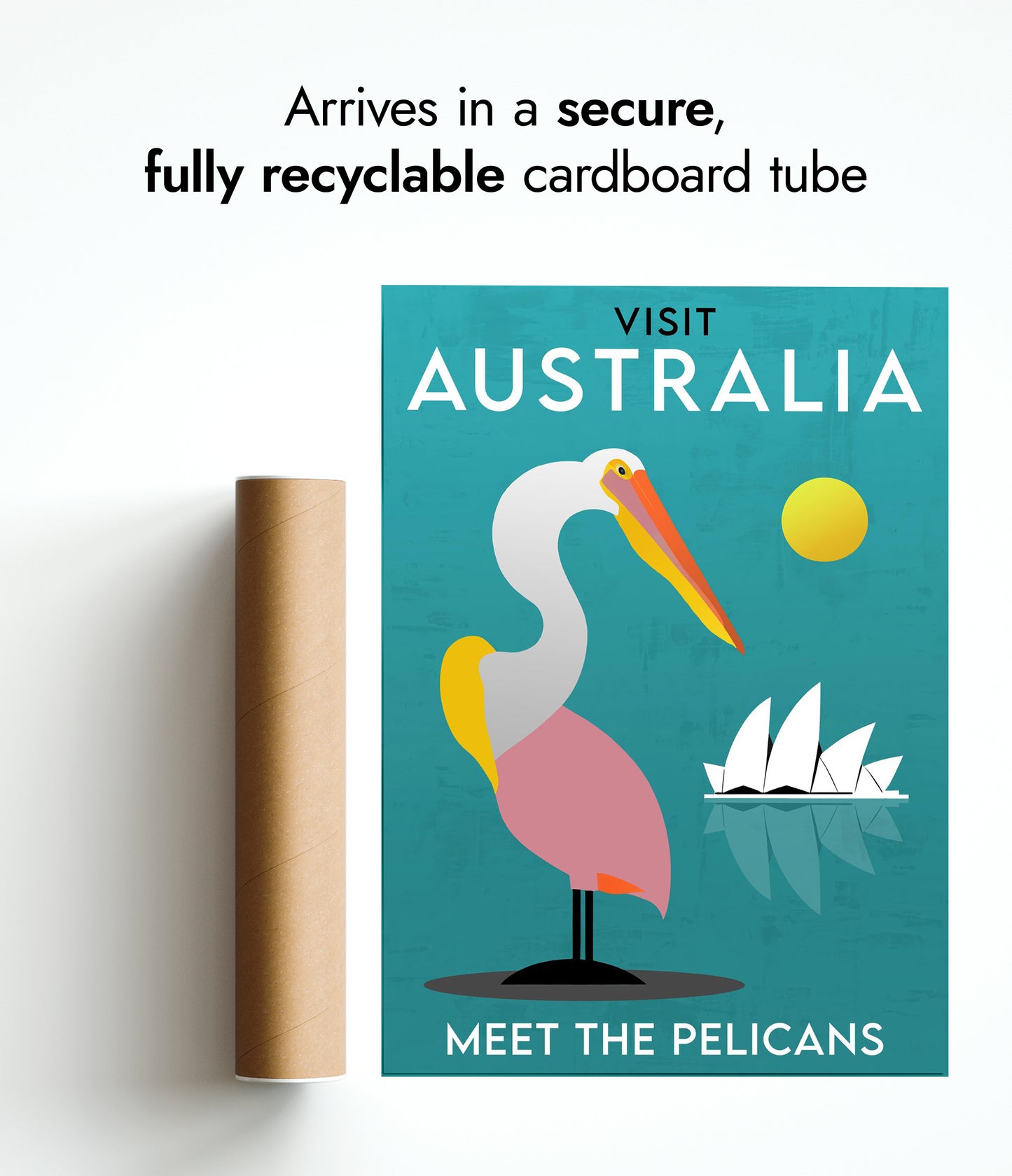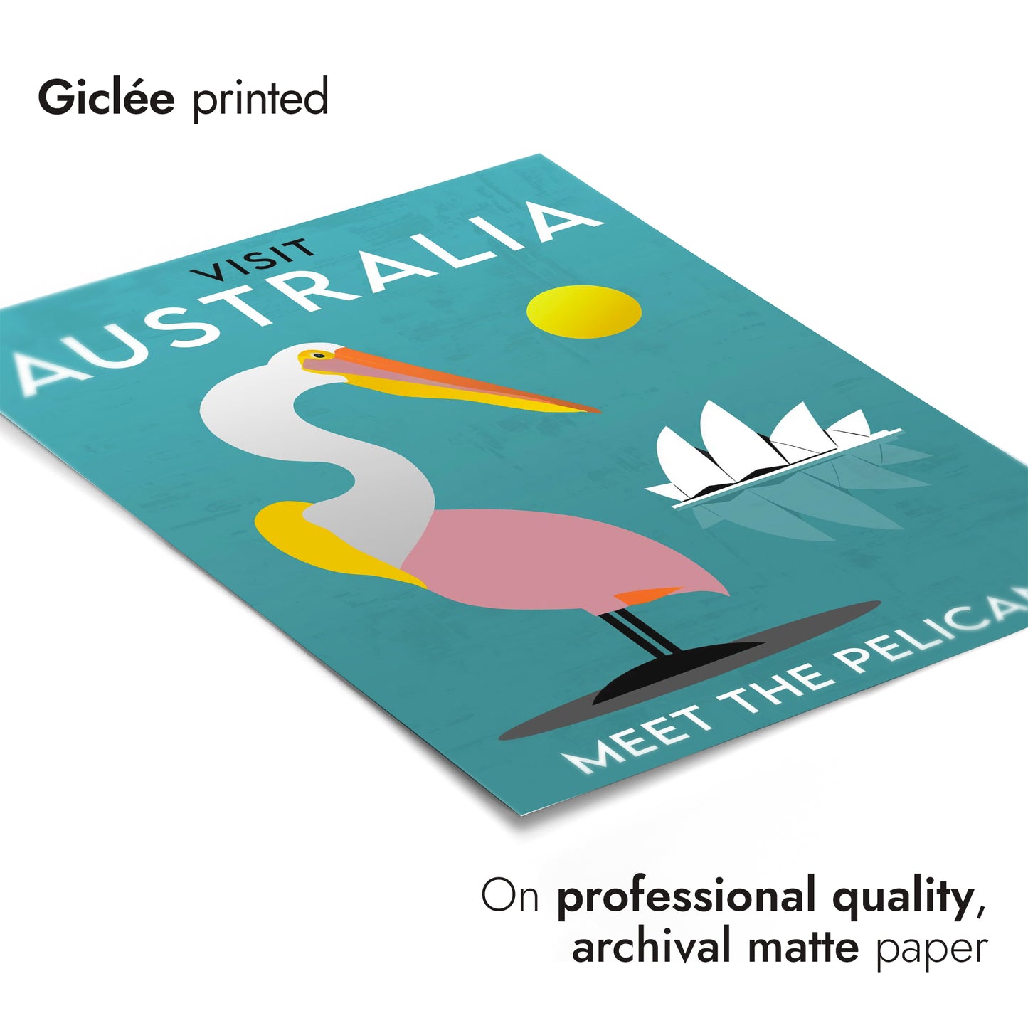 This vintage-style travel poster features a stylized illustration of a pelican set against a tranquil blue background. The iconic Sydney Opera House and a radiant sun accentuate the Australian theme. Ideal for adding a touch of wanderlust and coastal charm to any space, it captures the allure of Australia's unique wildlife and landmarks.