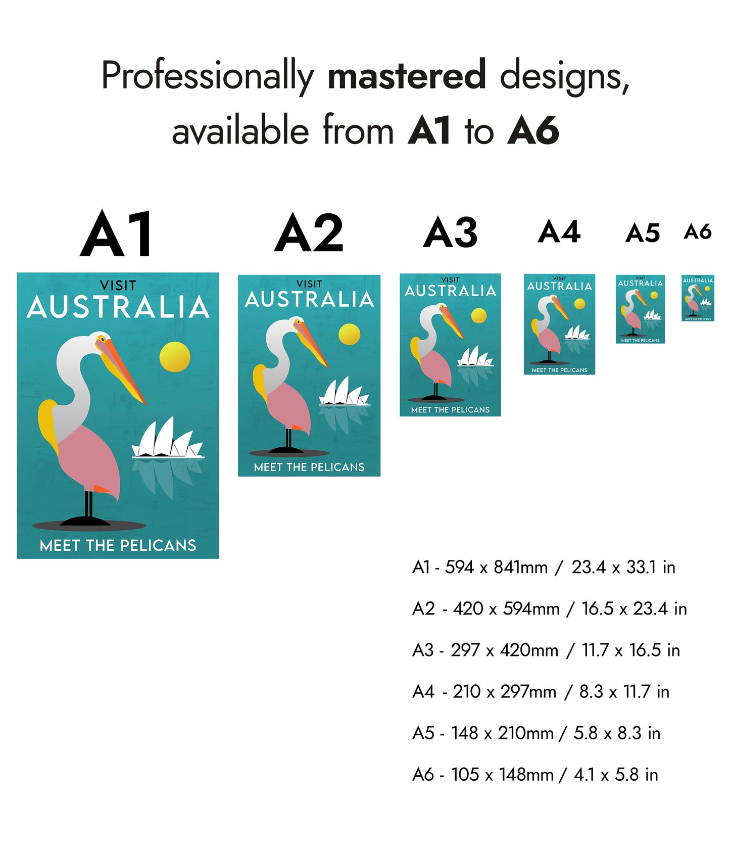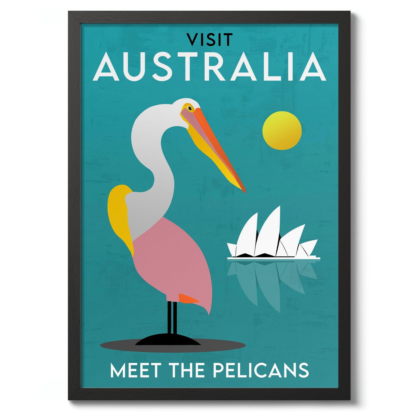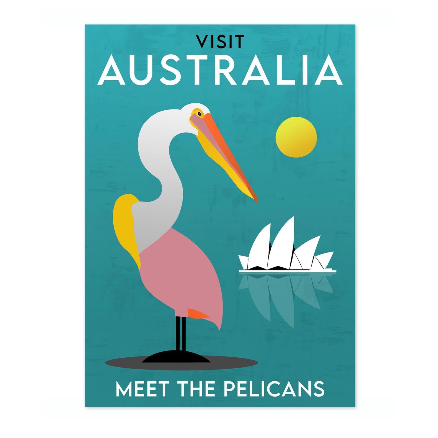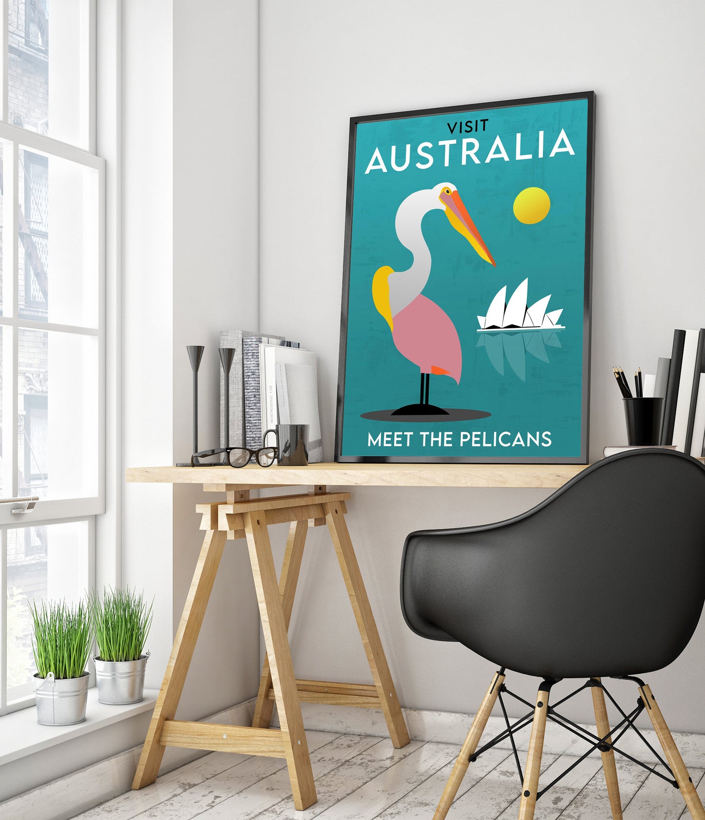 This vintage-style travel poster features a stylized illustration of a pelican set against a tranquil blue background. The iconic Sydney Opera House and a radiant sun accentuate the Australian theme. Ideal for adding a touch of wanderlust and coastal charm to any space, it captures the allure of Australia's unique wildlife and landmarks.