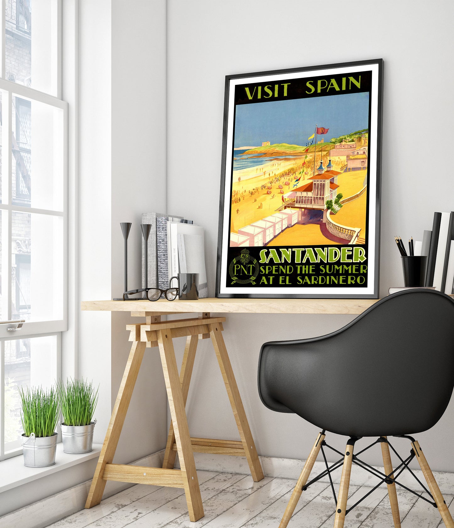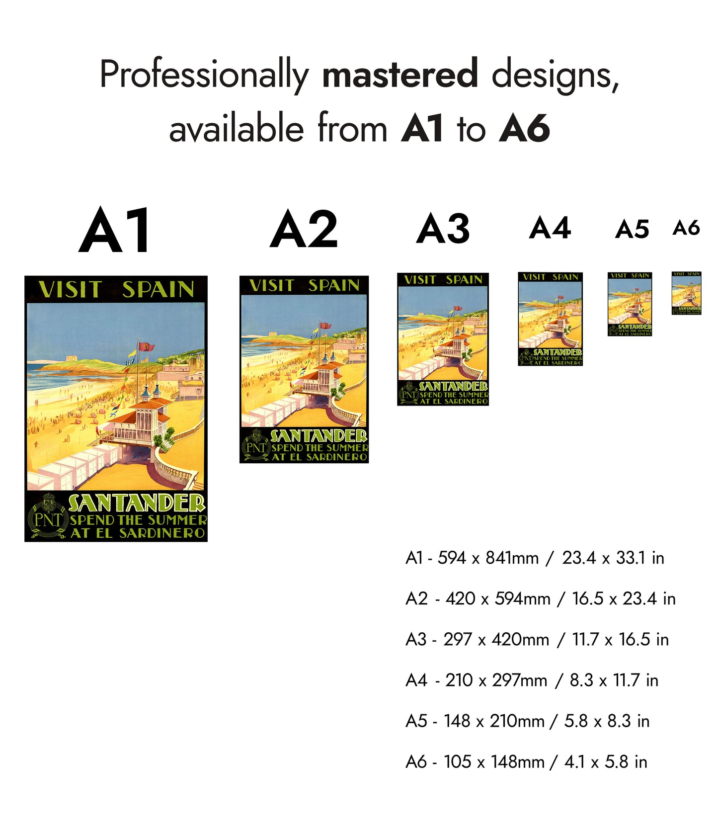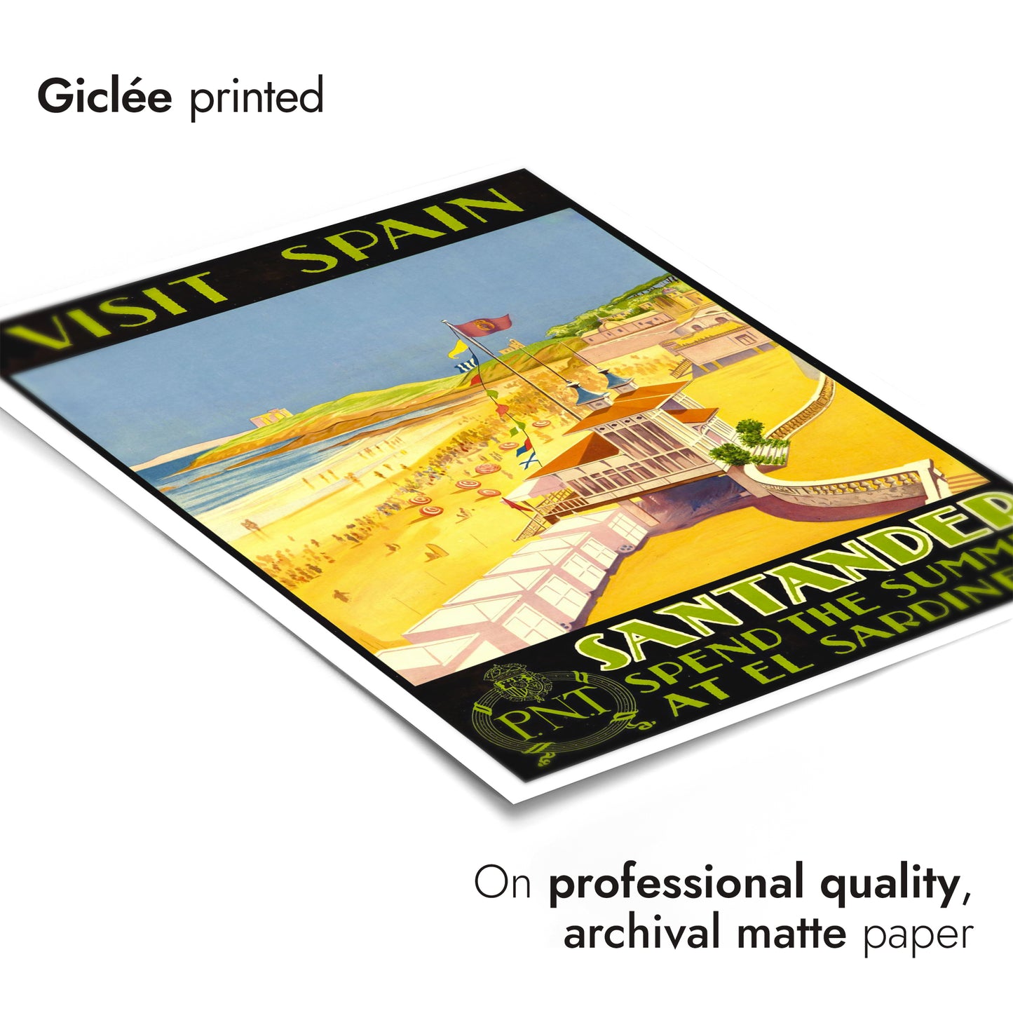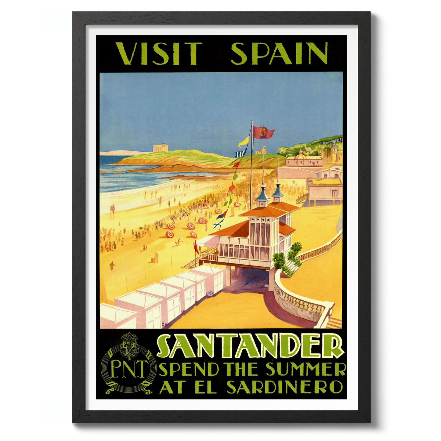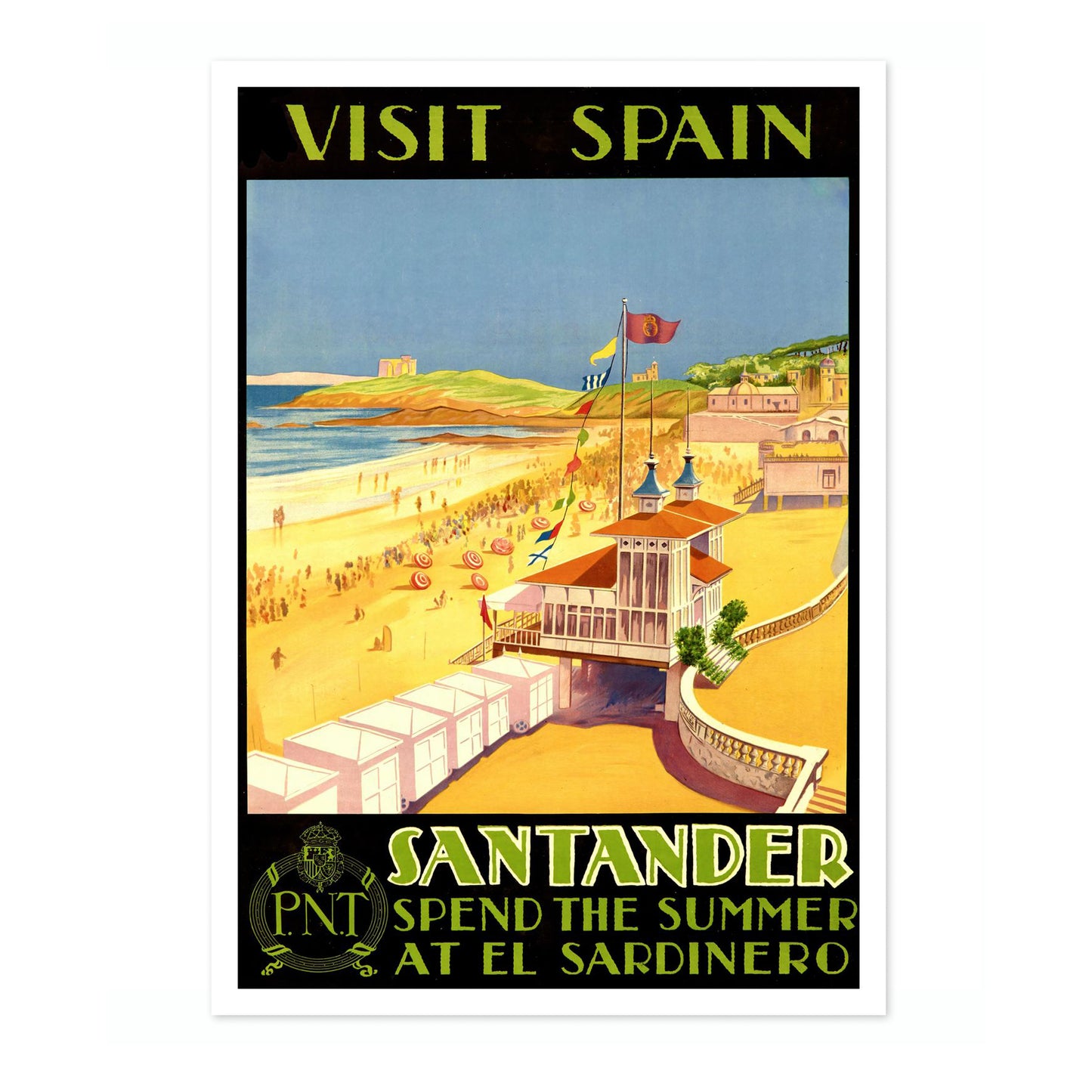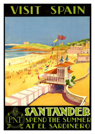 This vintage-style travel poster captures the vibrant seaside appeal of Santander, Spain, at El Sardinero beach. Featuring a lively beach scene with colorful parasols, the image invites viewers to experience coastal summers. The poster's bold black and yellow palette enhances its nostalgic allure, evoking the charm of early 20th-century travel advertisements. Perfect for enthusiasts of classic travel illustration.