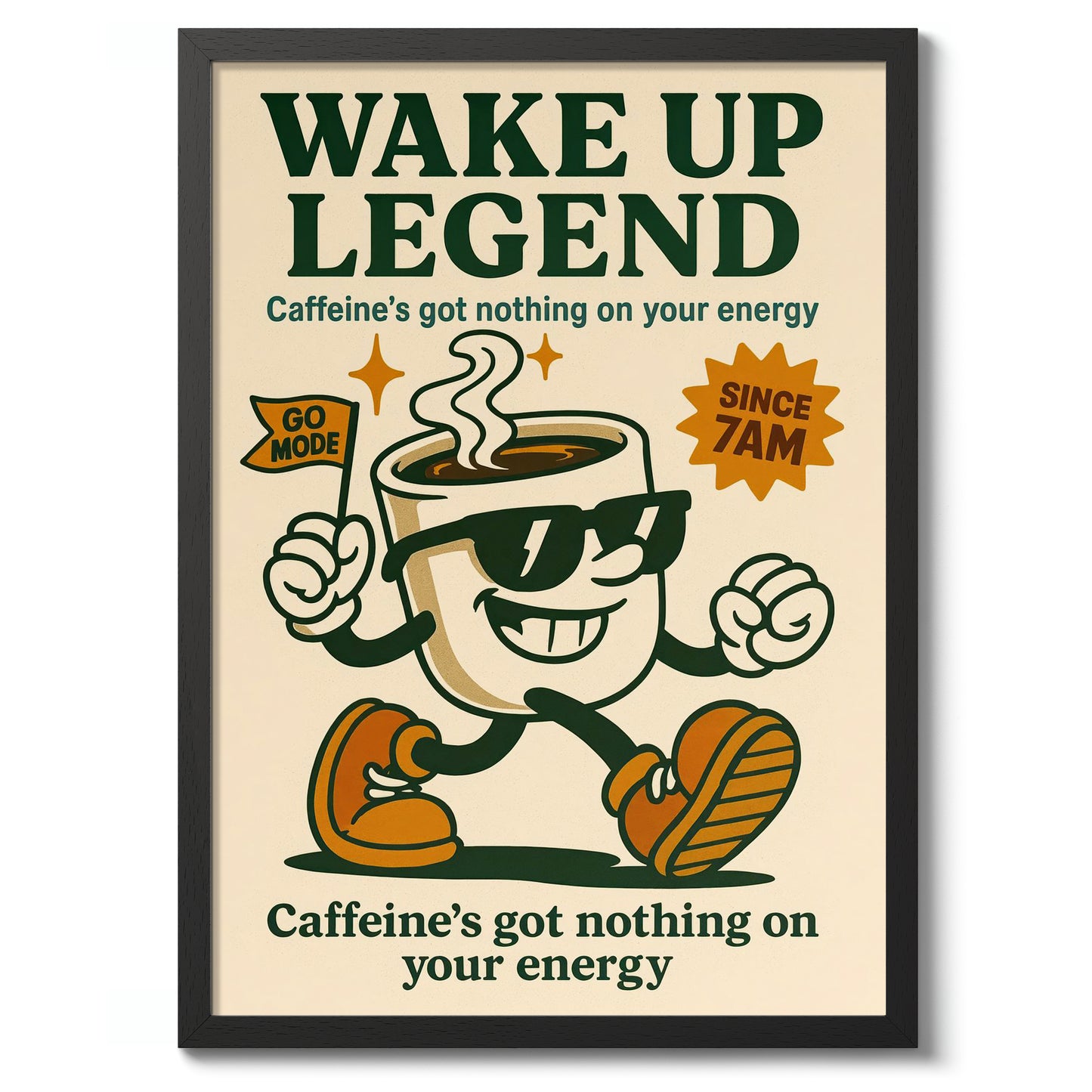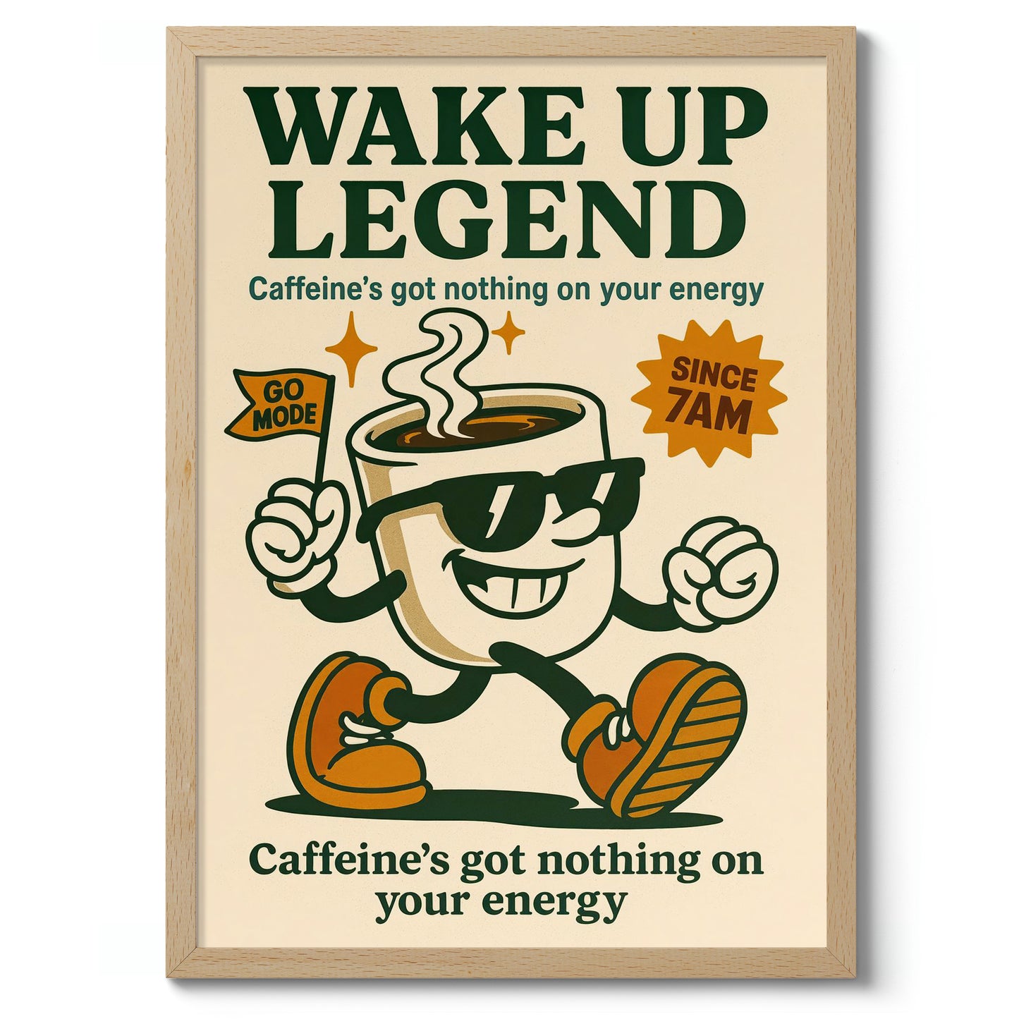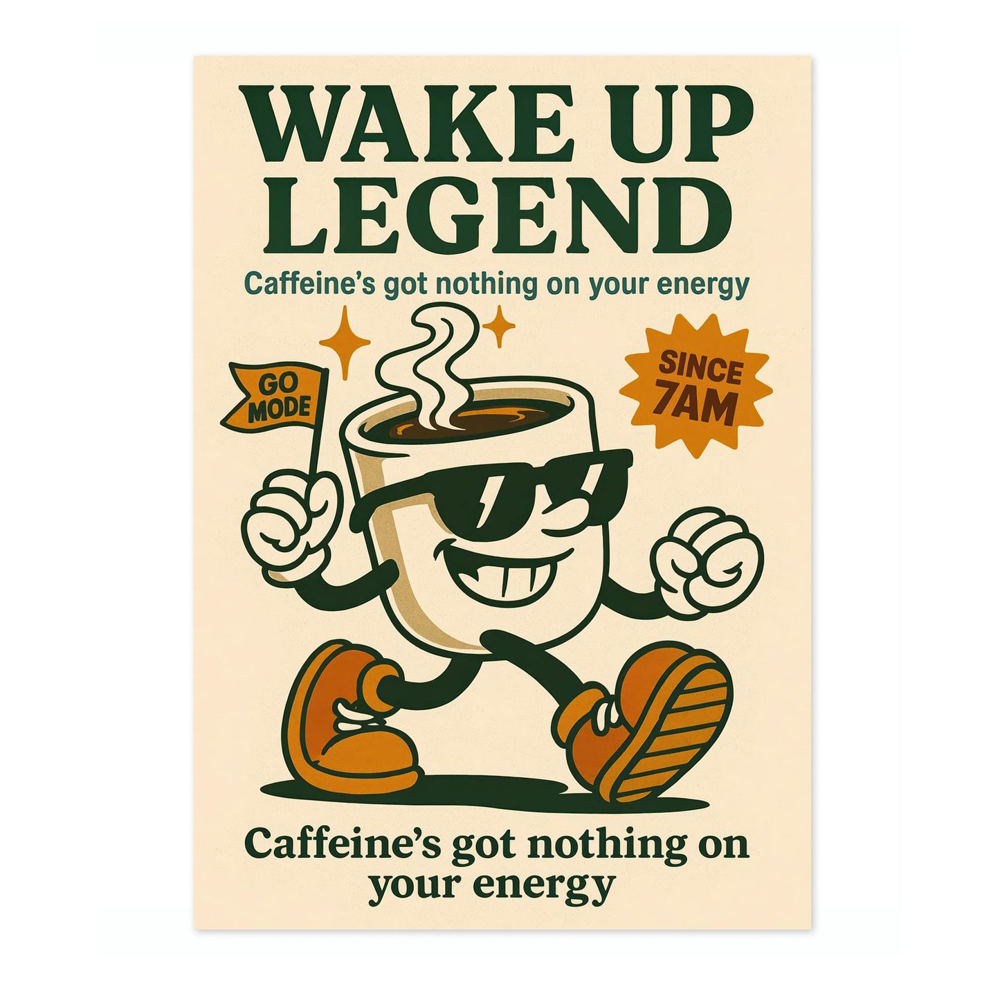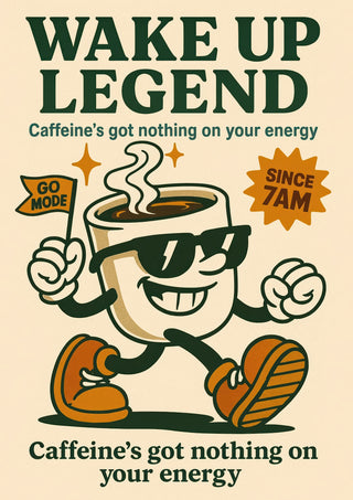 The "Wake Up Legend" poster features a vintage-inspired illustration of a cheerful coffee cup mascot with sunglasses and sneakers, exuding energetic vibes. Set against a beige backdrop, the typographic design boldly proclaims, "Caffeine's got nothing on your energy," perfect for espresso and coffee lovers seeking motivational decor. The retro aesthetics charm with its classic cartoon graphic appeal.