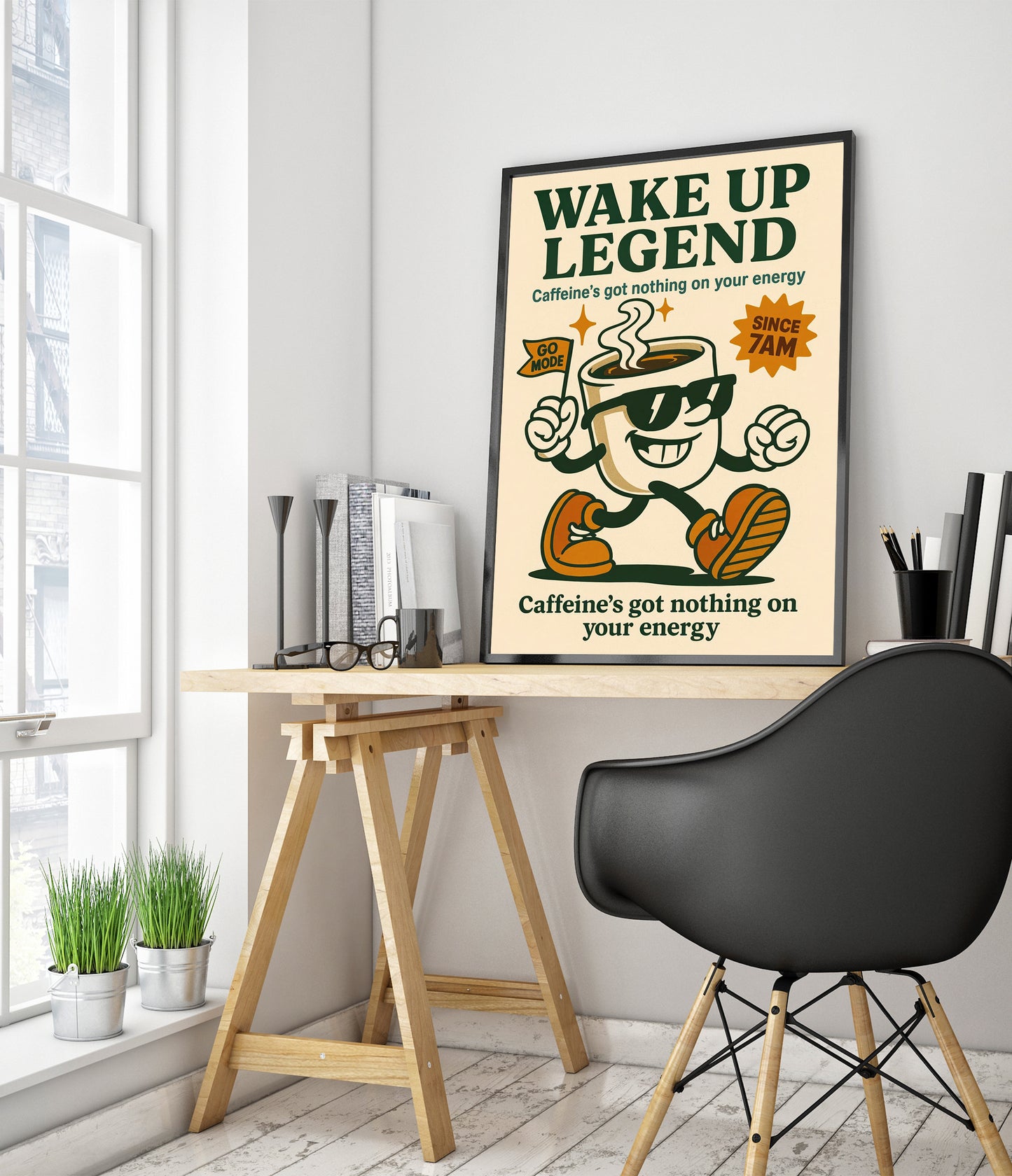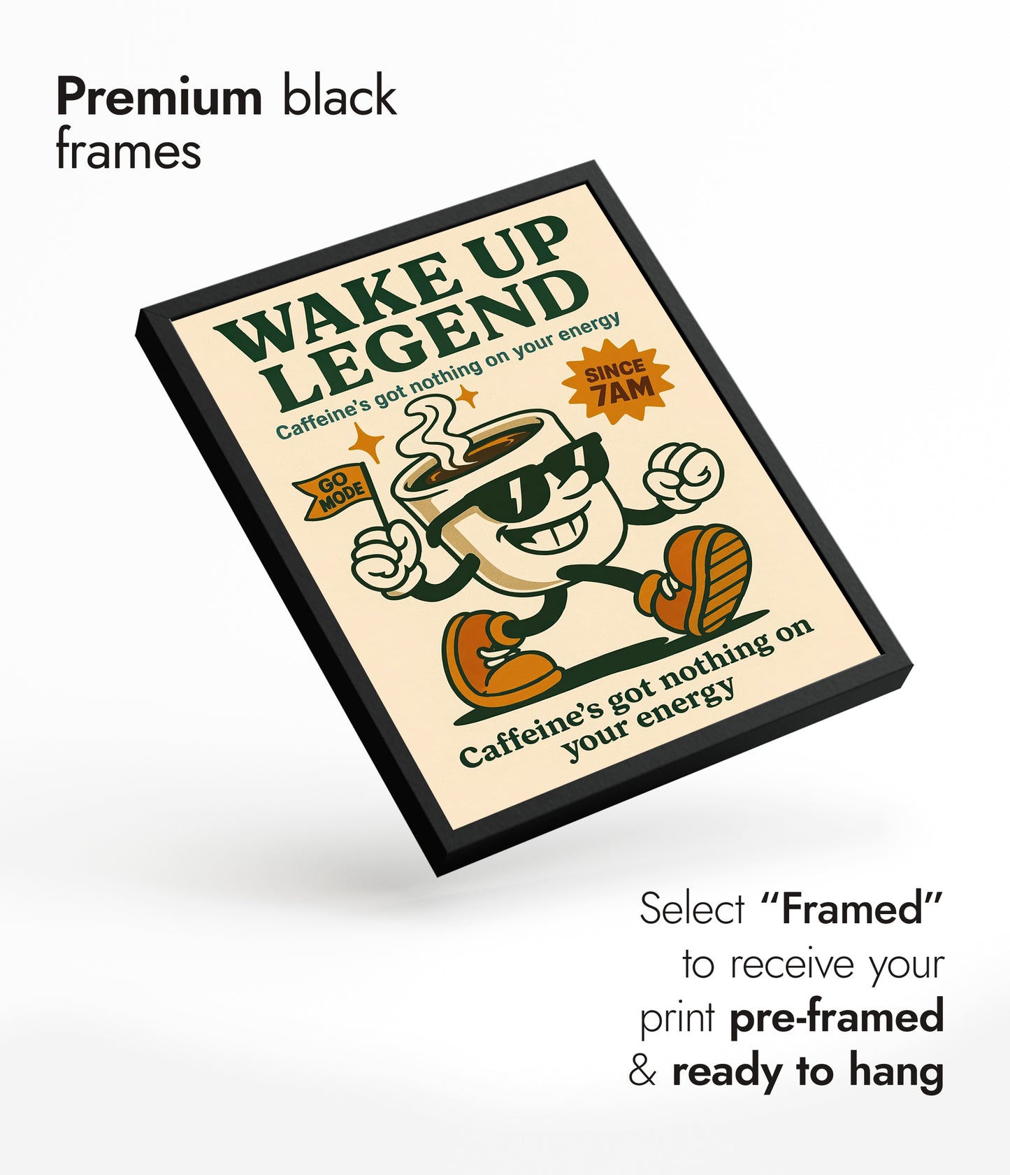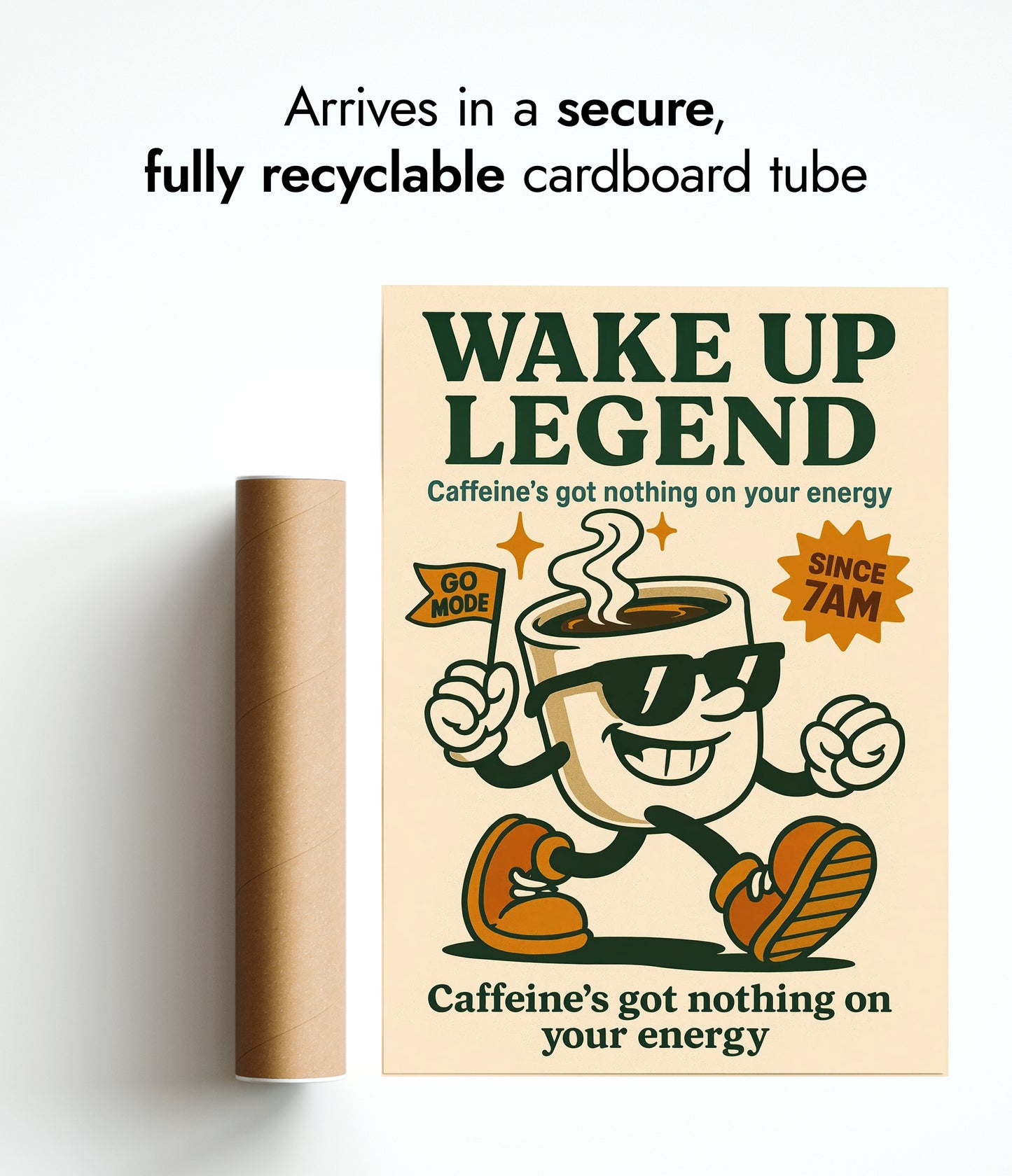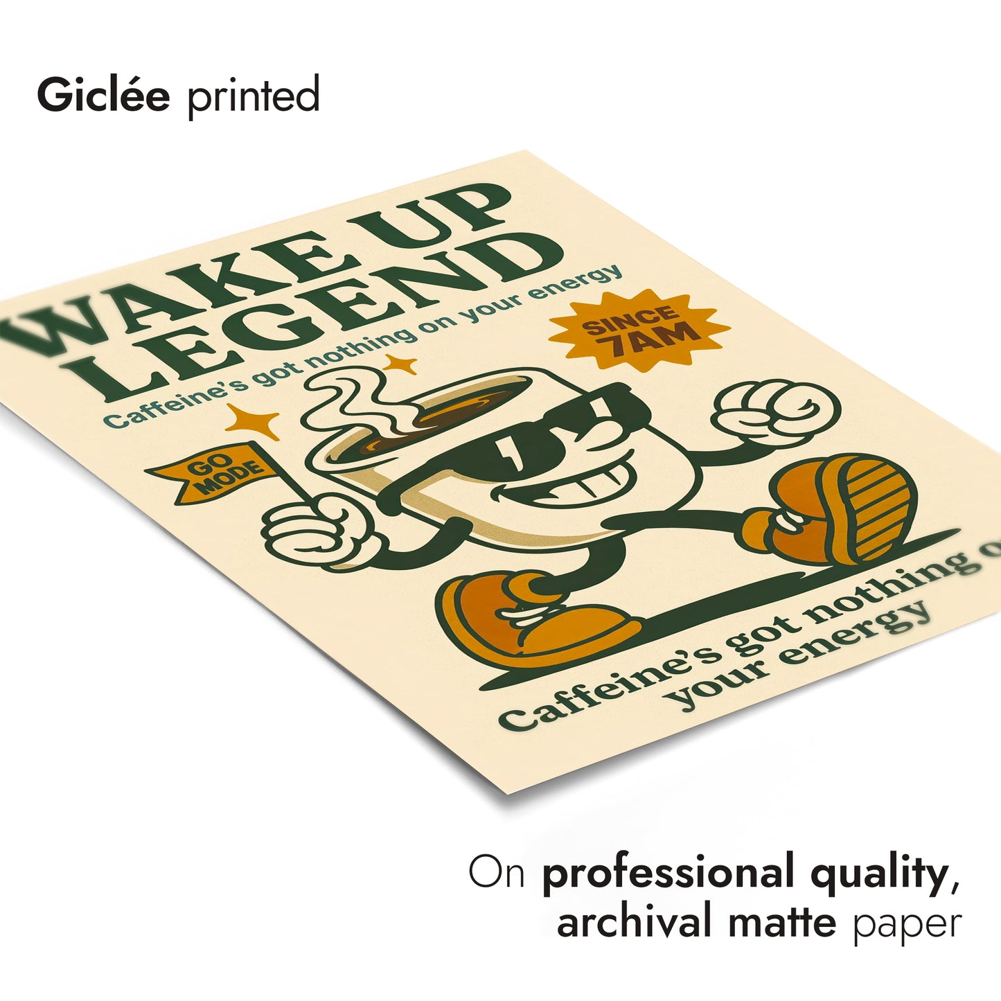 The "Wake Up Legend" poster features a vintage-inspired illustration of a cheerful coffee cup mascot with sunglasses and sneakers, exuding energetic vibes. Set against a beige backdrop, the typographic design boldly proclaims, "Caffeine's got nothing on your energy," perfect for espresso and coffee lovers seeking motivational decor. The retro aesthetics charm with its classic cartoon graphic appeal.