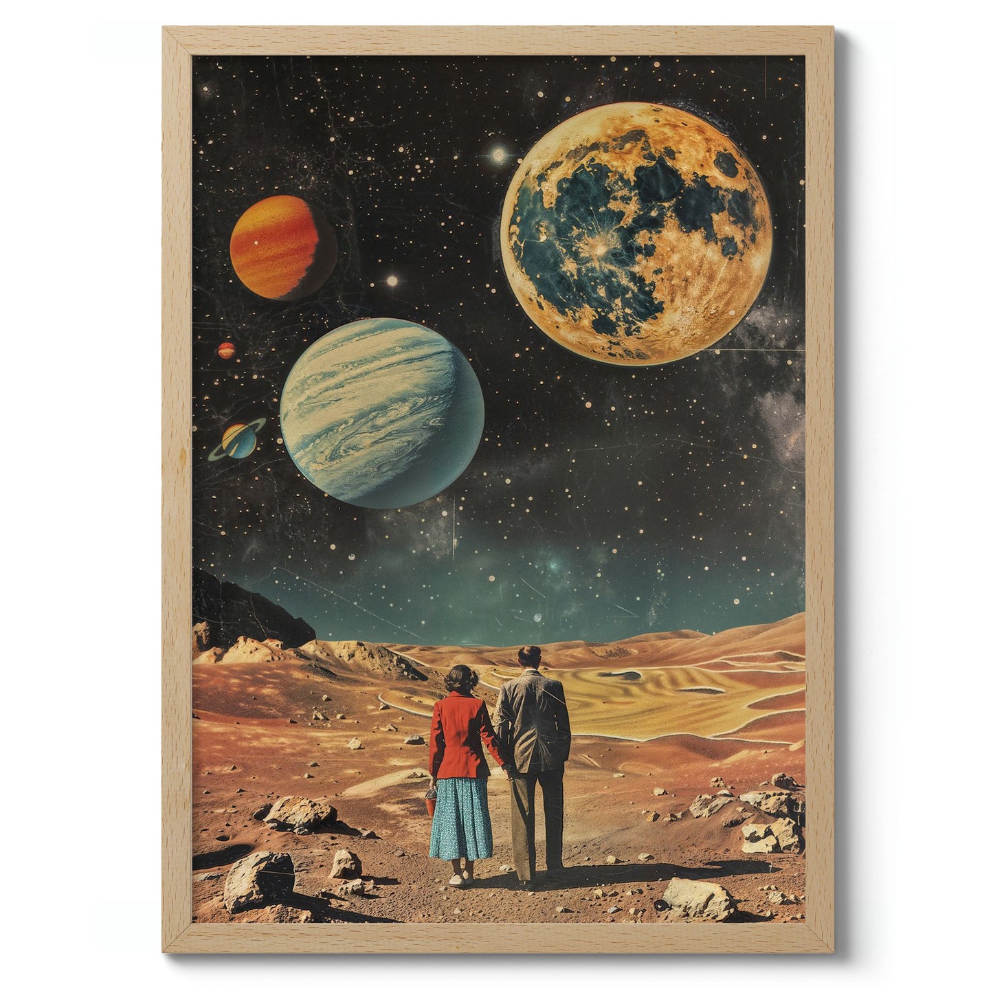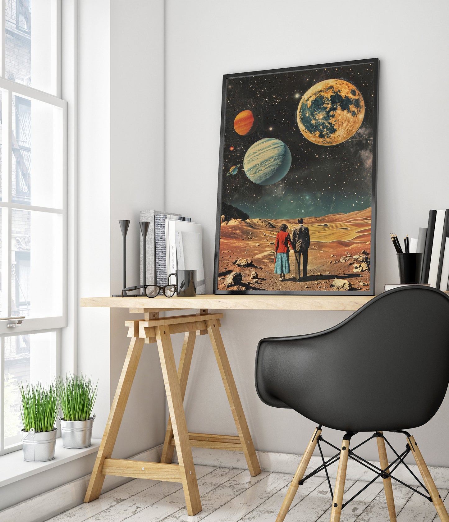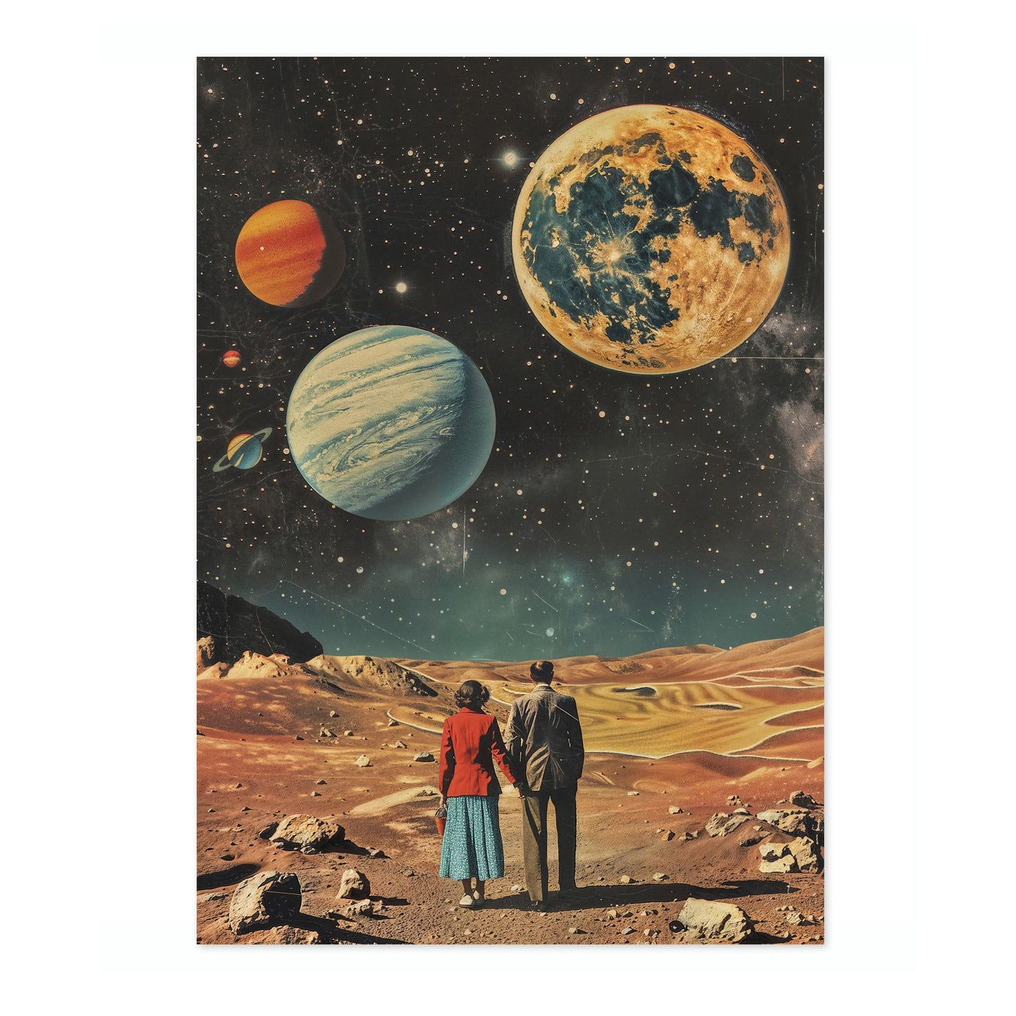 This vintage-style poster, titled "Walk on the Moon," depicts a couple strolling across a lunar landscape beneath a sky crowded with vividly detailed planets. The artwork blends retro graphic illustration with sci-fi themes, capturing the awe of space exploration. Ideal for enthusiasts of vintage art and space-themed decor, it offers a whimsical take on celestial adventures.