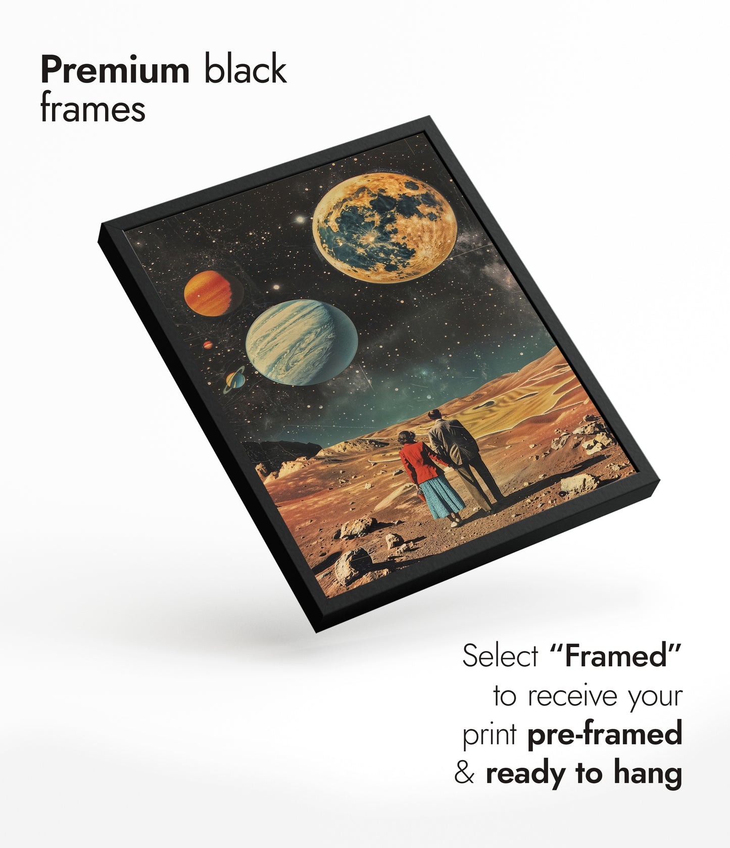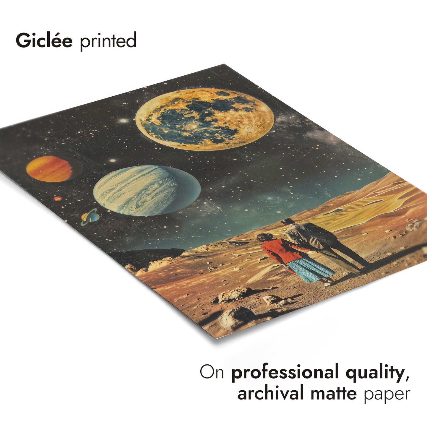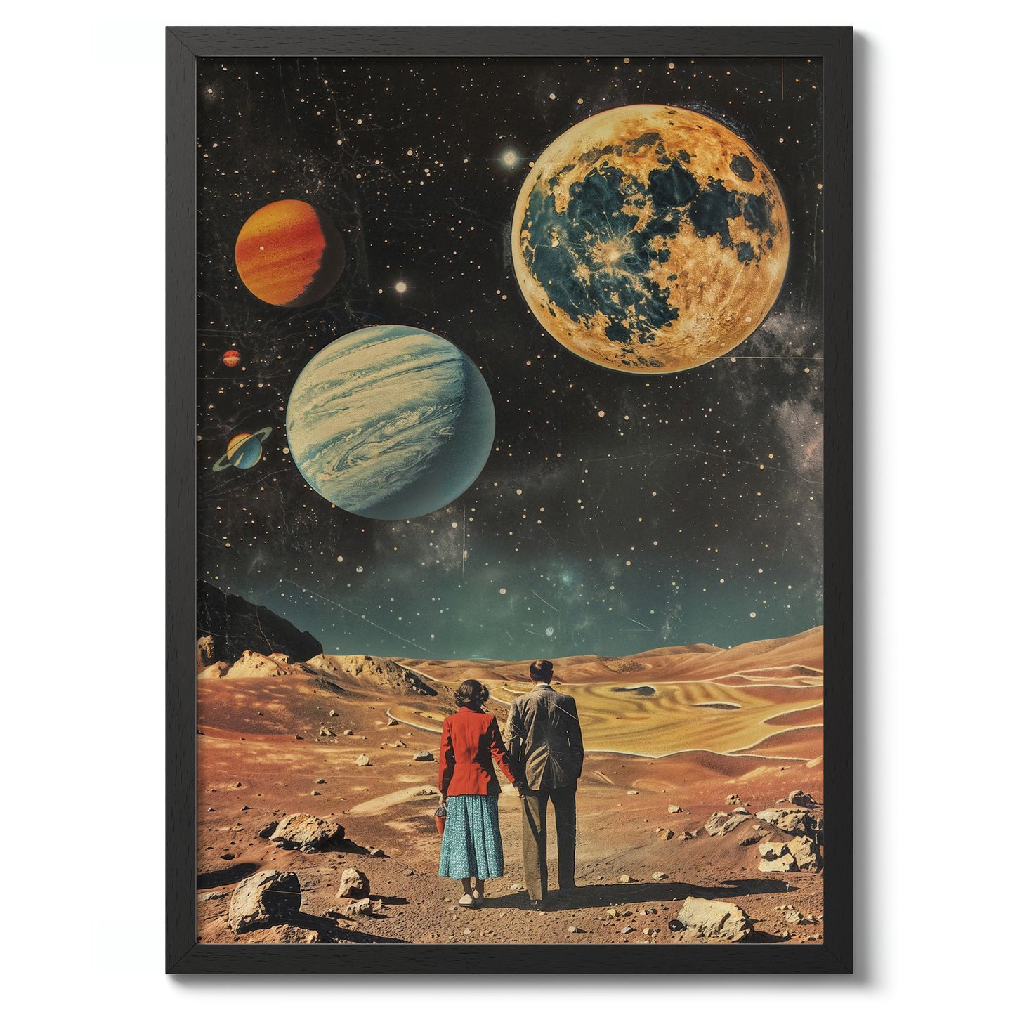 This vintage-style poster, titled "Walk on the Moon," depicts a couple strolling across a lunar landscape beneath a sky crowded with vividly detailed planets. The artwork blends retro graphic illustration with sci-fi themes, capturing the awe of space exploration. Ideal for enthusiasts of vintage art and space-themed decor, it offers a whimsical take on celestial adventures.