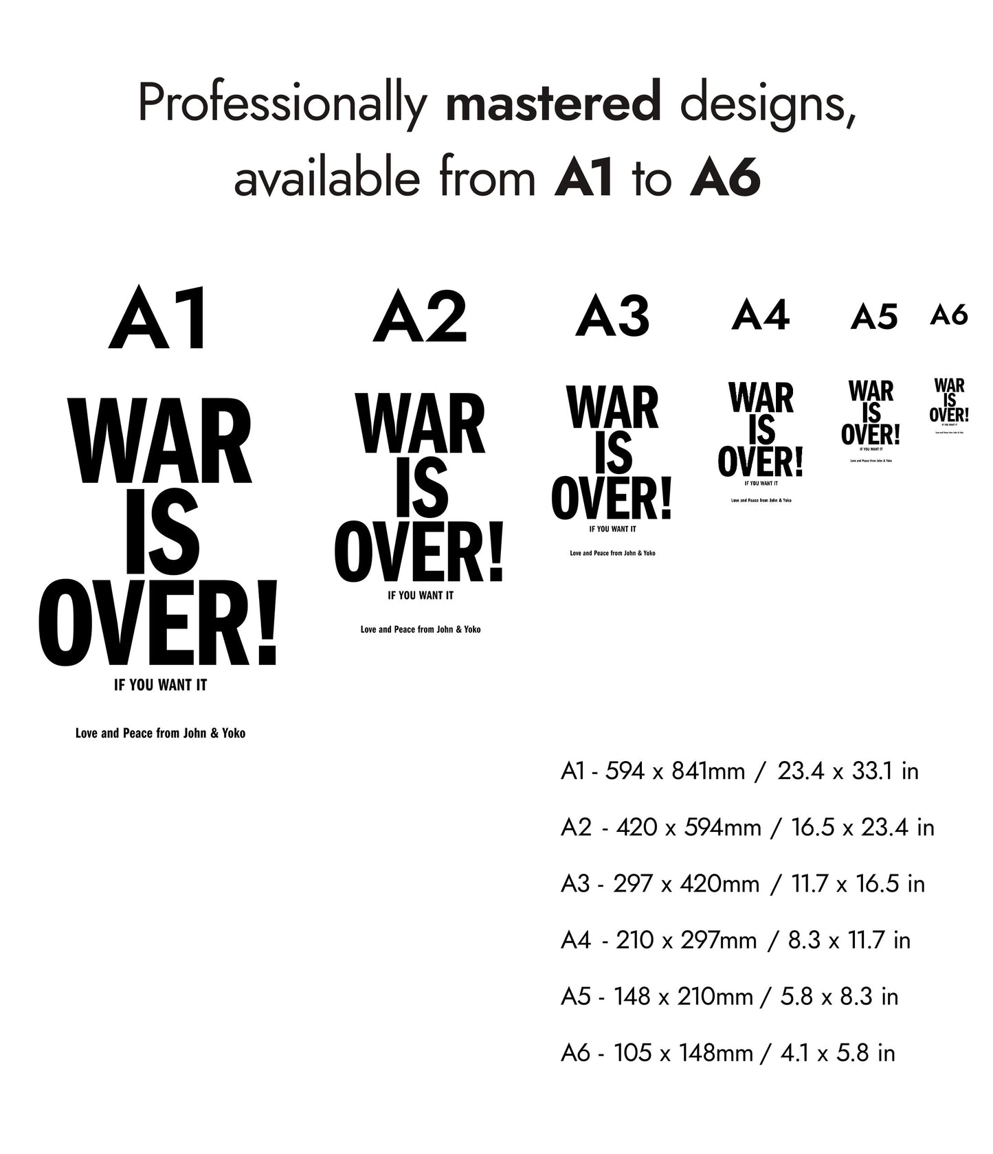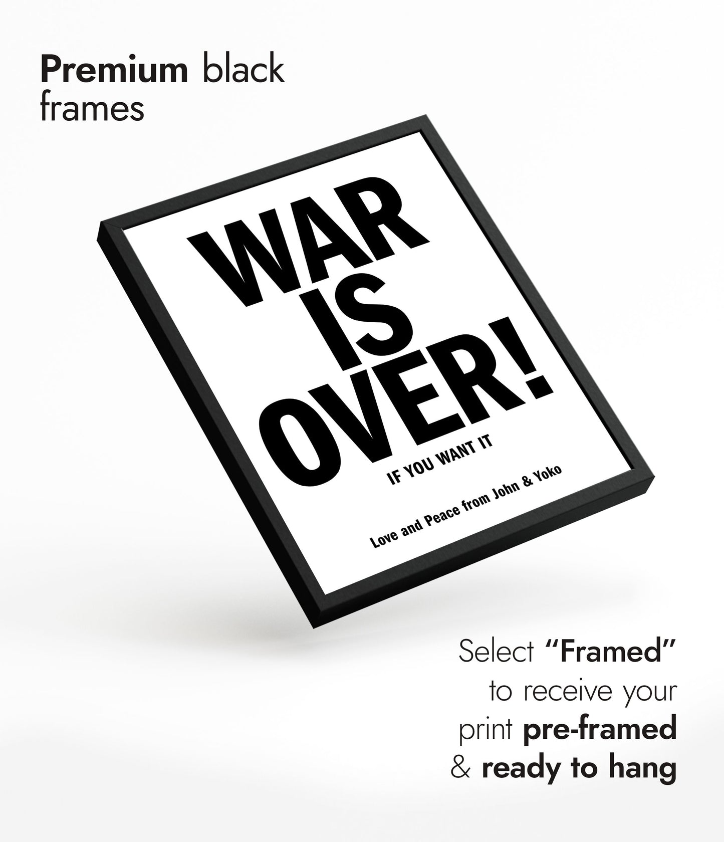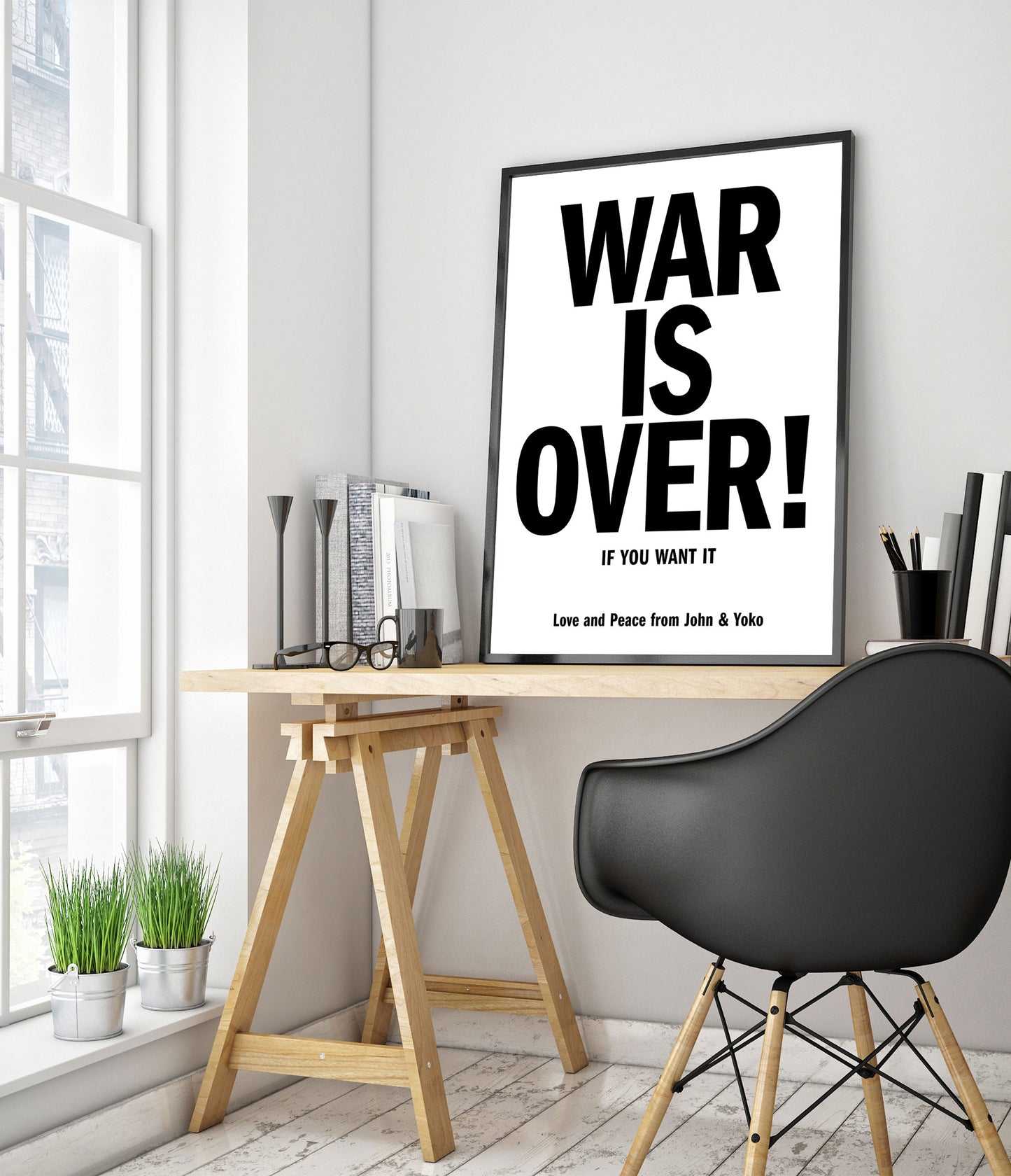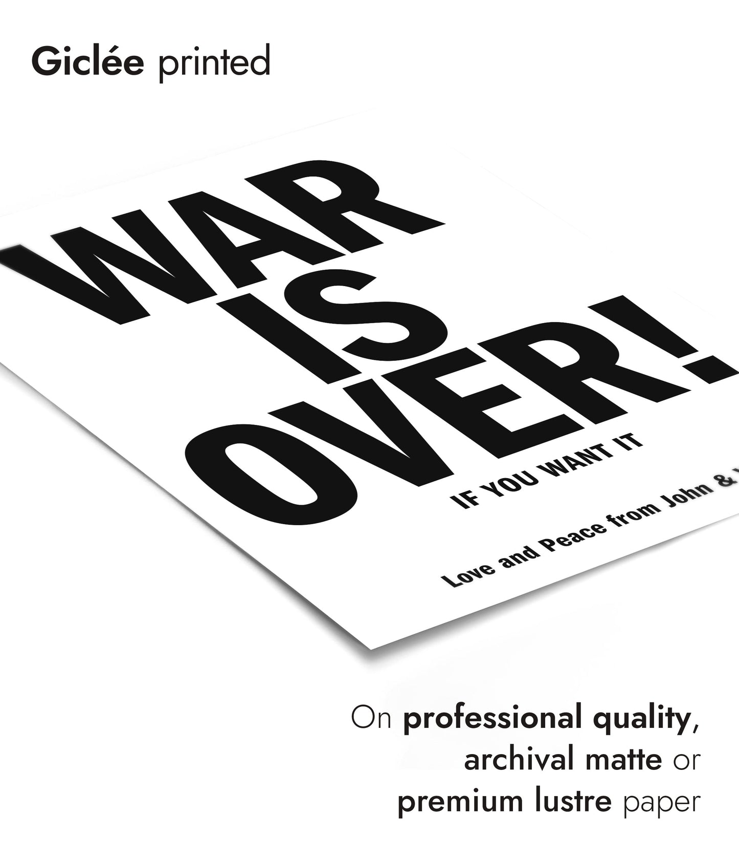 This minimalist typography poster features the bold statement "WAR IS OVER! IF YOU WANT IT" with a subtle message of love and peace from John & Yoko beneath. The stark black text on a clean white background exudes a vintage and graphic style, making a strong, impactful statement suitable for modern interiors.