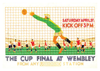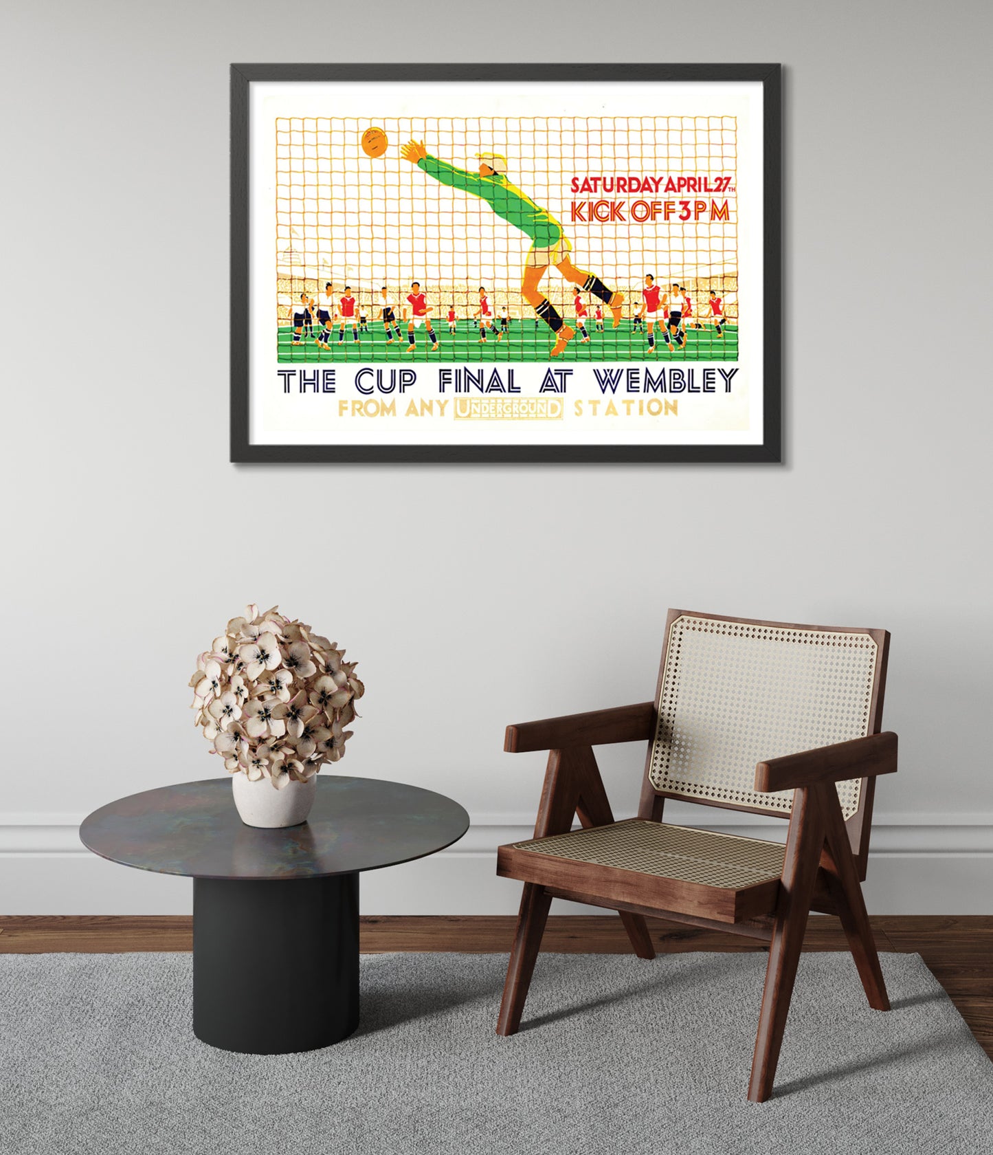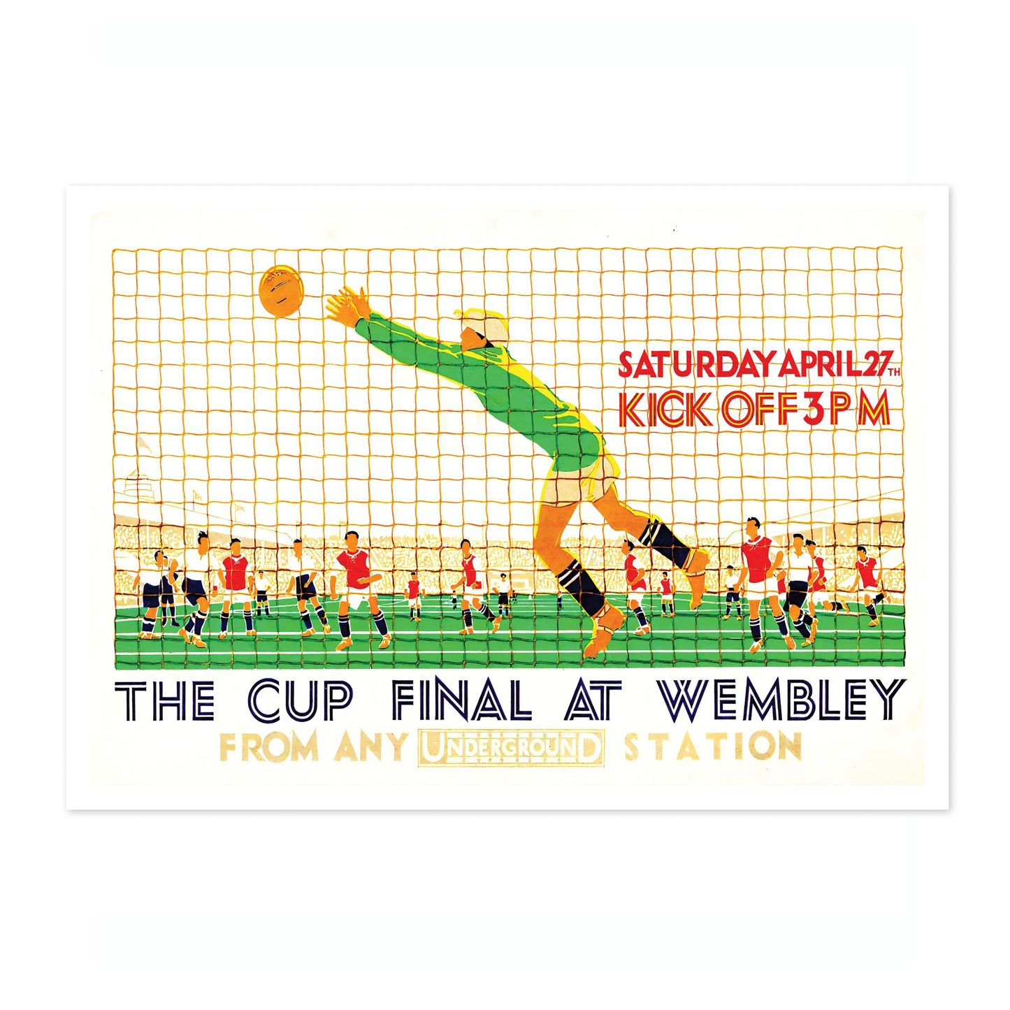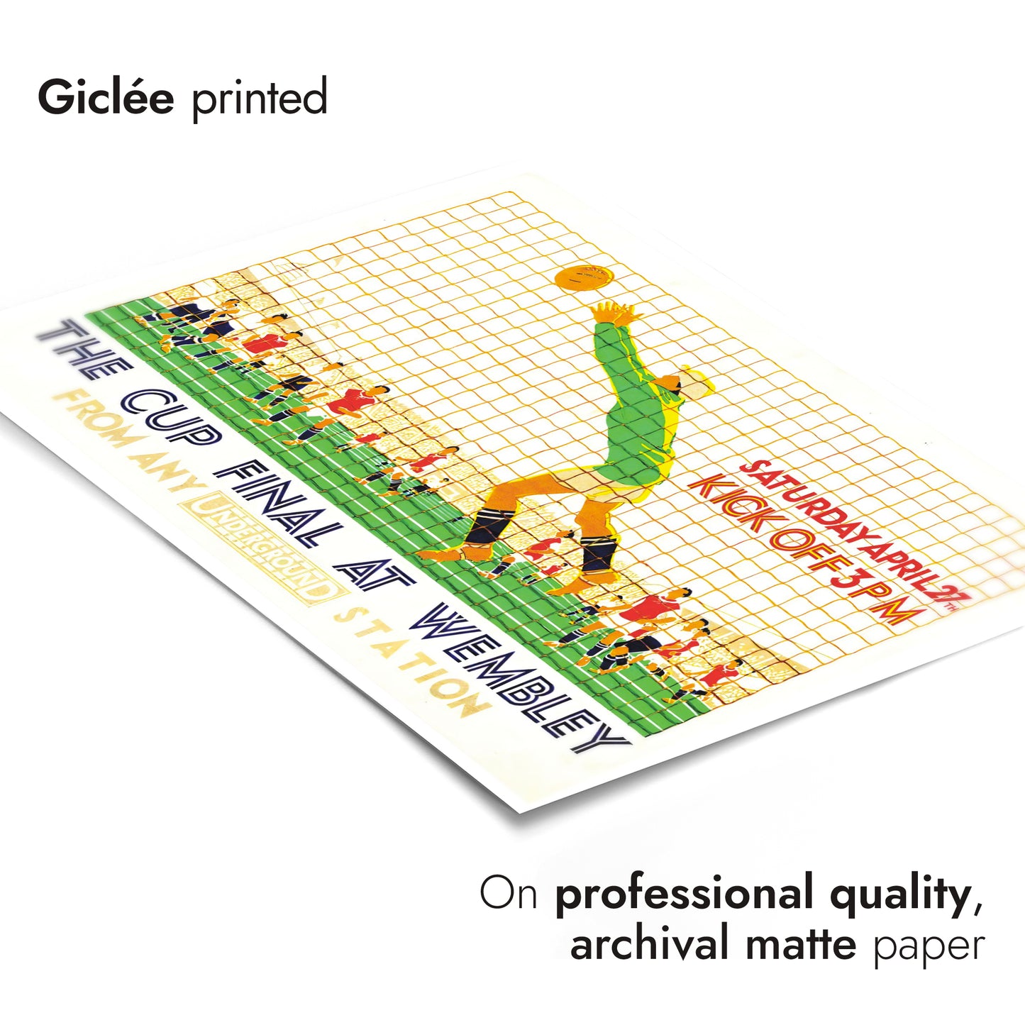This vintage poster, "Wembley Cup Final, Underground," captures the dynamic moment of a football match at Wembley Stadium. Featuring a vibrant goalkeeper in green leaping to save the ball, the illustration exudes sports energy and historical charm. The bold text highlights the event's details, with the London Underground logo, evoking a classic connection to London's sporting heritage. Perfect for football and vintage poster enthusiasts.