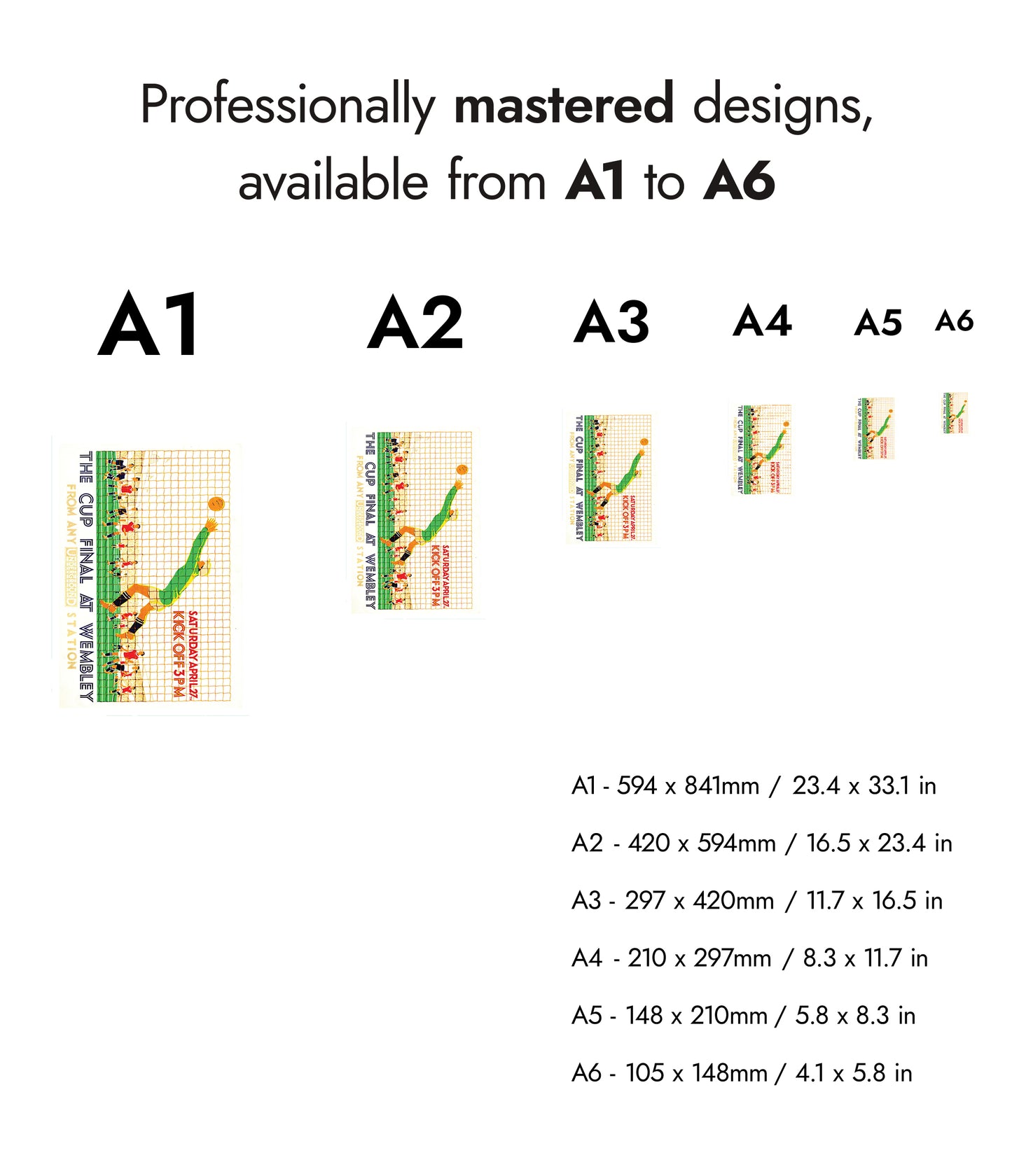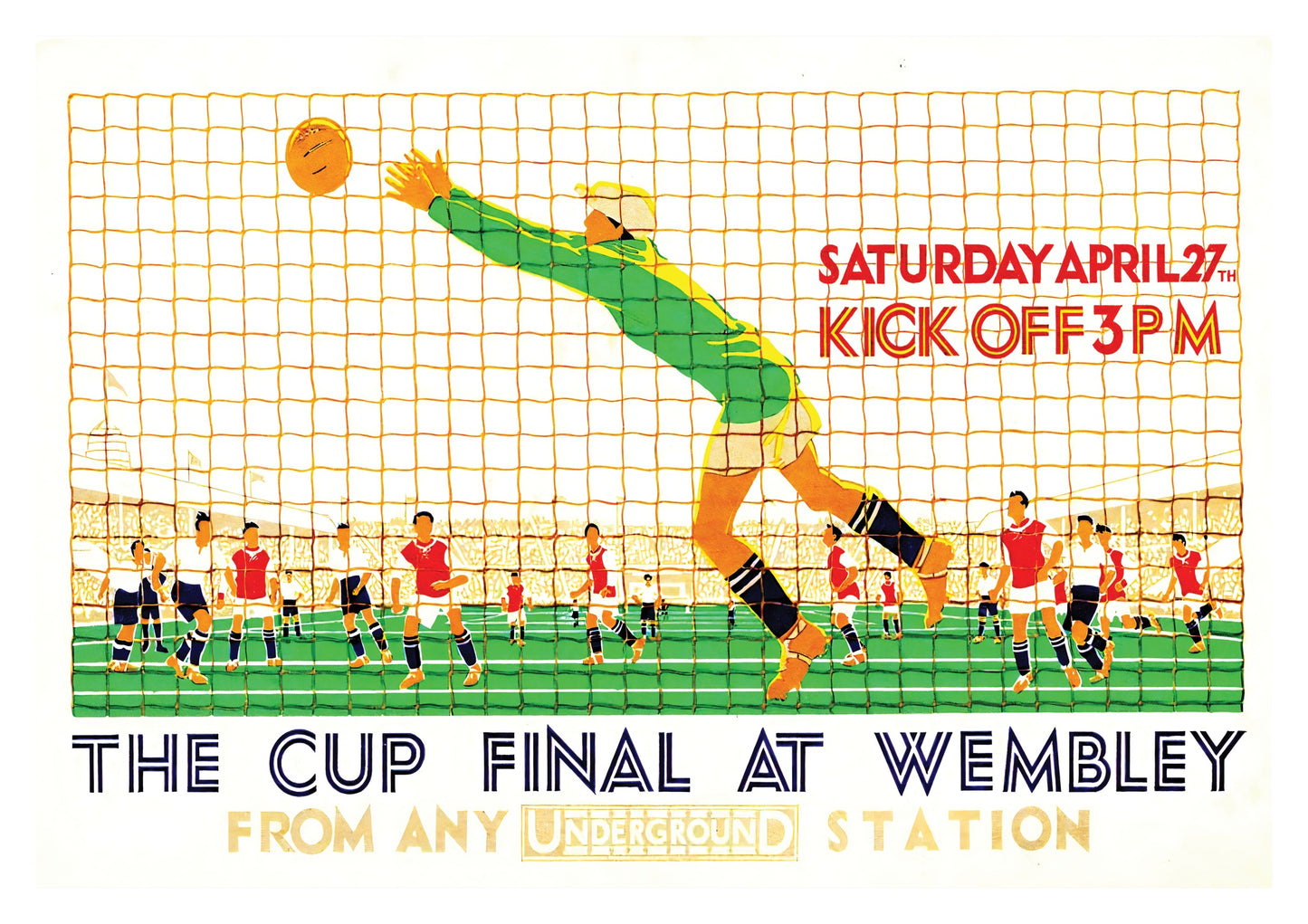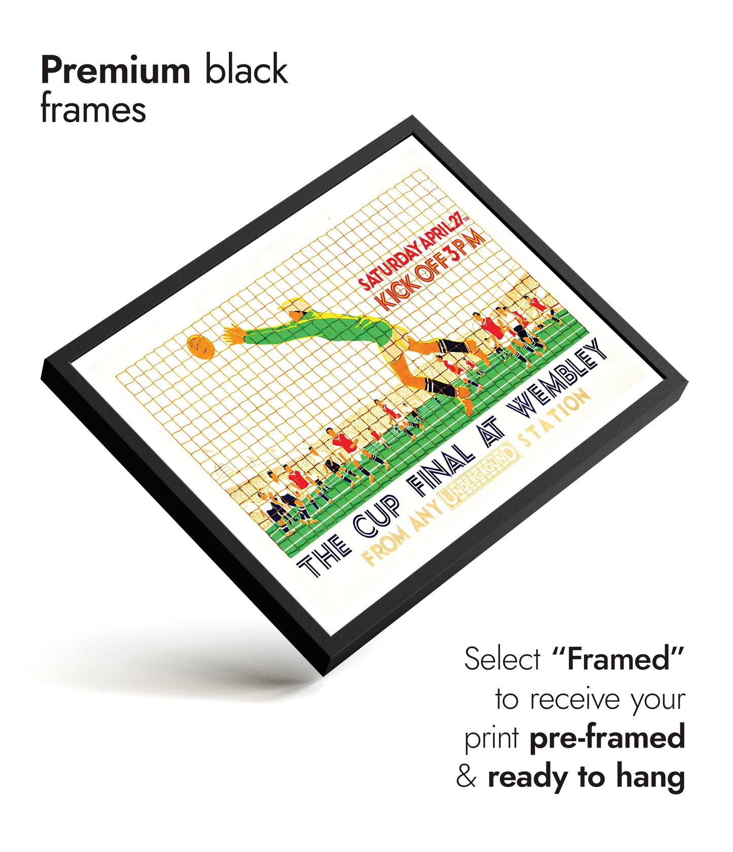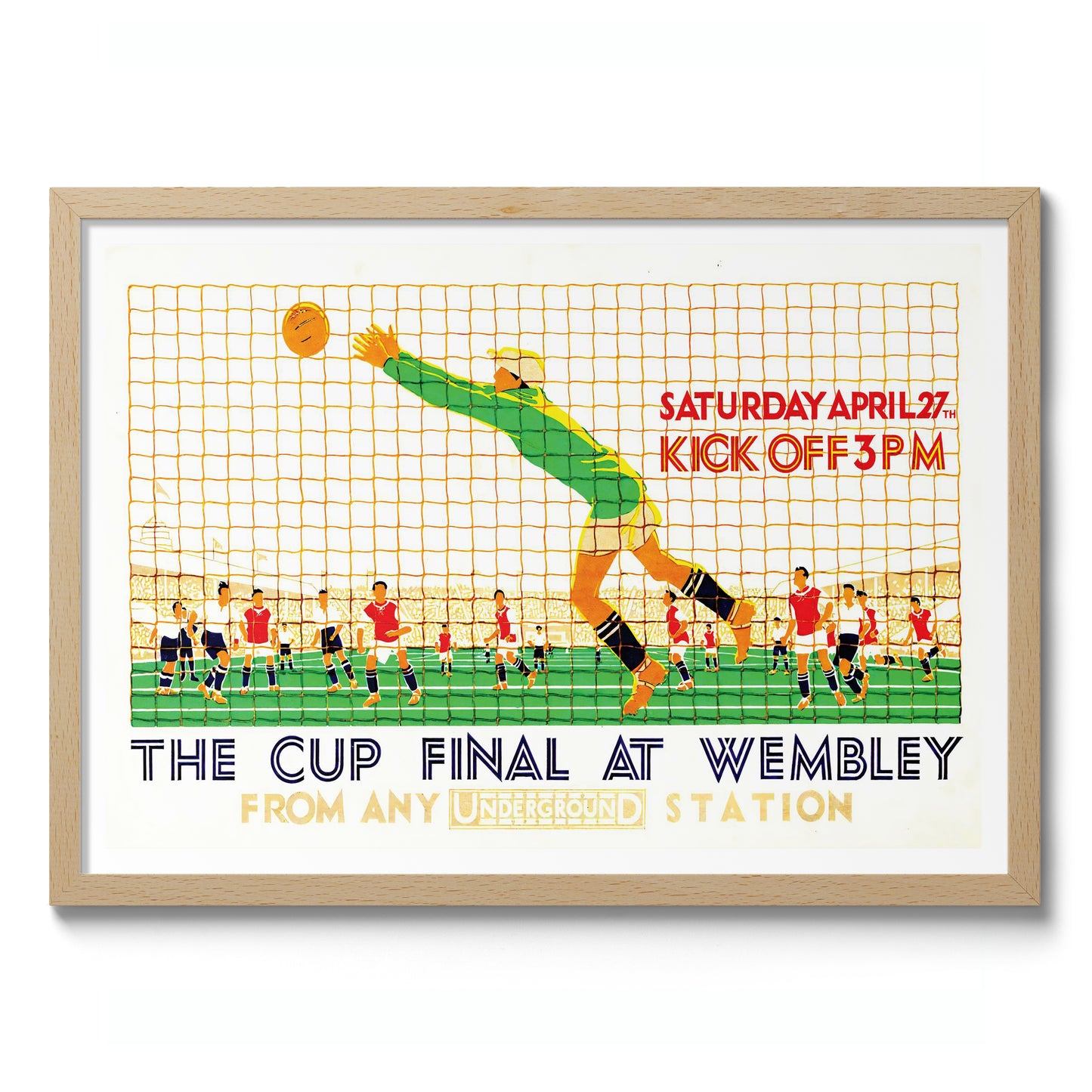 This vintage poster, "Wembley Cup Final, Underground," captures the dynamic moment of a football match at Wembley Stadium. Featuring a vibrant goalkeeper in green leaping to save the ball, the illustration exudes sports energy and historical charm. The bold text highlights the event's details, with the London Underground logo, evoking a classic connection to London's sporting heritage. Perfect for football and vintage poster enthusiasts.