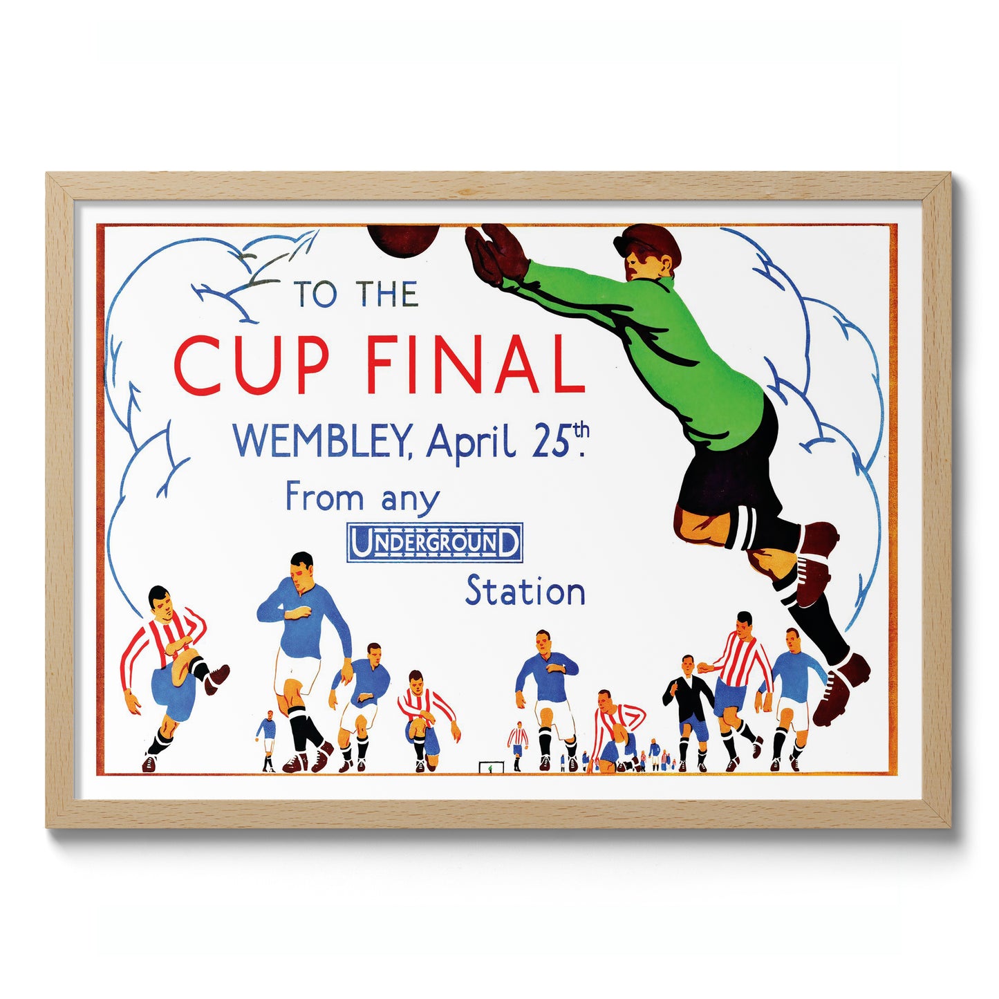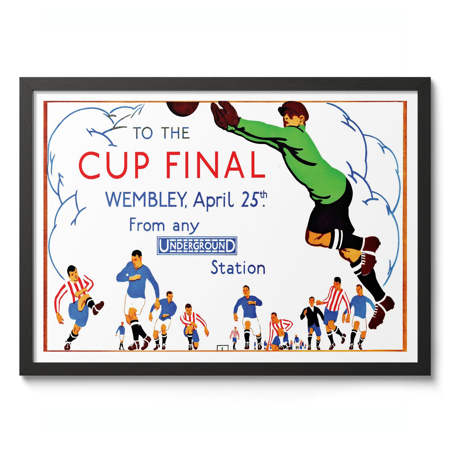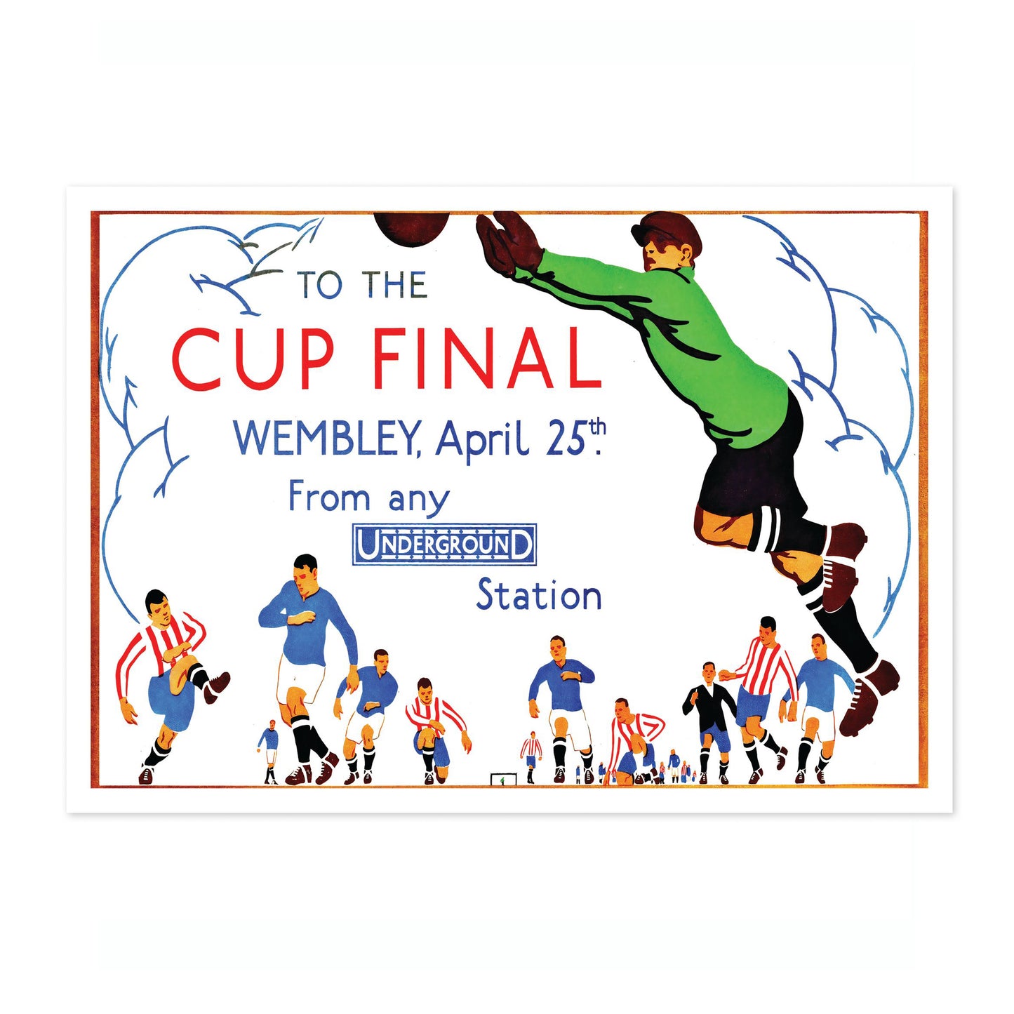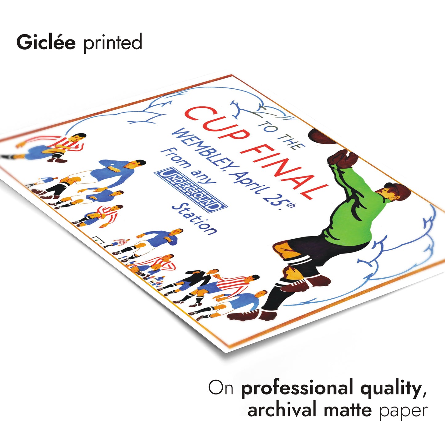 This vintage-style poster illustrates the excitement of the Wembley Cup Final, emphasizing its accessibility via the London Underground. Featuring energetic footballers in action, the artwork captures the dynamic spirit of the sport. The use of vibrant colors and bold typography effectively conveys the festive atmosphere, making it an appealing choice for football enthusiasts and collectors of historical sports memorabilia.