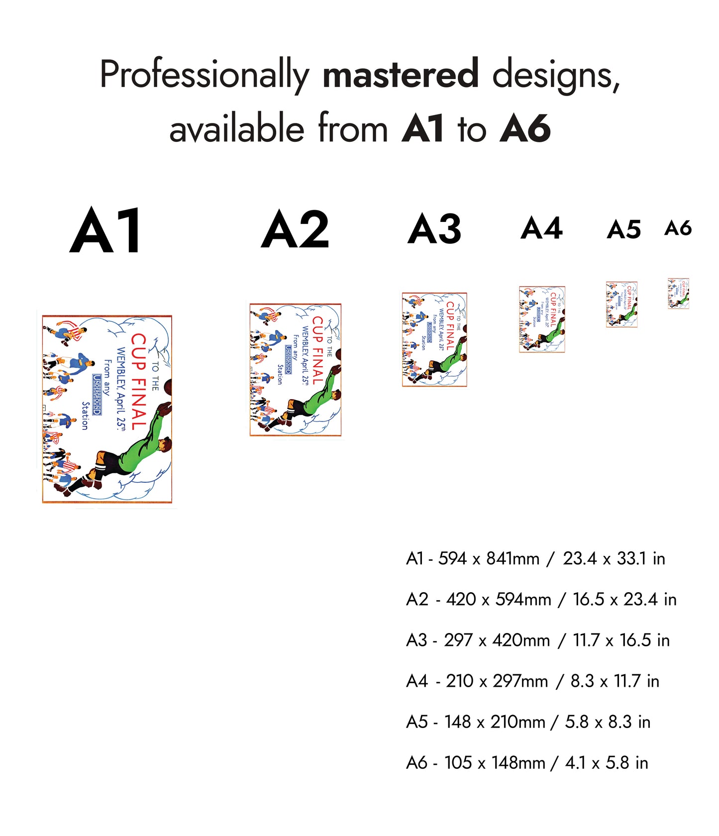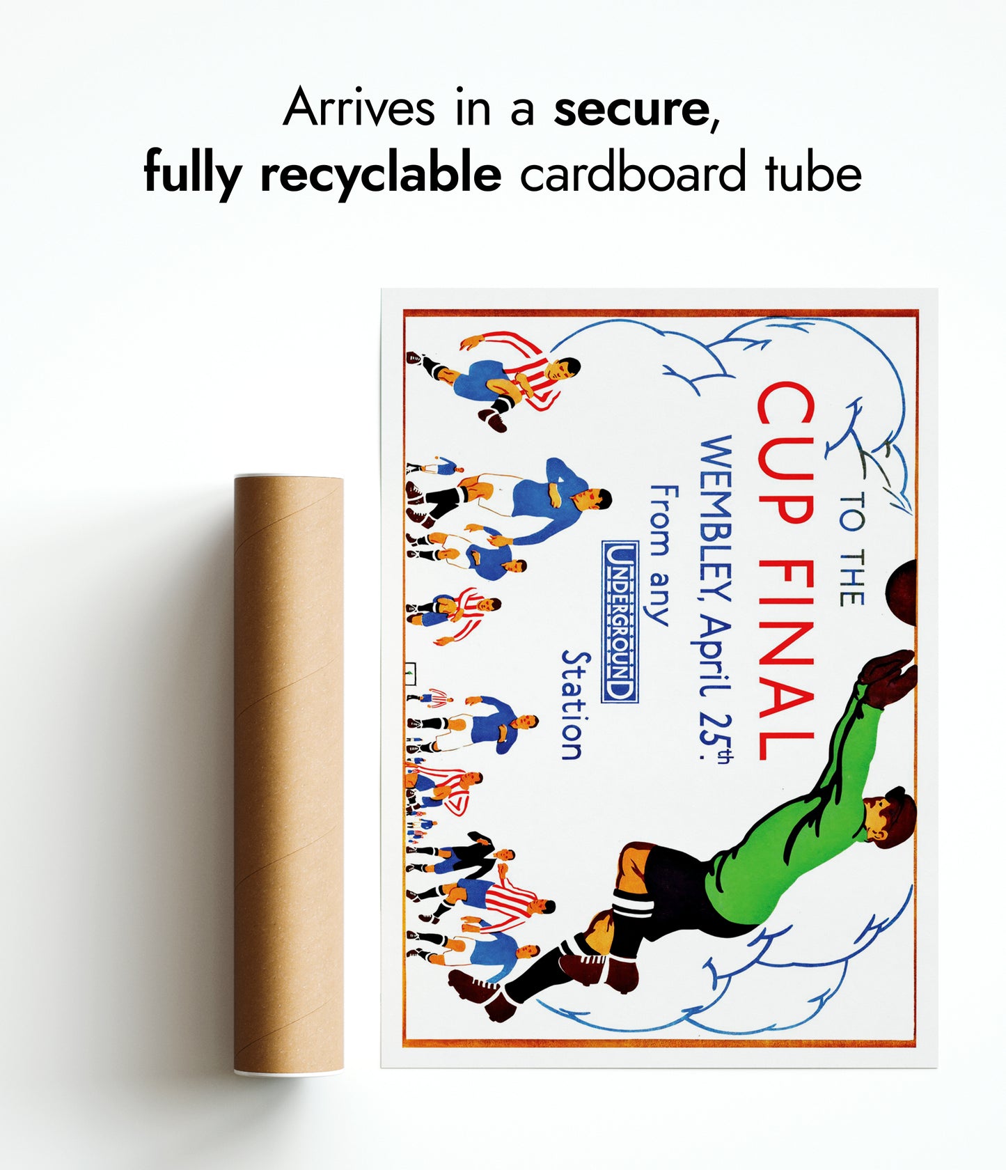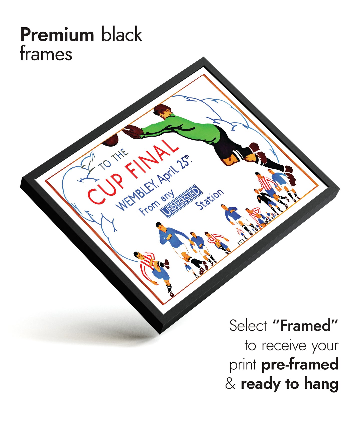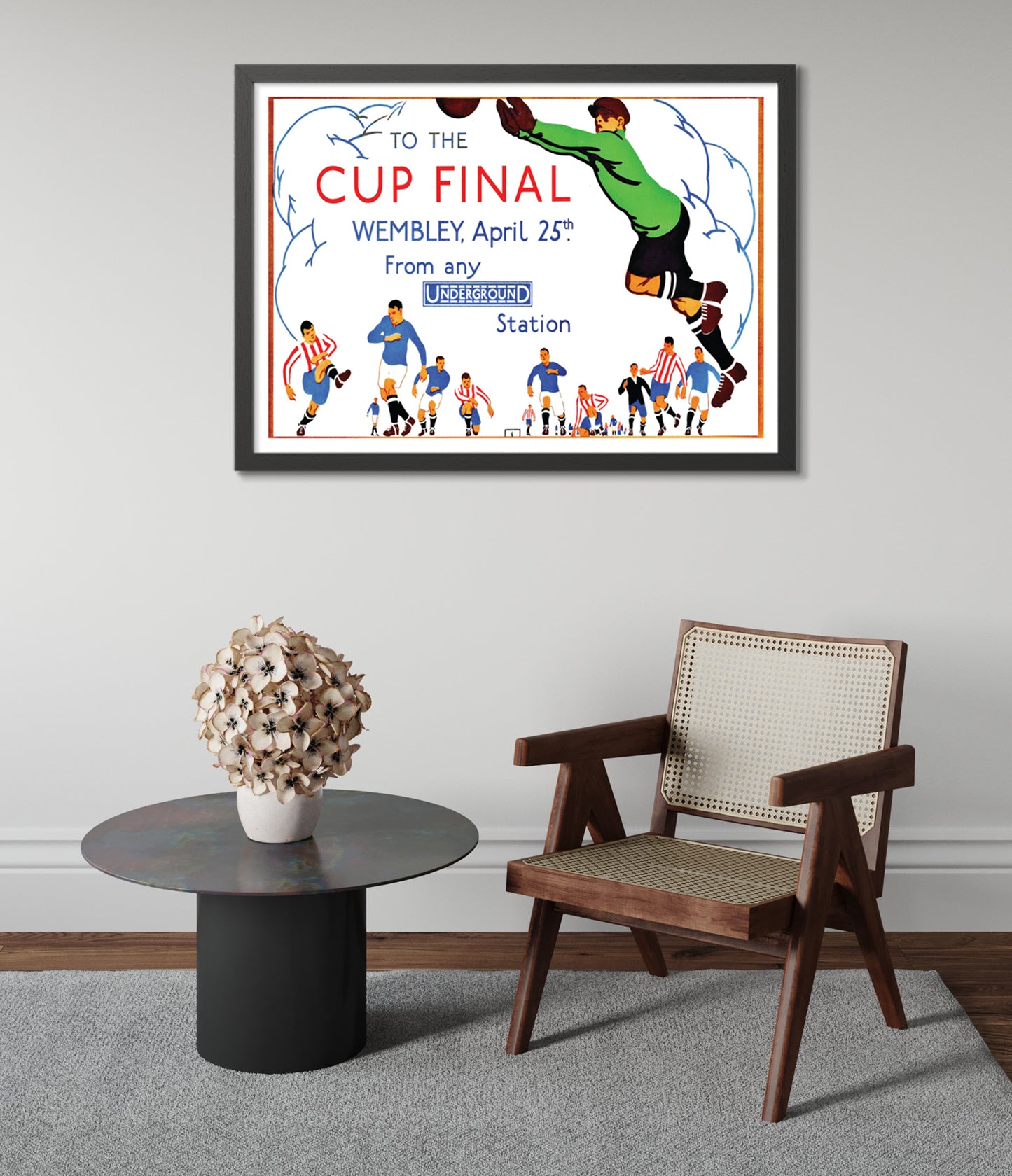 This vintage-style poster illustrates the excitement of the Wembley Cup Final, emphasizing its accessibility via the London Underground. Featuring energetic footballers in action, the artwork captures the dynamic spirit of the sport. The use of vibrant colors and bold typography effectively conveys the festive atmosphere, making it an appealing choice for football enthusiasts and collectors of historical sports memorabilia.