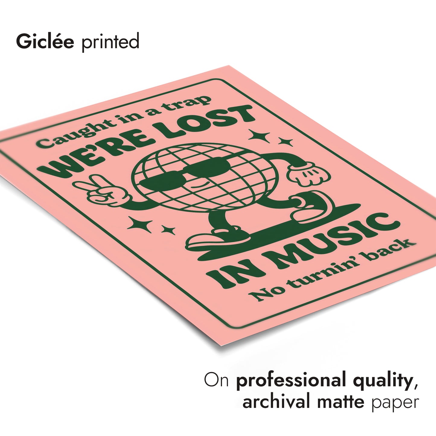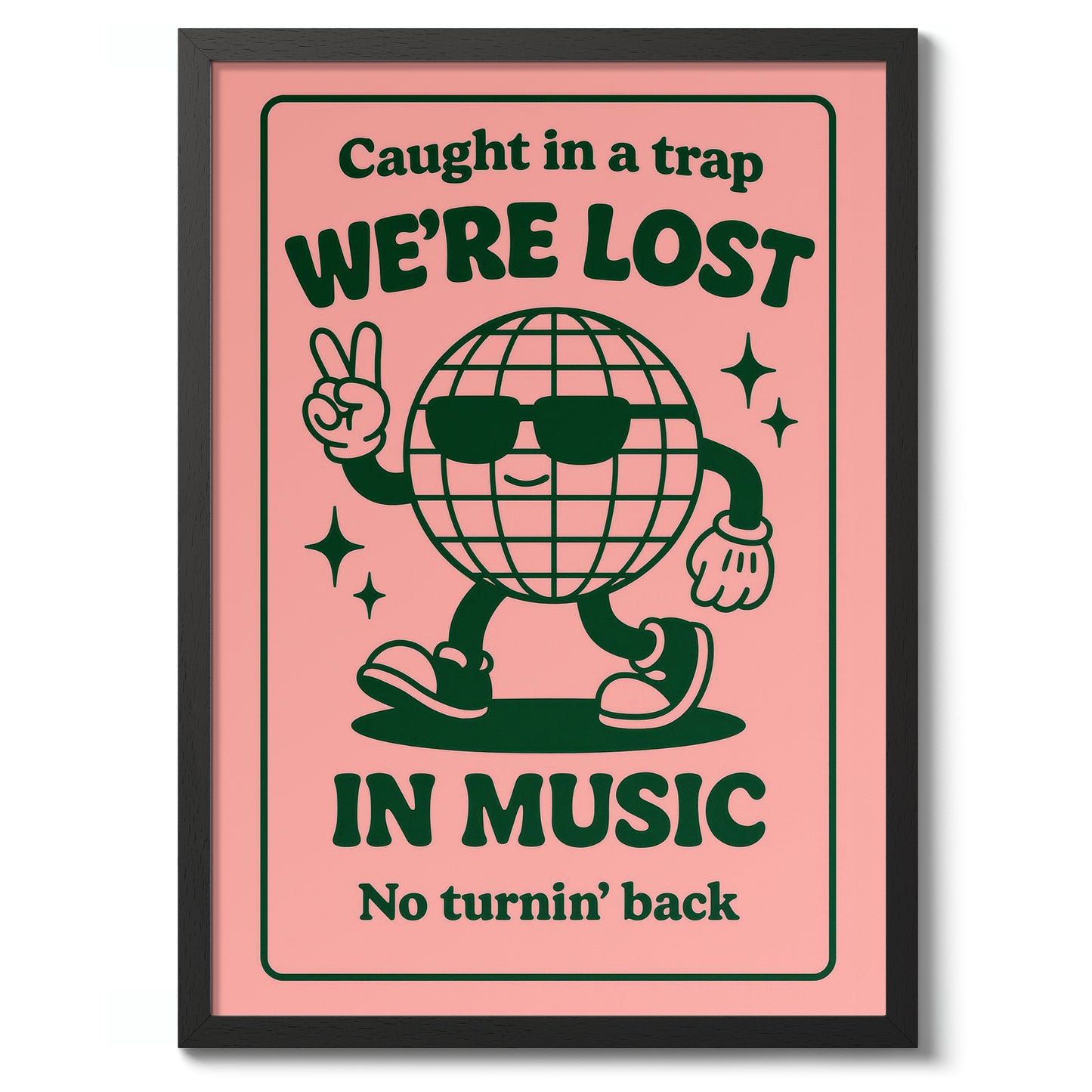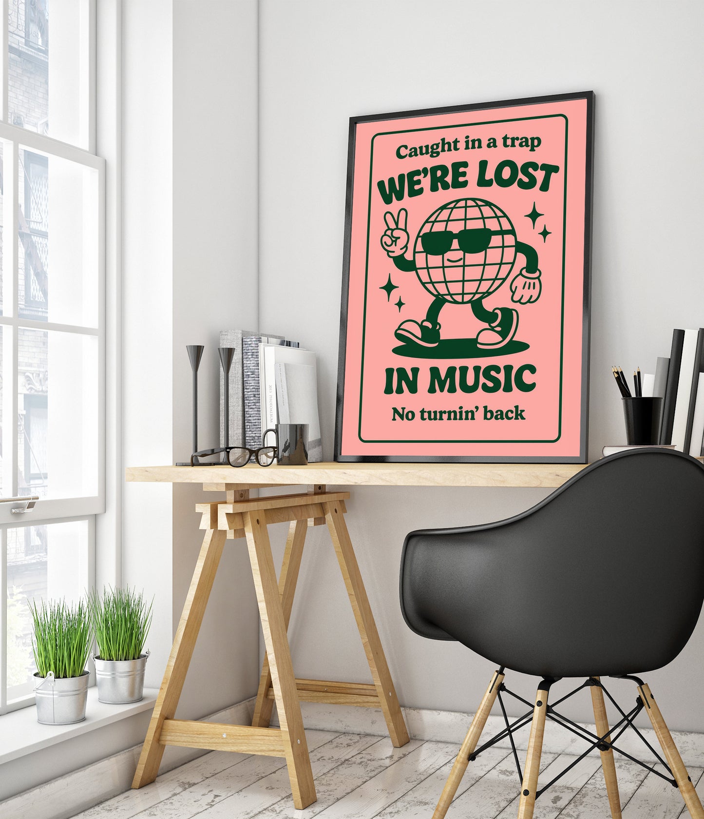 The "We're Lost in Music" poster features a playful disco ball character with sunglasses and a peace sign, set against a vibrant pink background. Typography includes fun, retro-style fonts highlighting a musical quote. Ideal for adding a touch of vintage charm and fun to any space, this poster embodies themes of music and peace, making it perfect for music lovers.