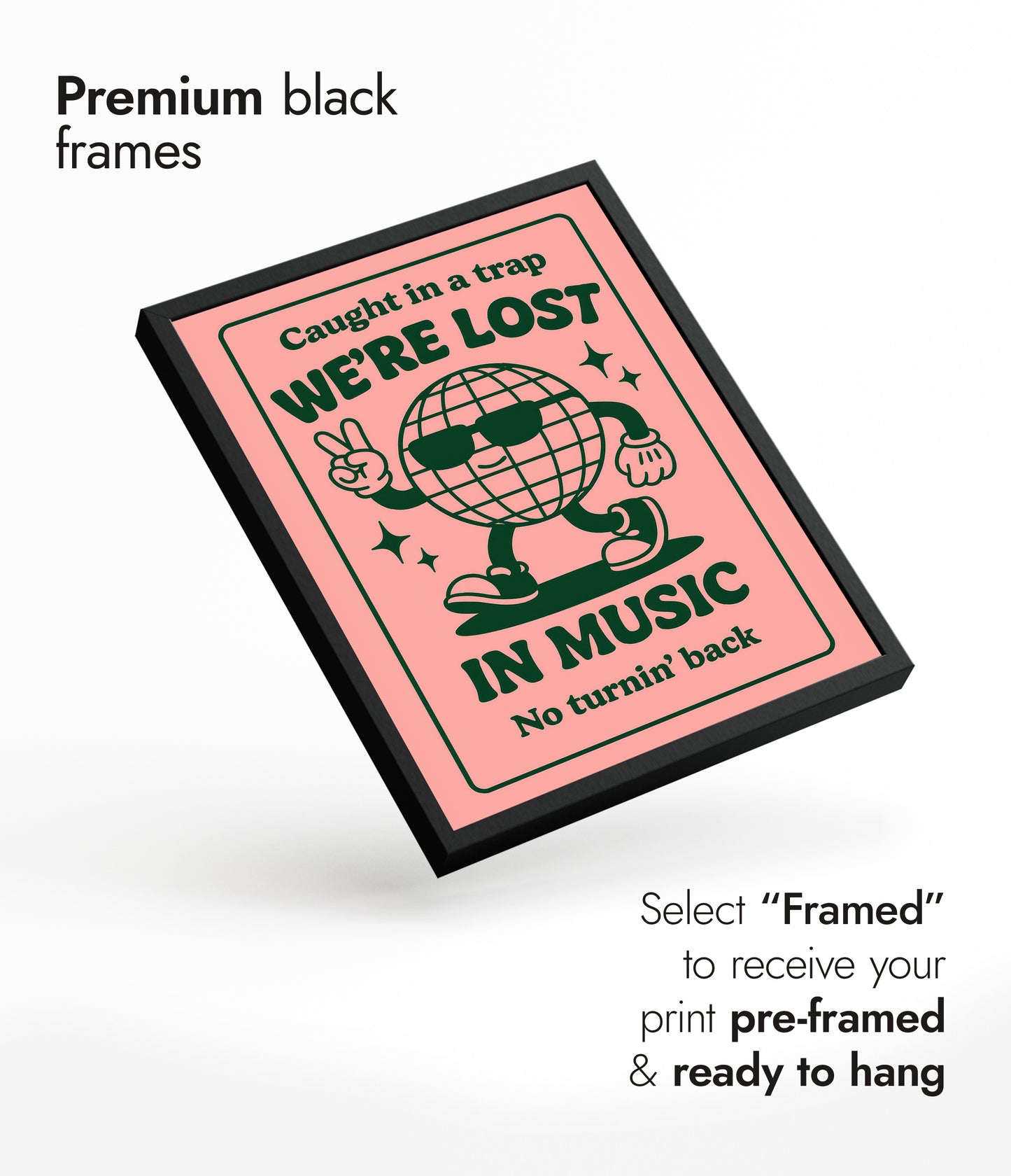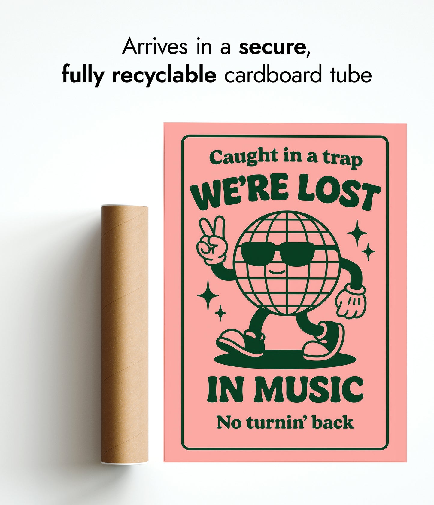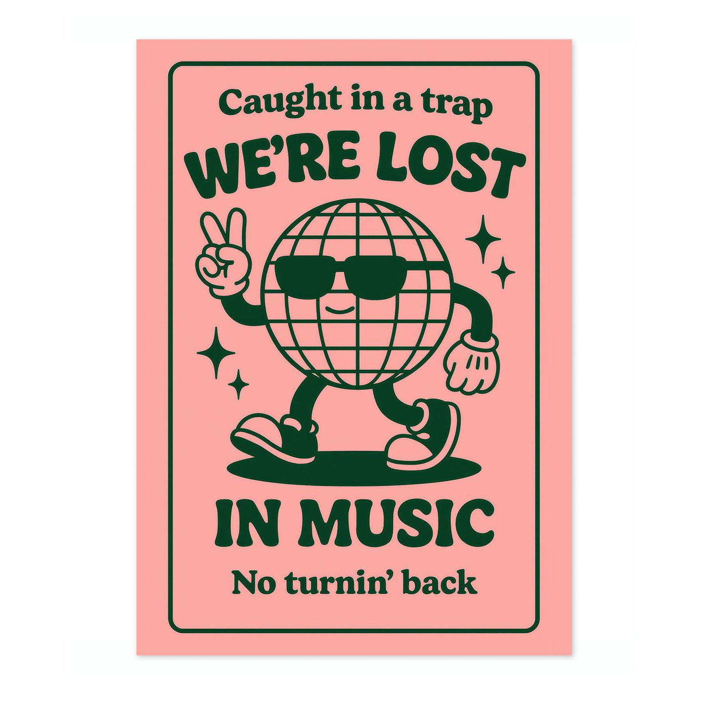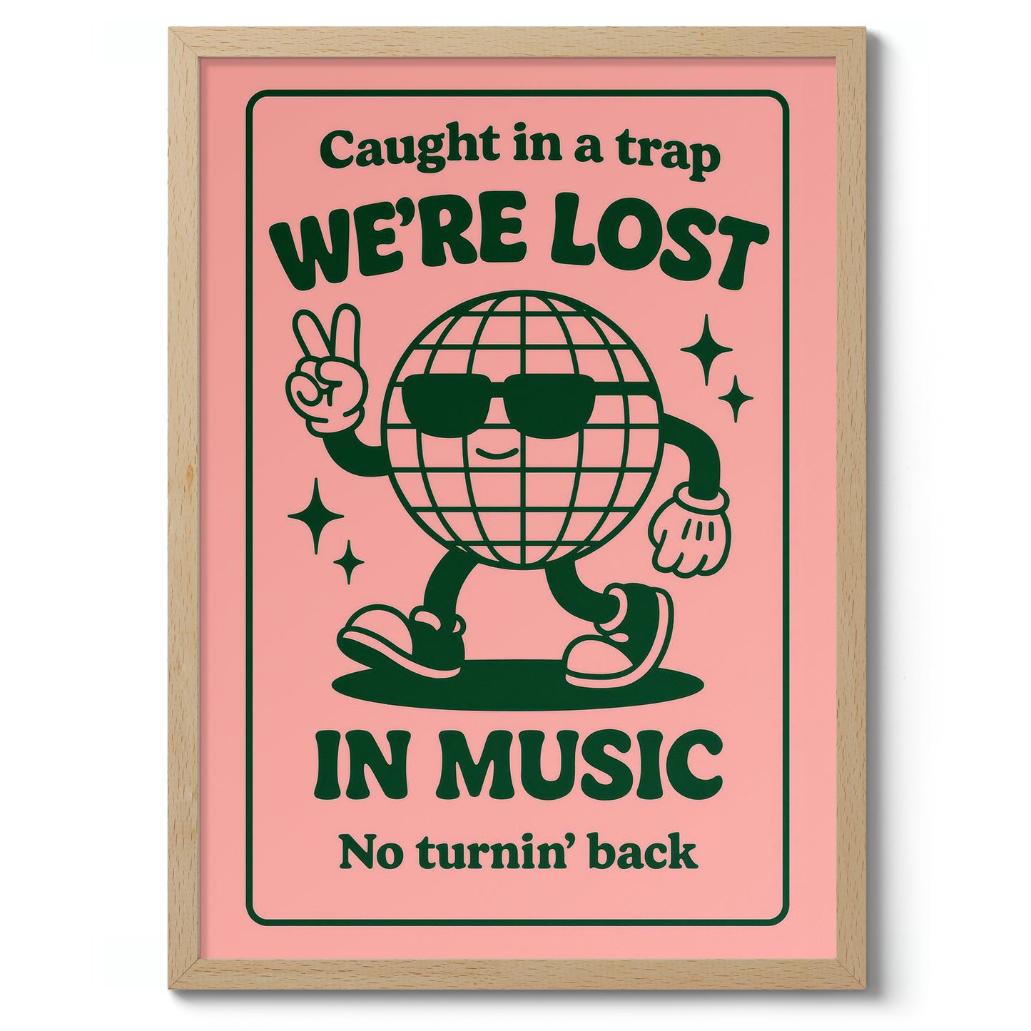 The "We're Lost in Music" poster features a playful disco ball character with sunglasses and a peace sign, set against a vibrant pink background. Typography includes fun, retro-style fonts highlighting a musical quote. Ideal for adding a touch of vintage charm and fun to any space, this poster embodies themes of music and peace, making it perfect for music lovers.