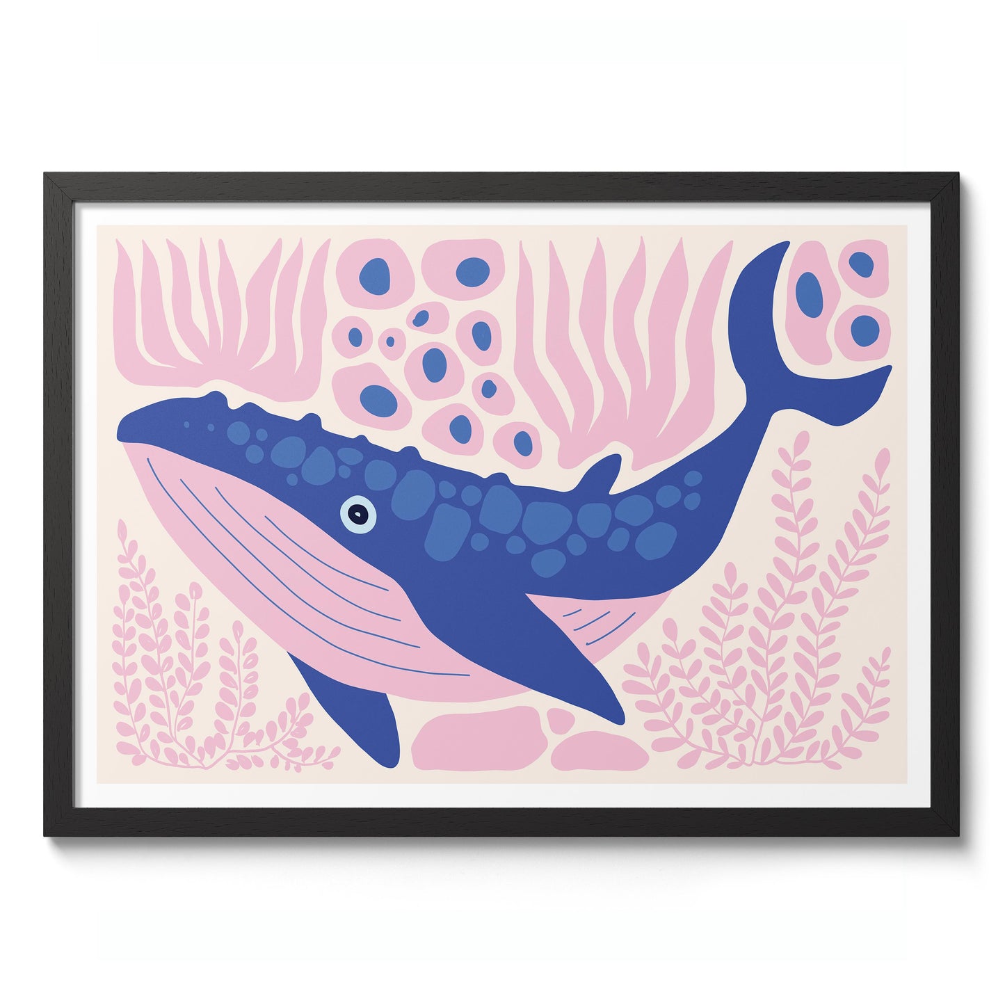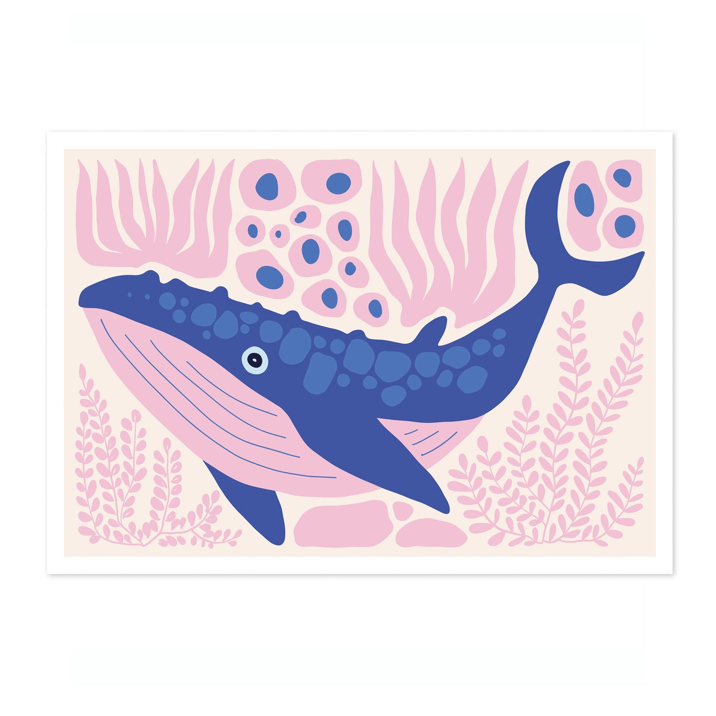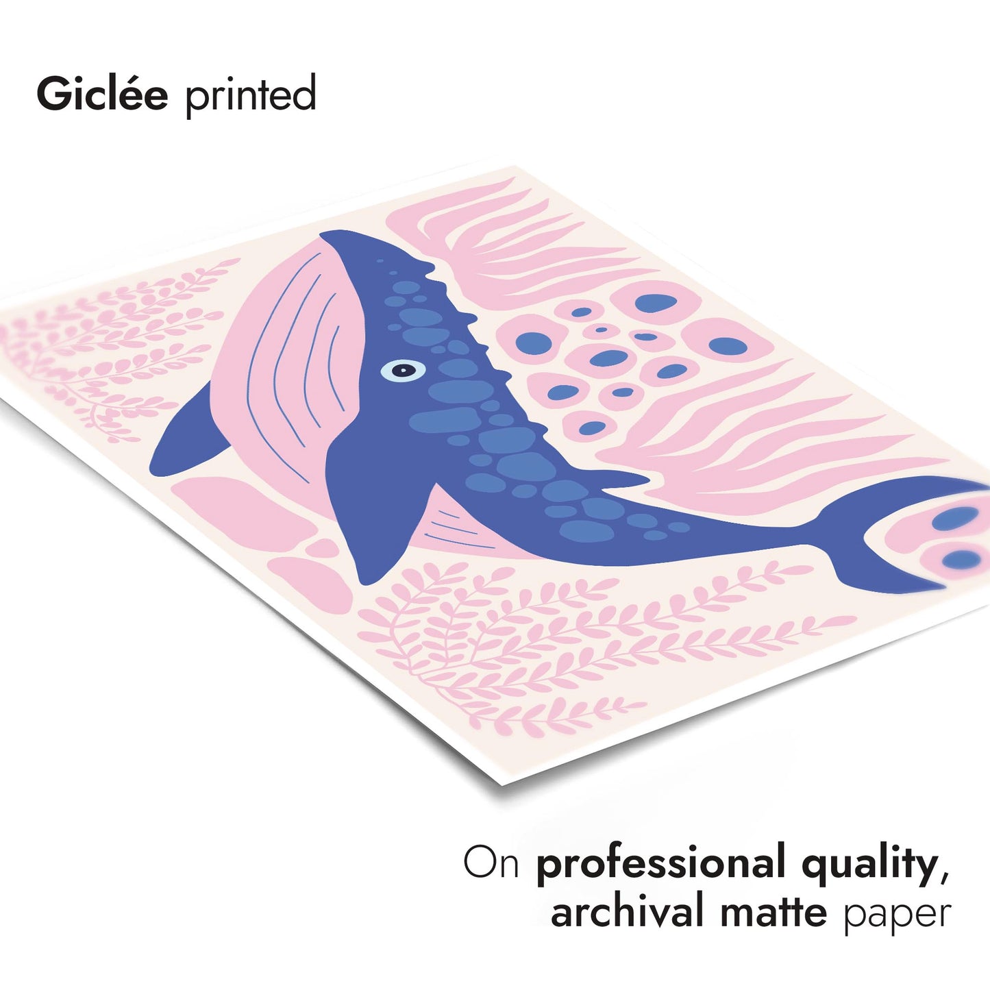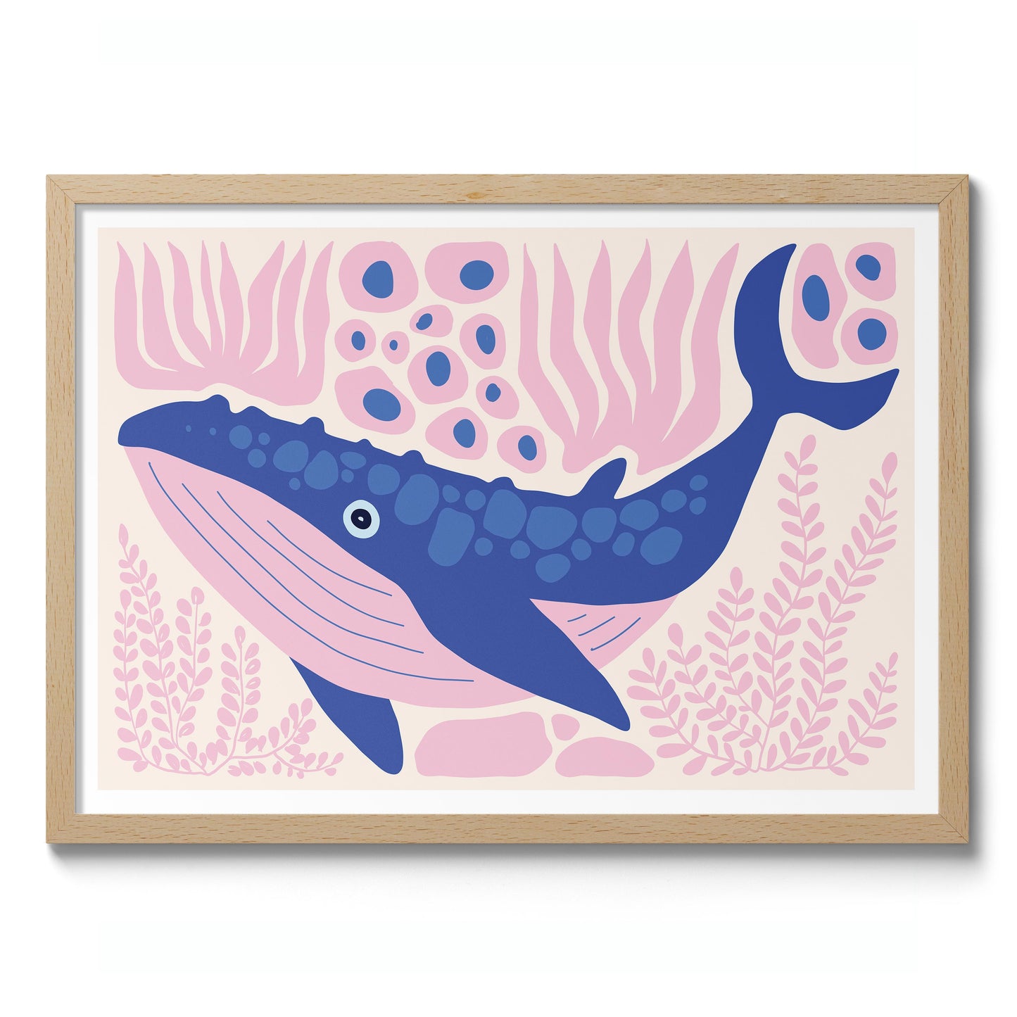 This vibrant whale poster features a whimsical design with a playful blue whale swimming amongst seaweed and fish, set against a soft pink background. Perfect for a nursery, it combines graphic and collage styles to create a charming underwater scene. Ideal for animal and sea-themed decor, this landscape print adds a touch of marine magic to any space.
