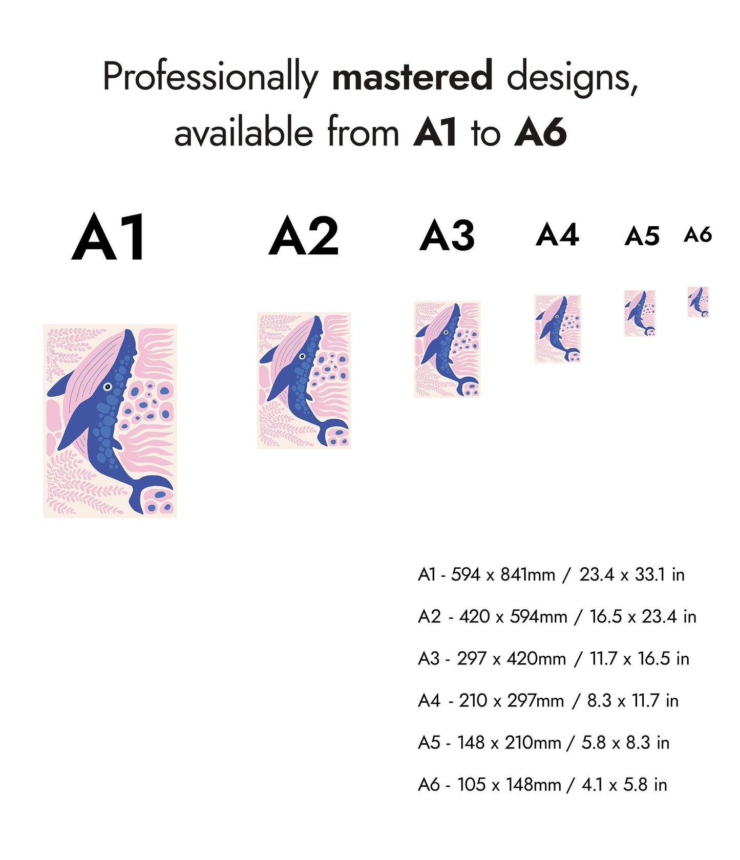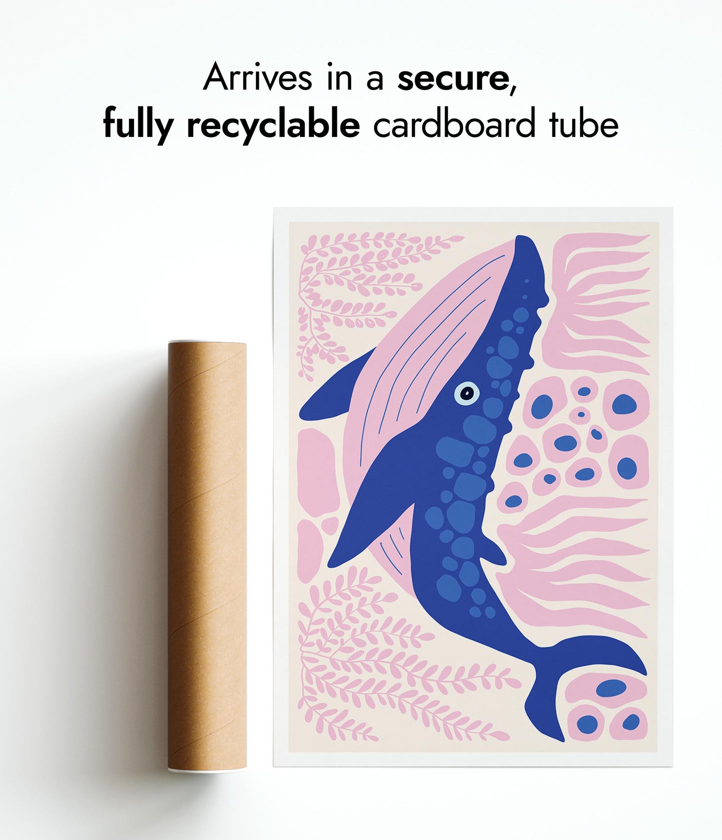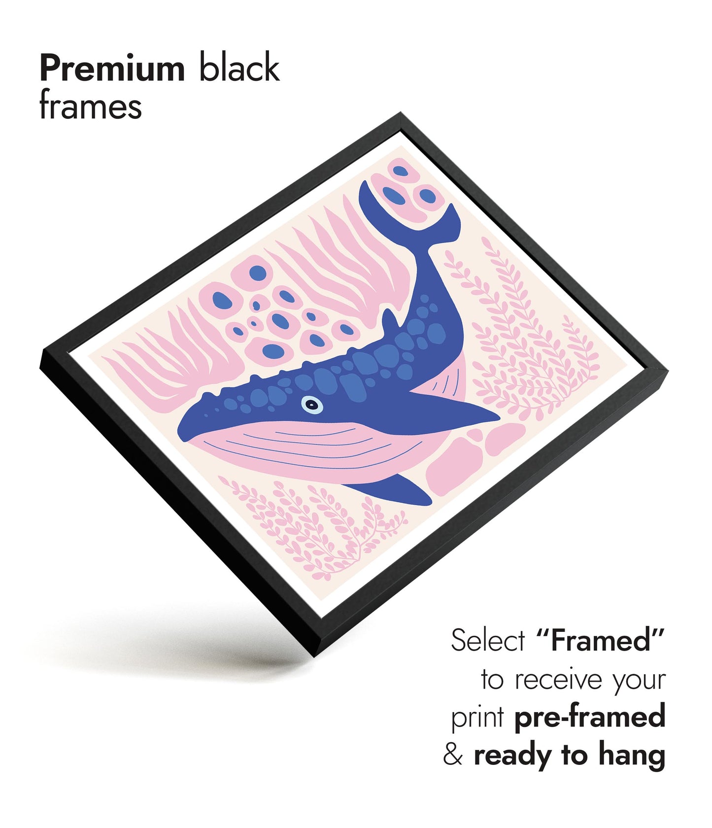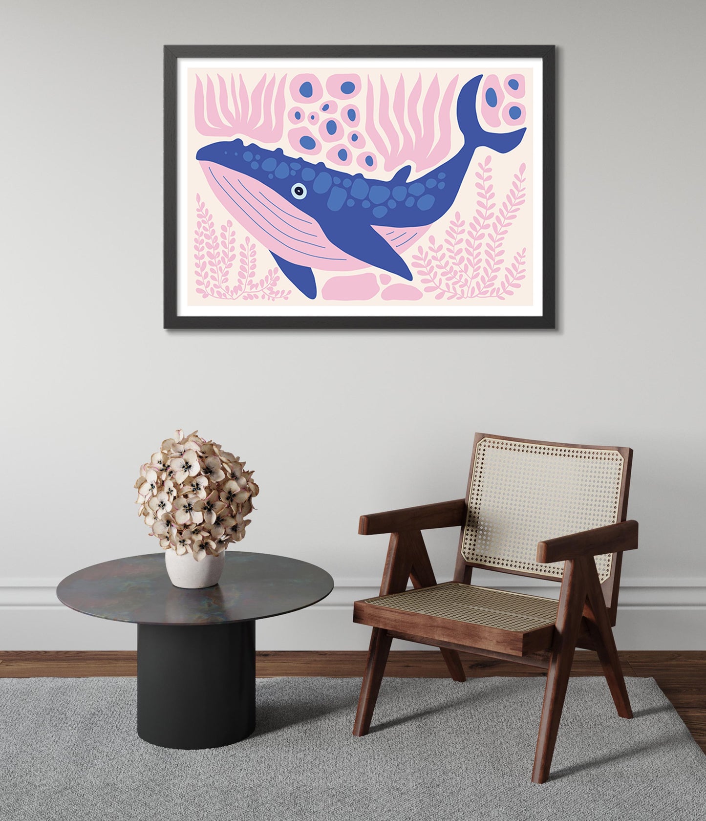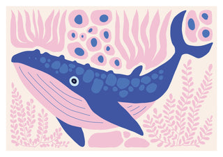 This vibrant whale poster features a whimsical design with a playful blue whale swimming amongst seaweed and fish, set against a soft pink background. Perfect for a nursery, it combines graphic and collage styles to create a charming underwater scene. Ideal for animal and sea-themed decor, this landscape print adds a touch of marine magic to any space.