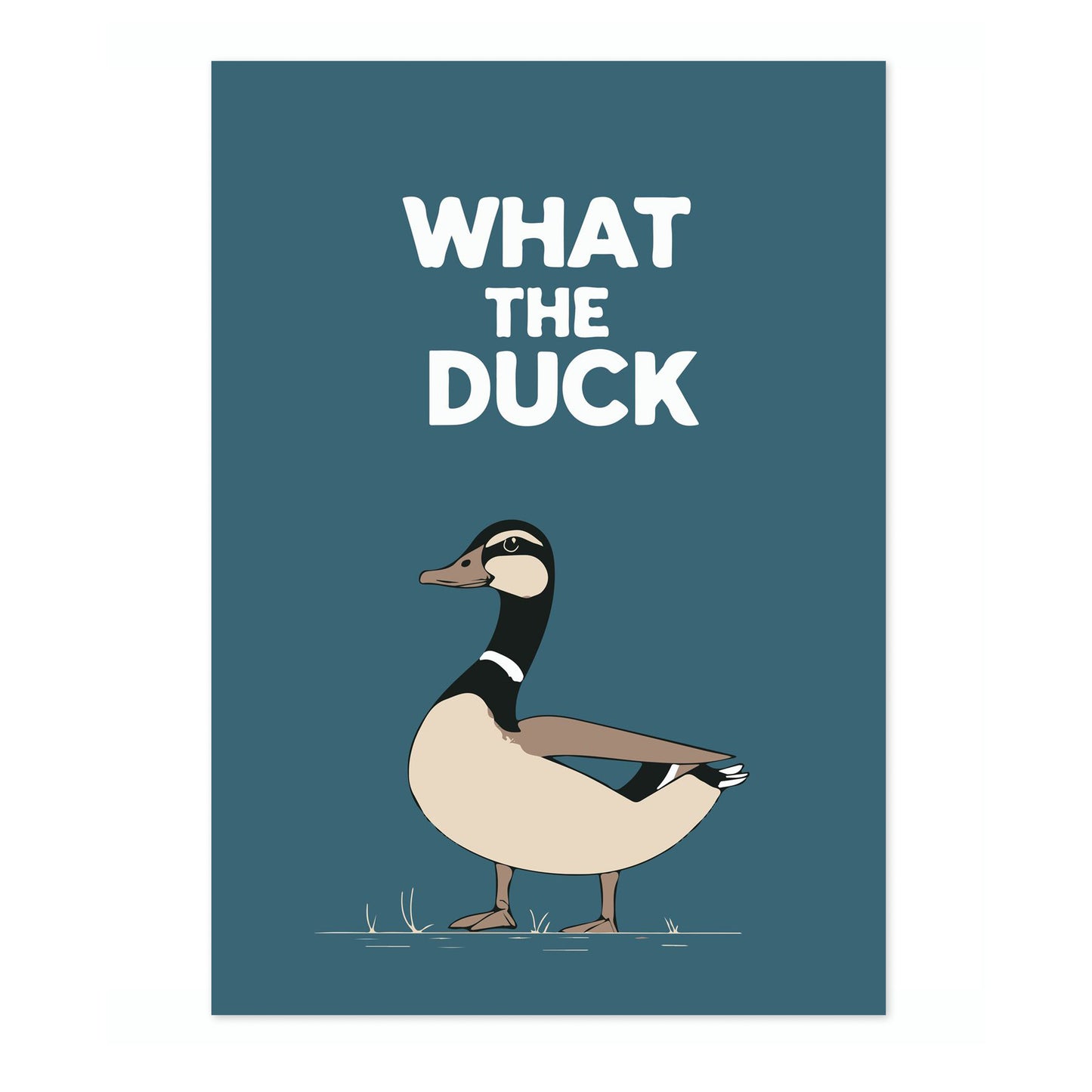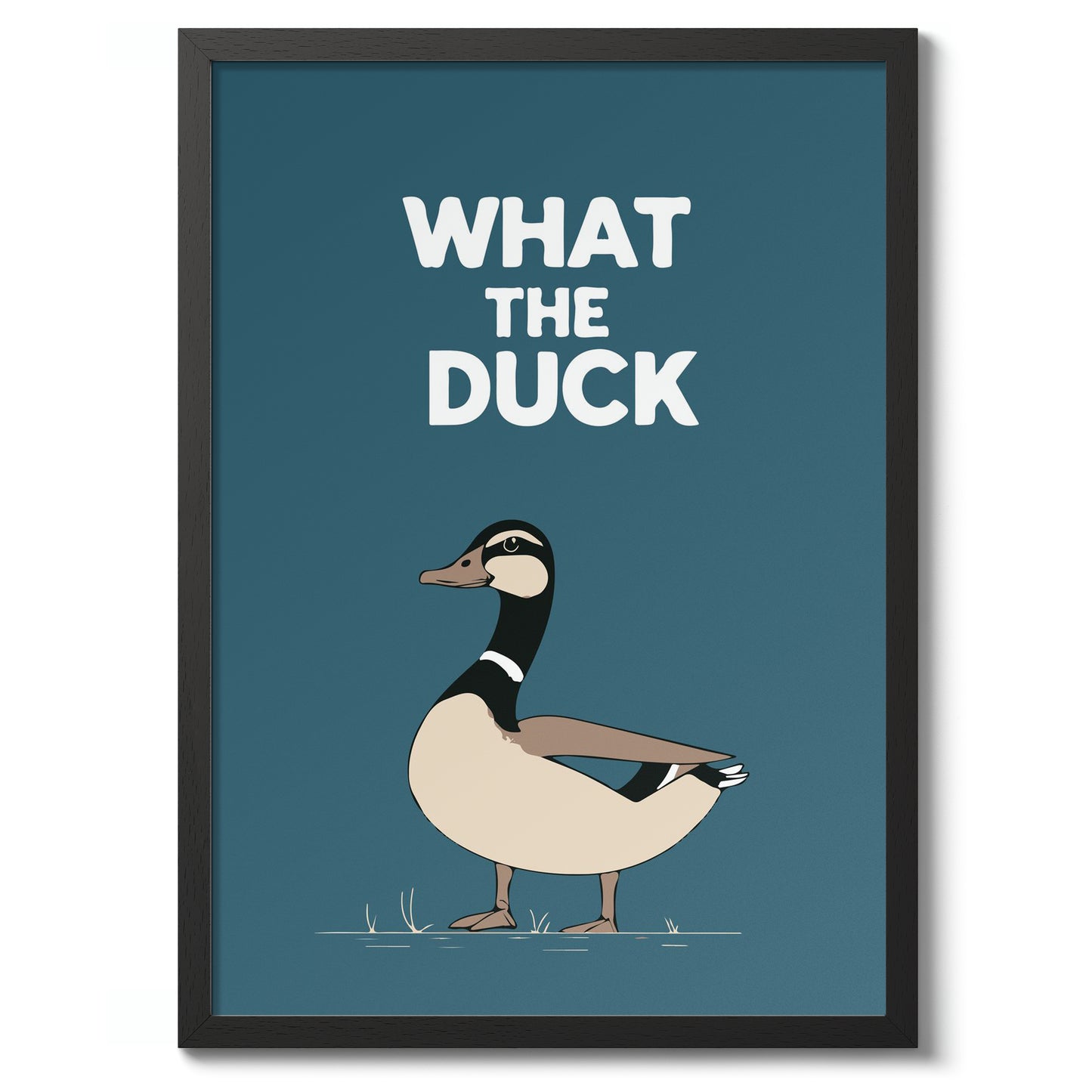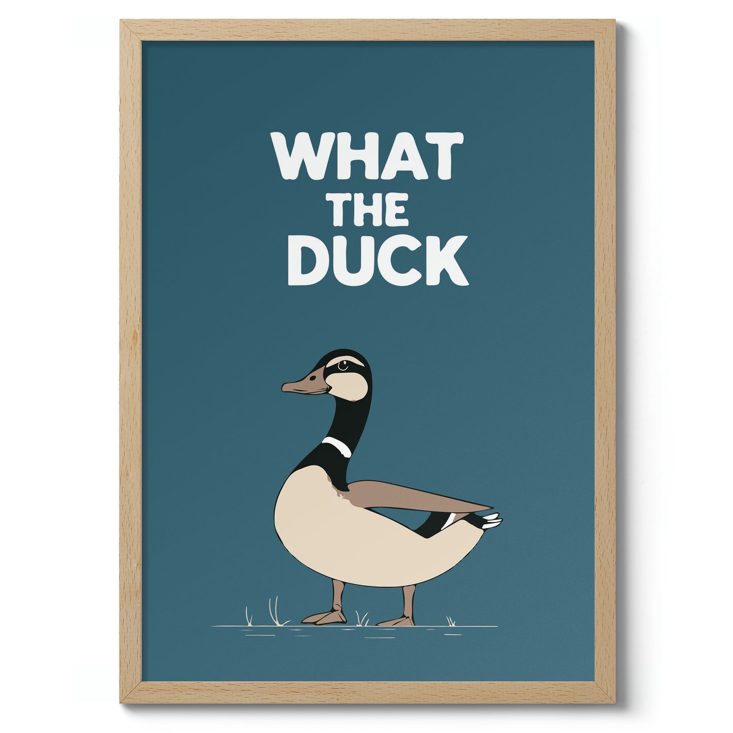 This humorous poster features a stylized duck against a muted blue background with bold typography stating "What the Duck." The duck's minimalistic illustration pairs with the playful text to deliver a comedic twist. Ideal for those seeking a lighthearted, graphic addition to their space while showcasing a blend of typographic art and whimsical design.