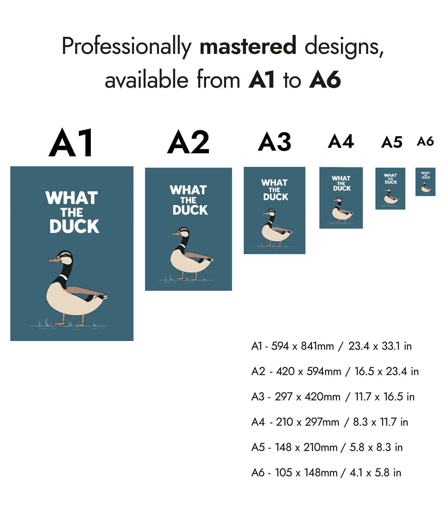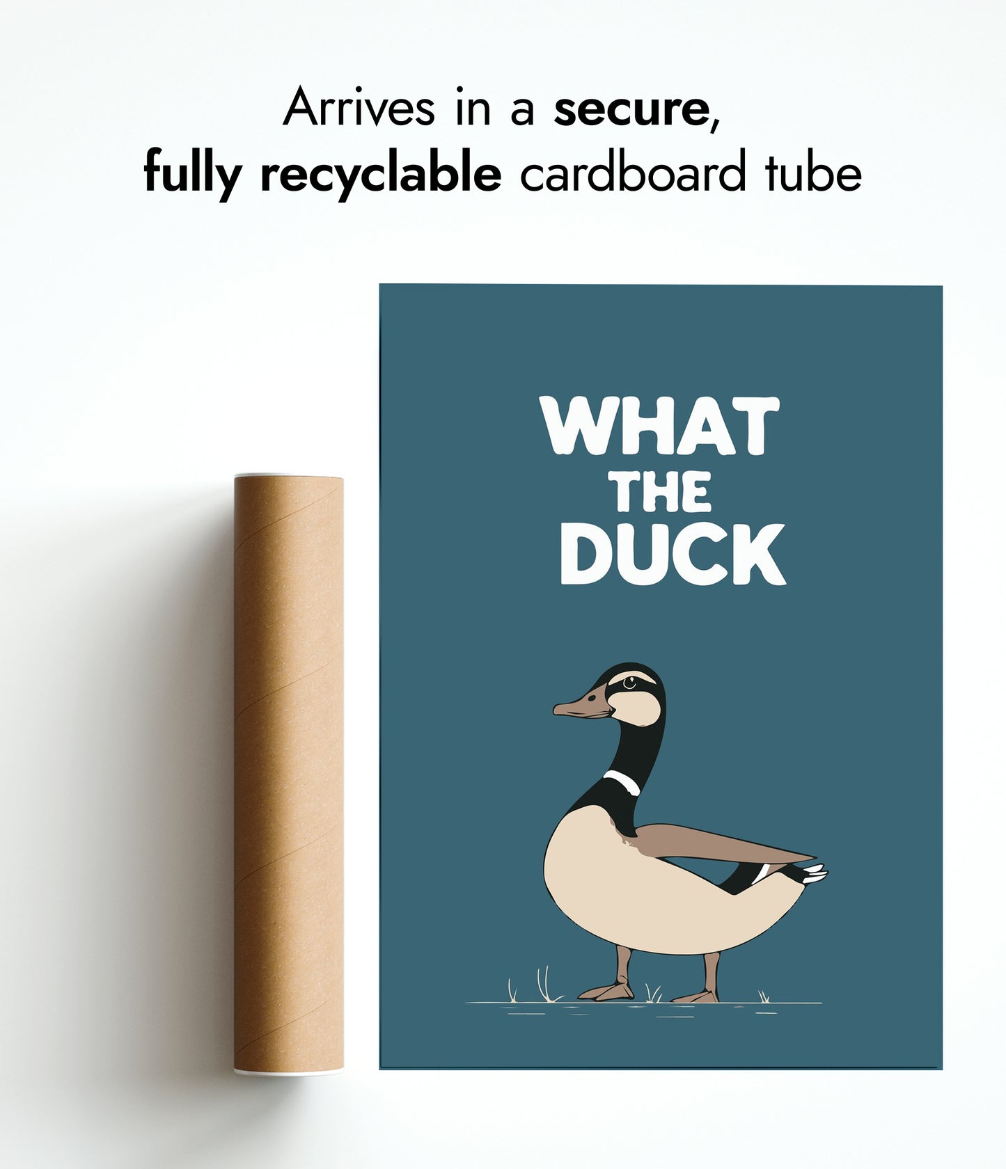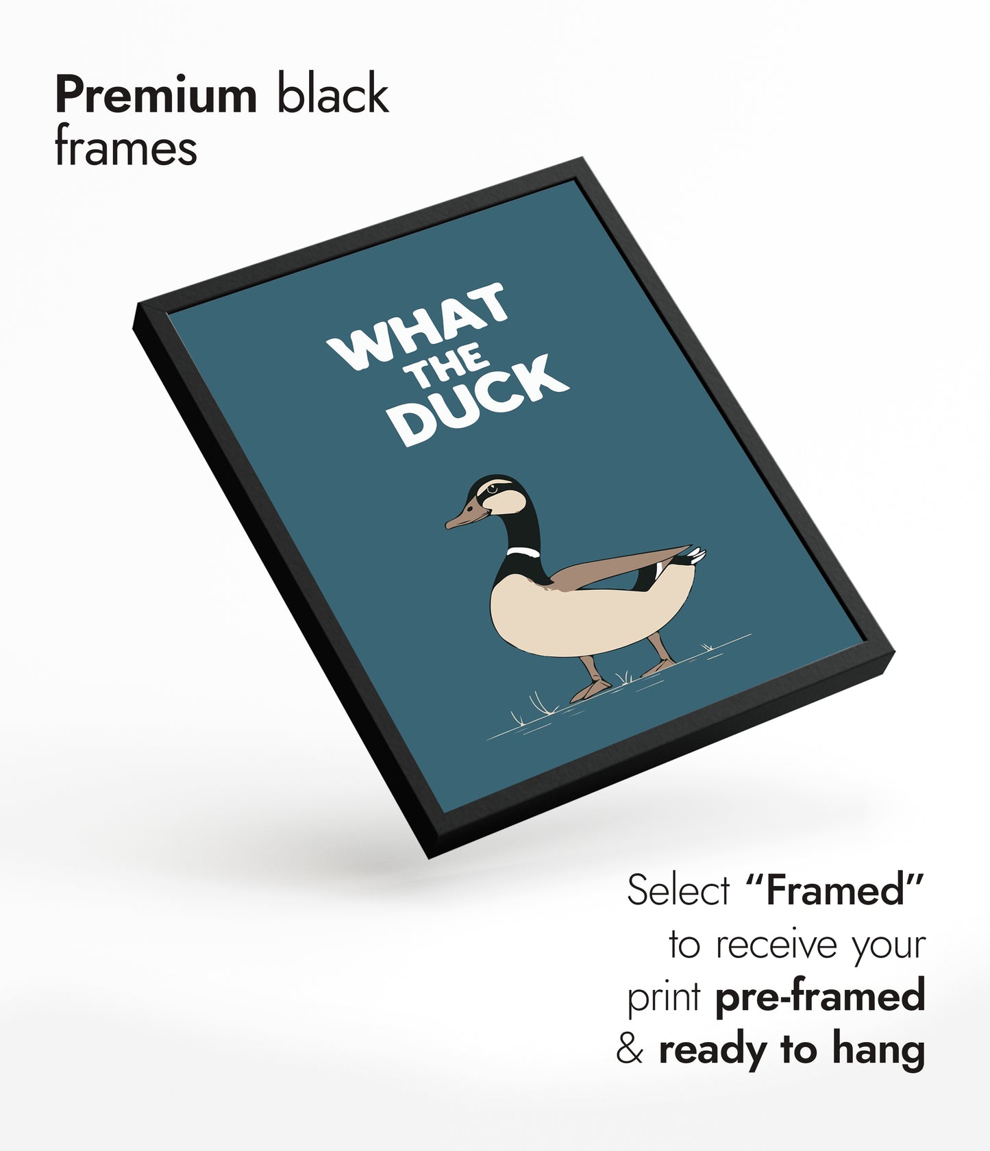 This humorous poster features a stylized duck against a muted blue background with bold typography stating "What the Duck." The duck's minimalistic illustration pairs with the playful text to deliver a comedic twist. Ideal for those seeking a lighthearted, graphic addition to their space while showcasing a blend of typographic art and whimsical design.