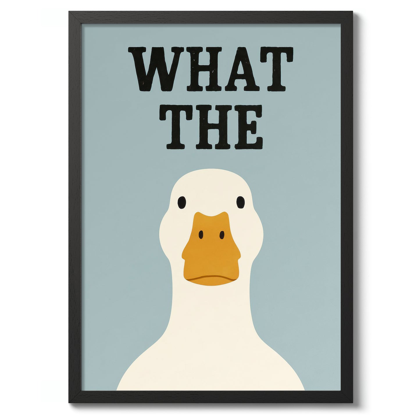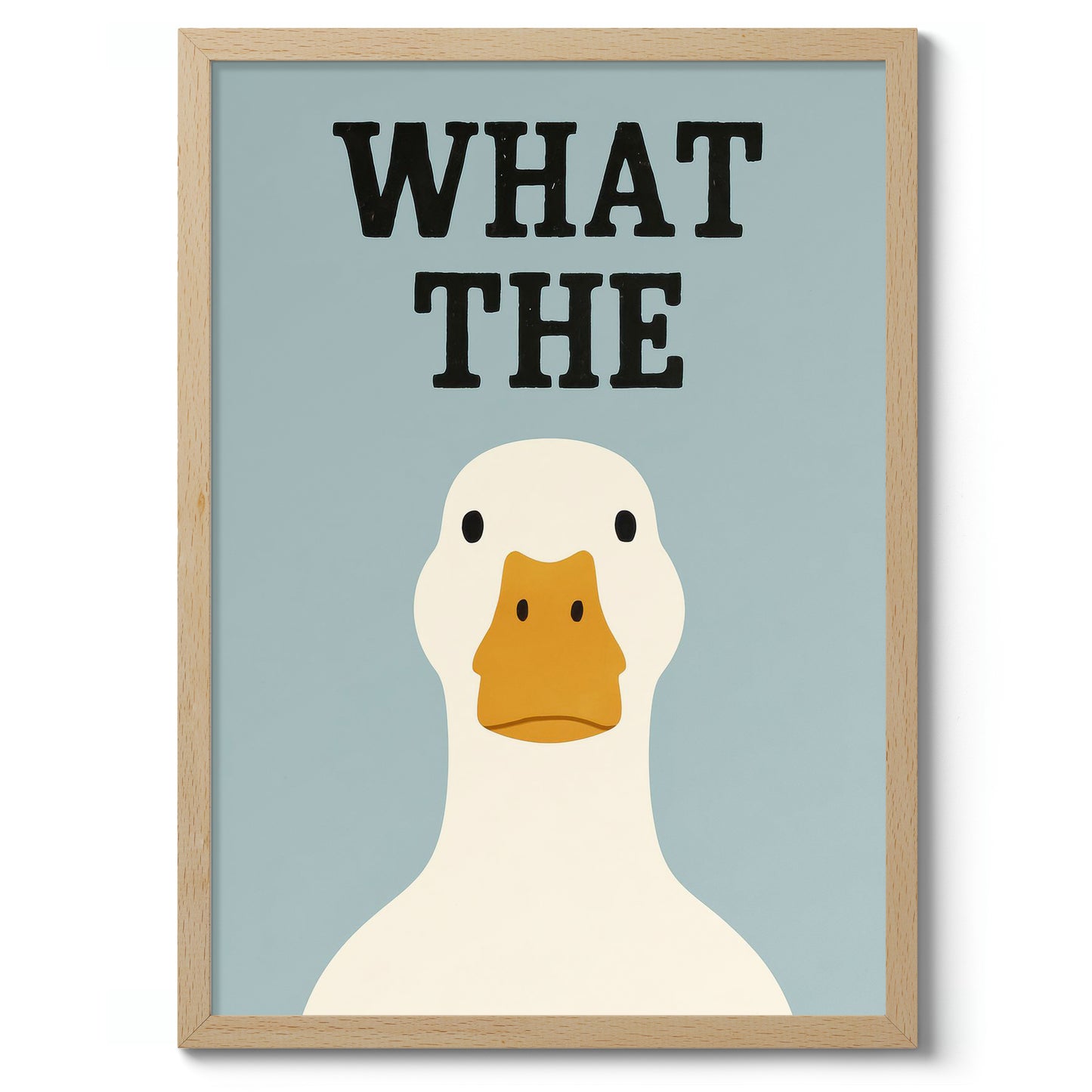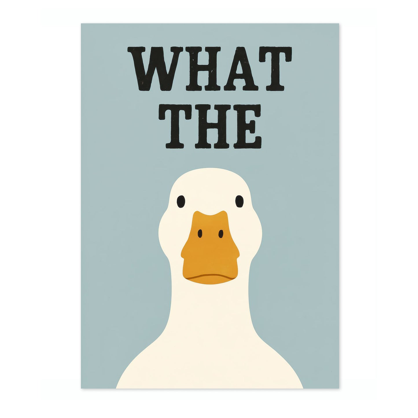 This humorous typography poster, "What the Duck," features a simple illustration of a duck against a soft blue background. The bold black lettering adds a playful twist, complementing the duck's straightforward expression. Perfect for adding a touch of wit to any room, this funny and graphic wall art is ideal for fans of quirky and minimalist design elements.
