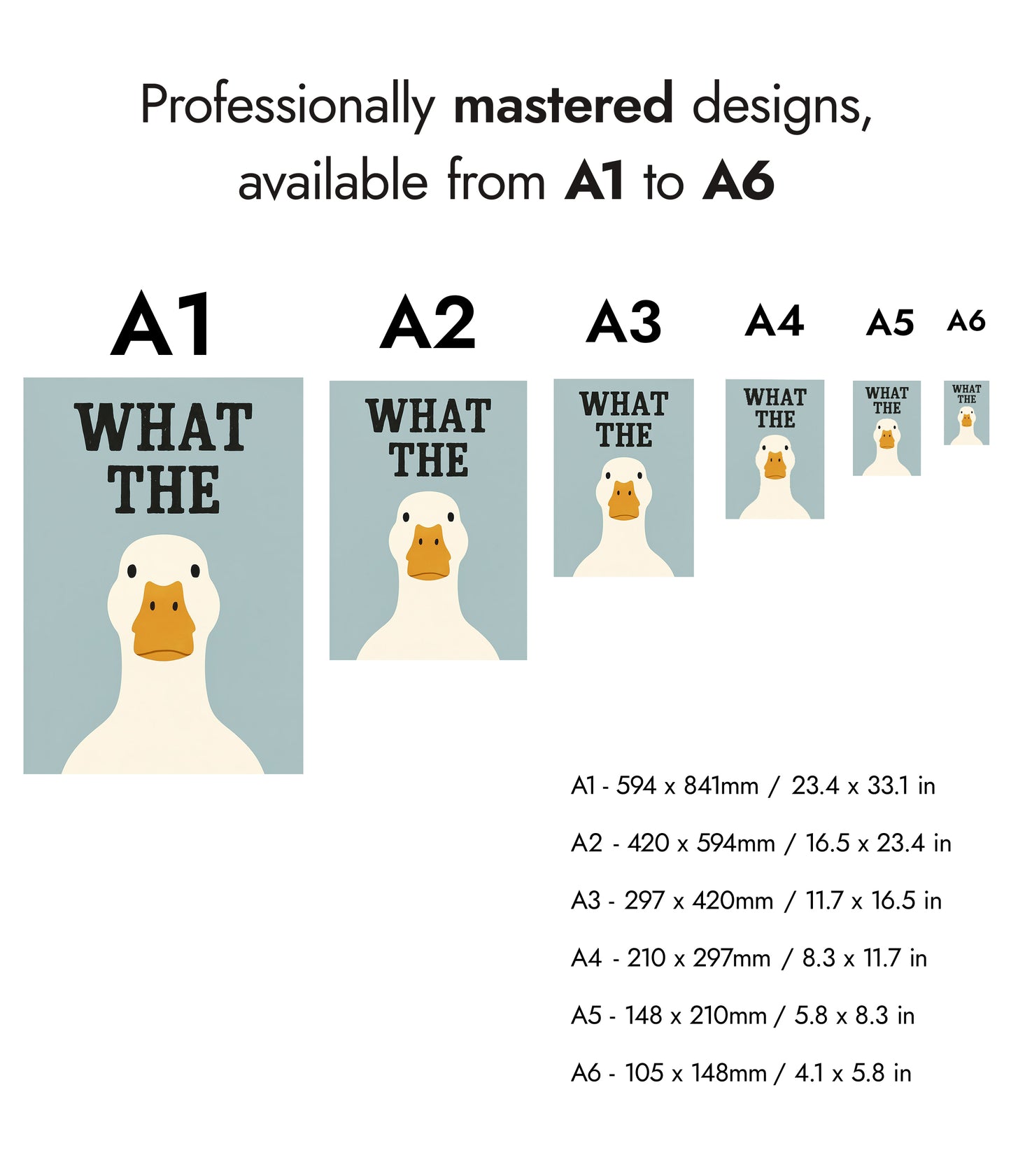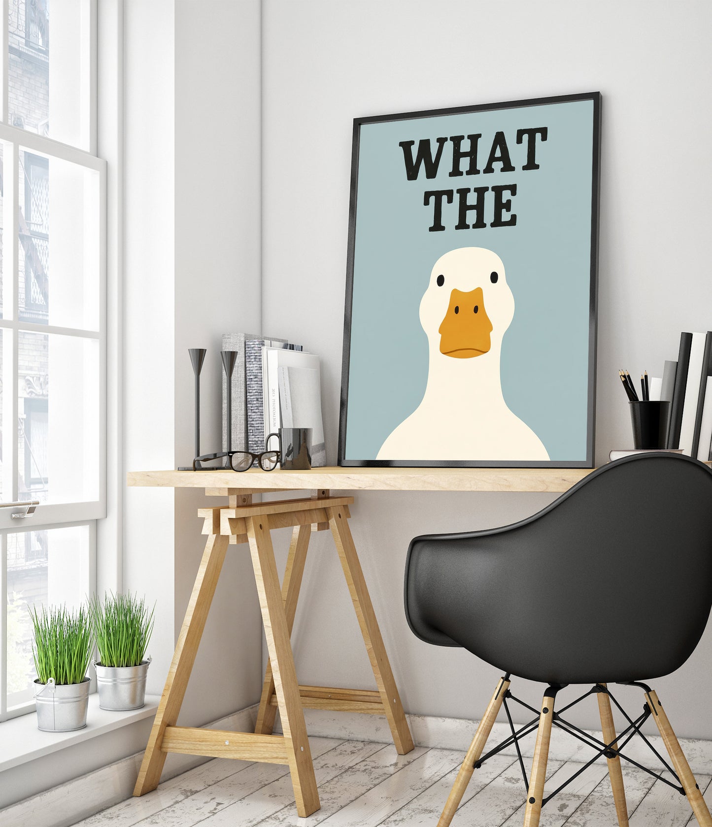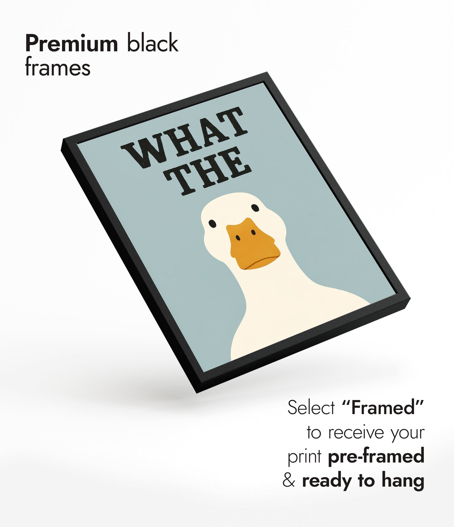This humorous typography poster, "What the Duck," features a simple illustration of a duck against a soft blue background. The bold black lettering adds a playful twist, complementing the duck's straightforward expression. Perfect for adding a touch of wit to any room, this funny and graphic wall art is ideal for fans of quirky and minimalist design elements.