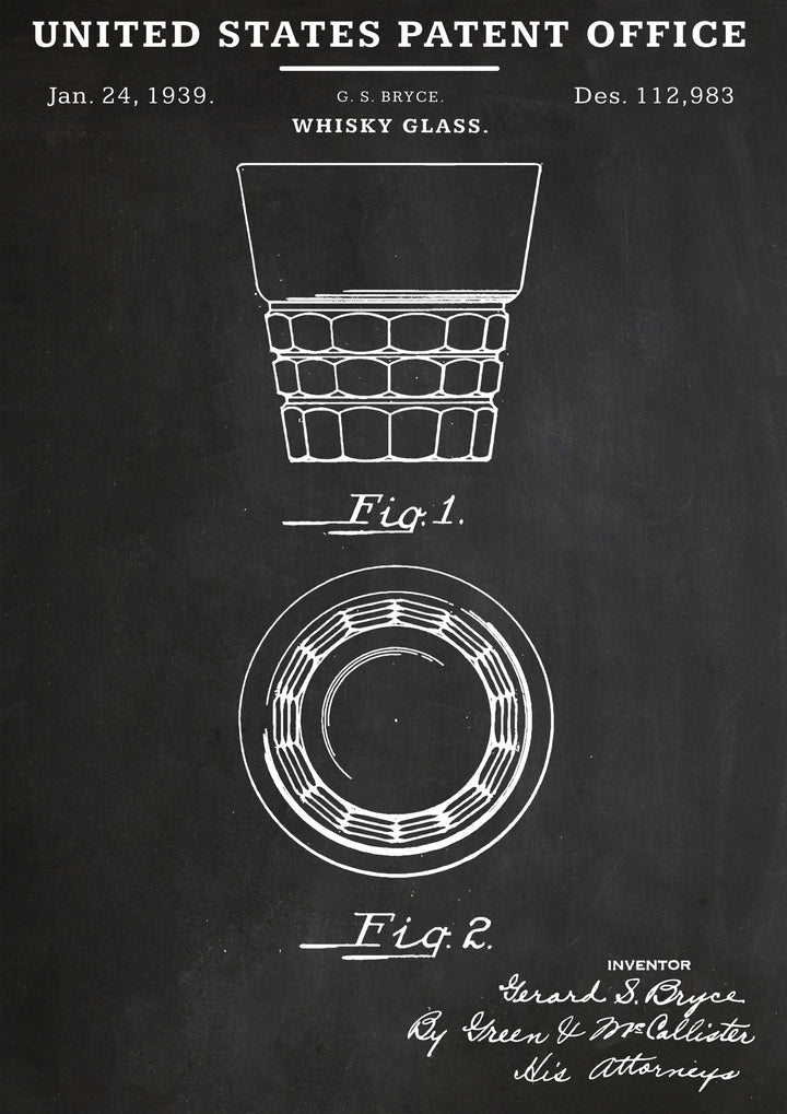 This vintage patent poster features a detailed schematic drawing of a whiskey glass, dated January 24, 1939. The black background and white line art give it a classic, timeless appeal. Perfect for lovers of whiskey and vintage illustration, this portrait-style poster captures the essence of historical design and craftsmanship. Ideal for adding a unique touch to any space.