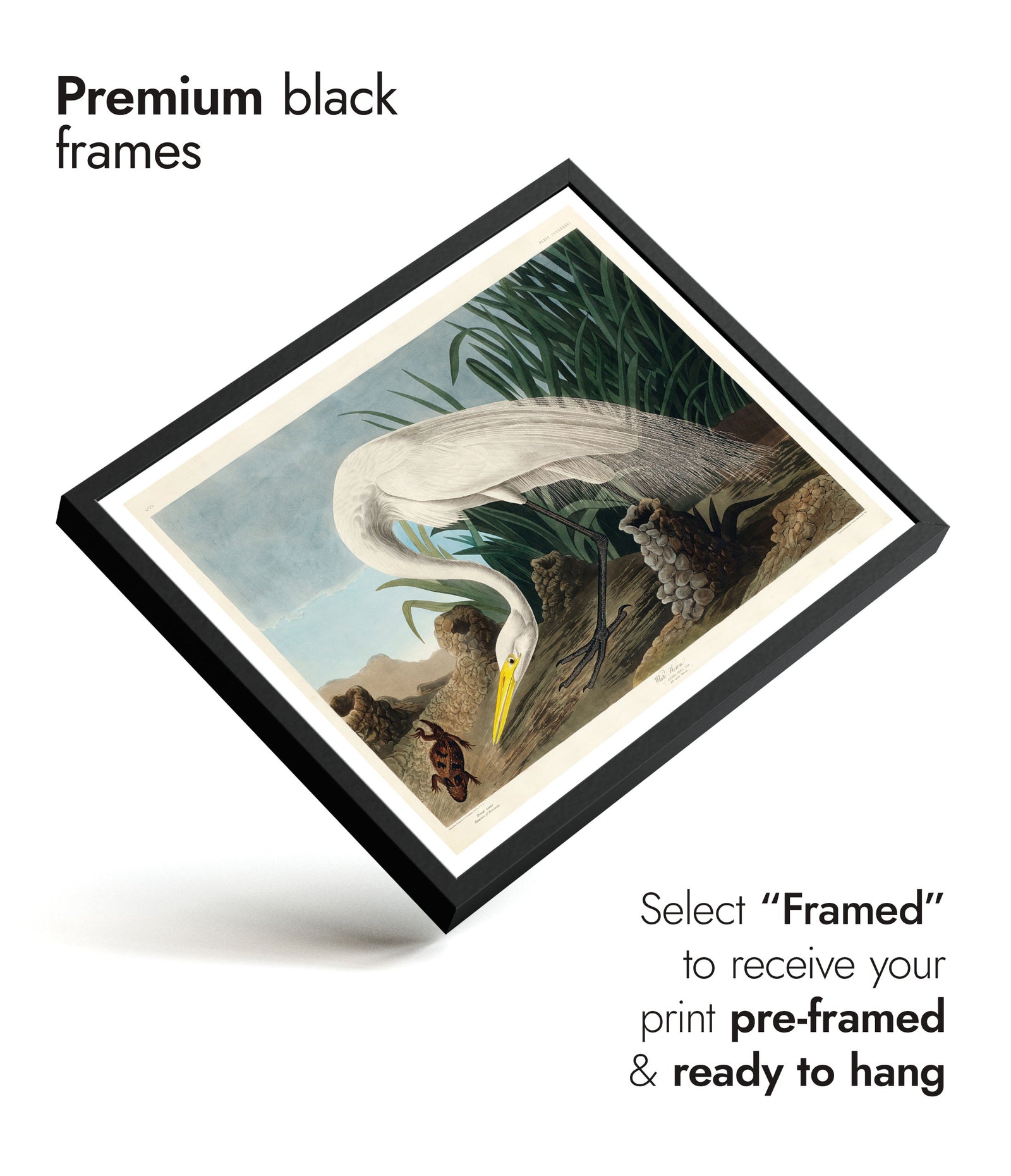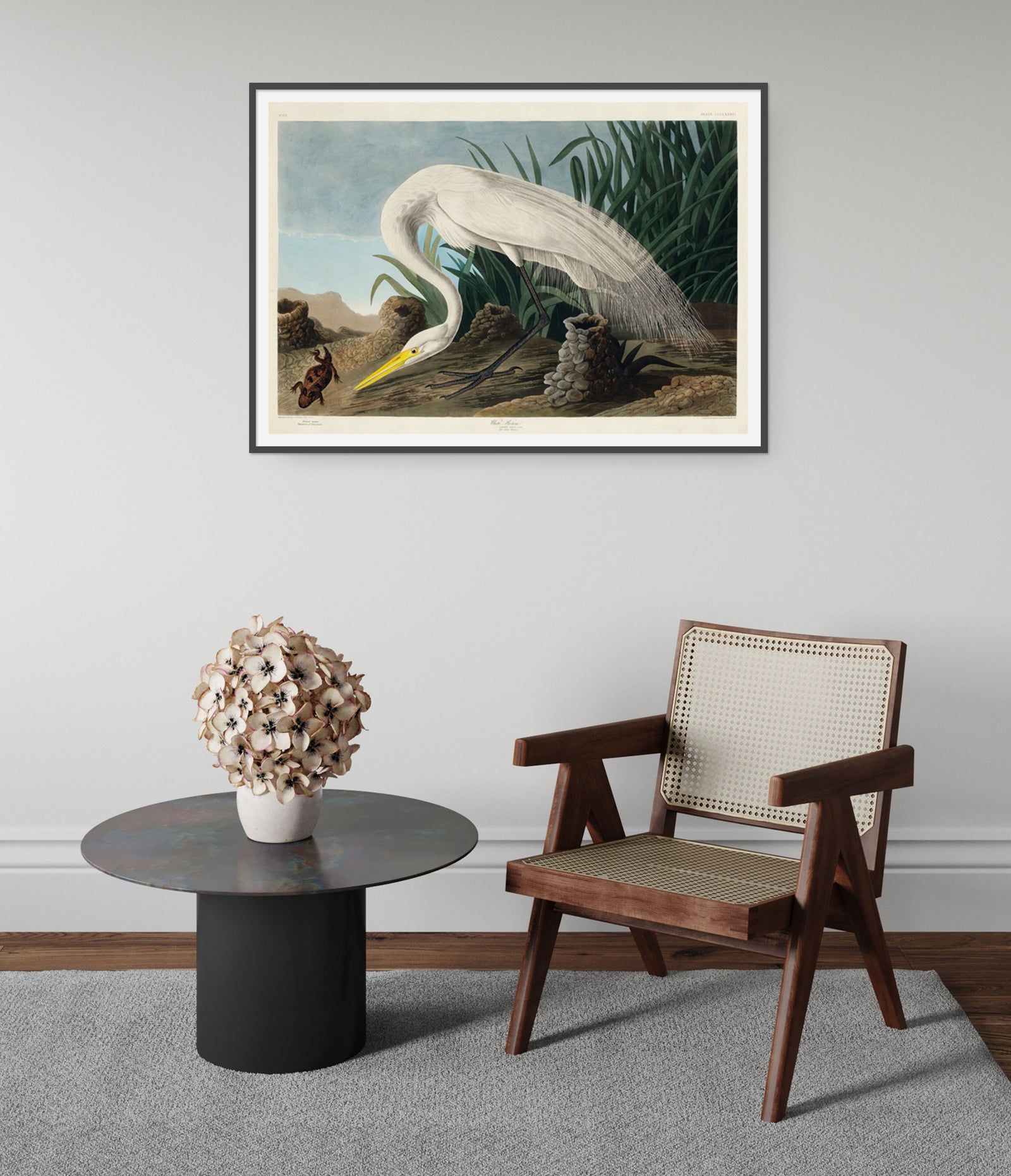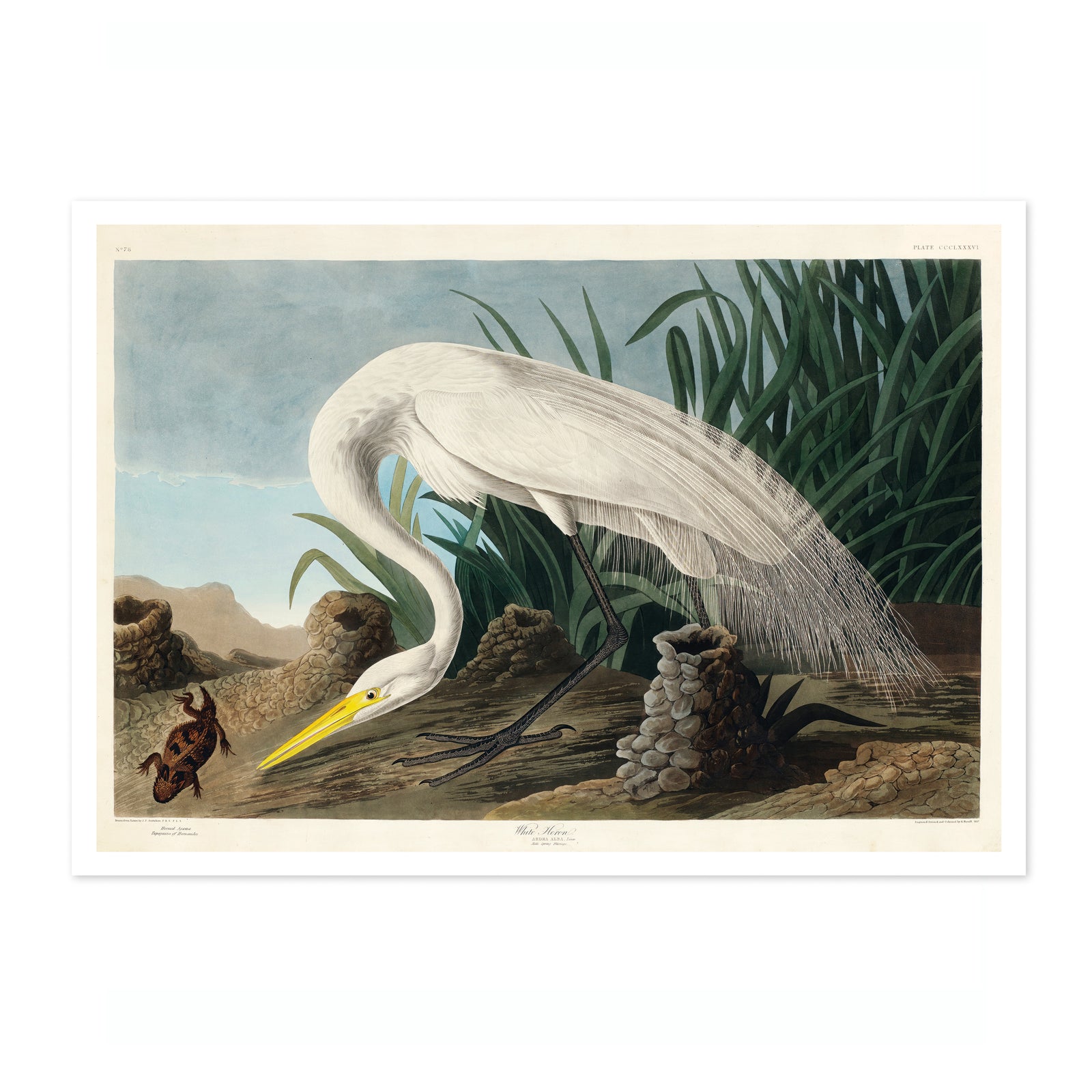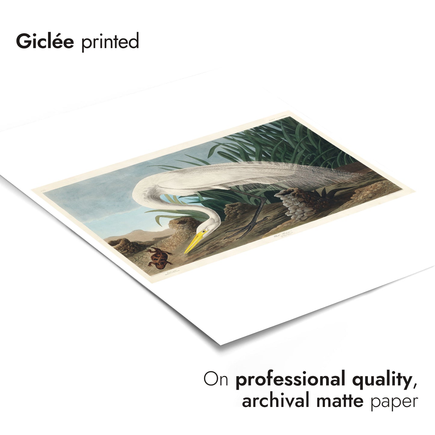 This vintage poster titled "White Heron" by John James Audubon beautifully captures a detailed scene of a white heron in its natural habitat. The heron bends gracefully towards the ground with lush green grass in the background, embodying the intricate artistry and zoological precision Audubon is known for. Perfect for nature and bird enthusiasts, this landscape illustration adds a classic touch to any space.