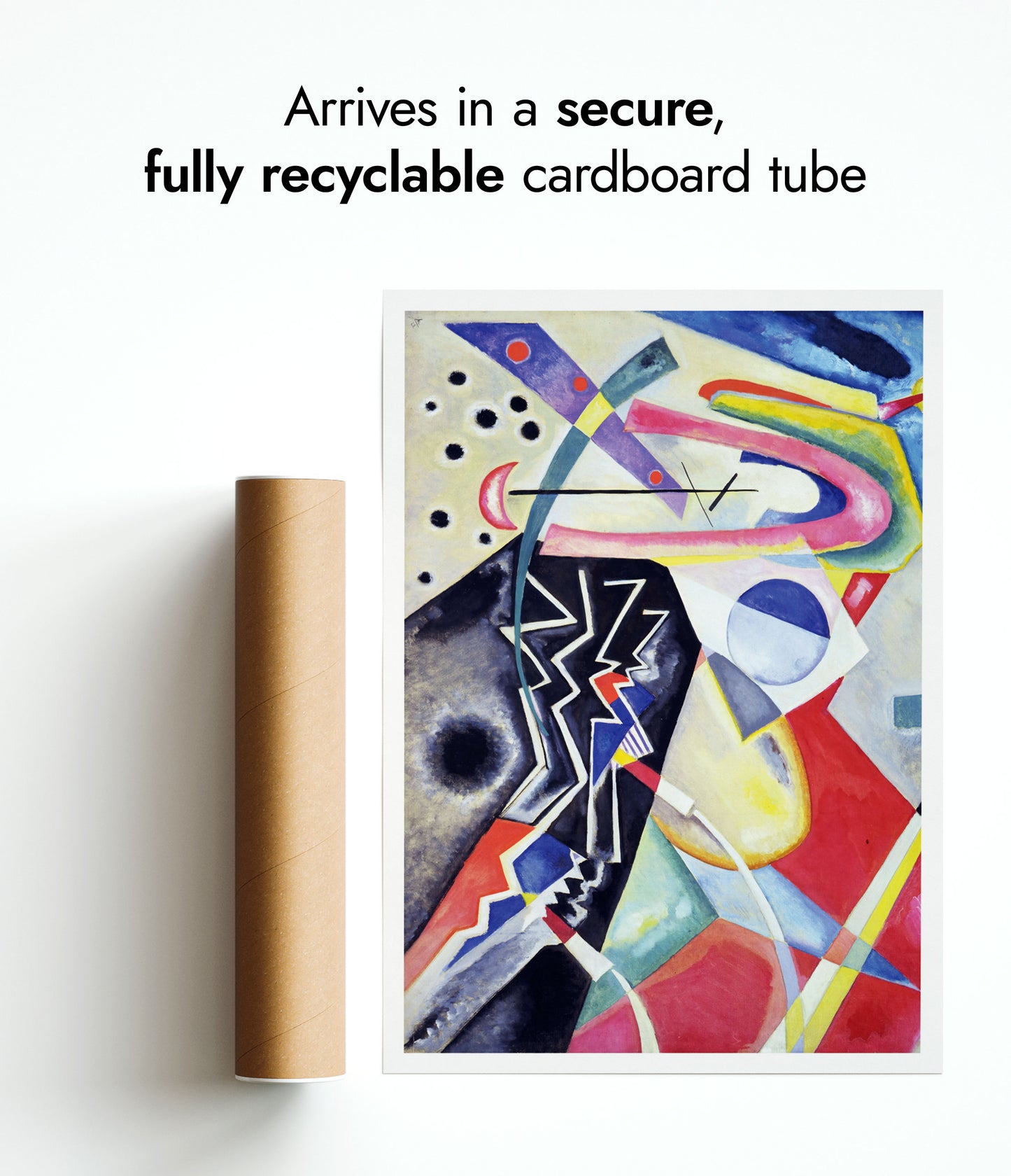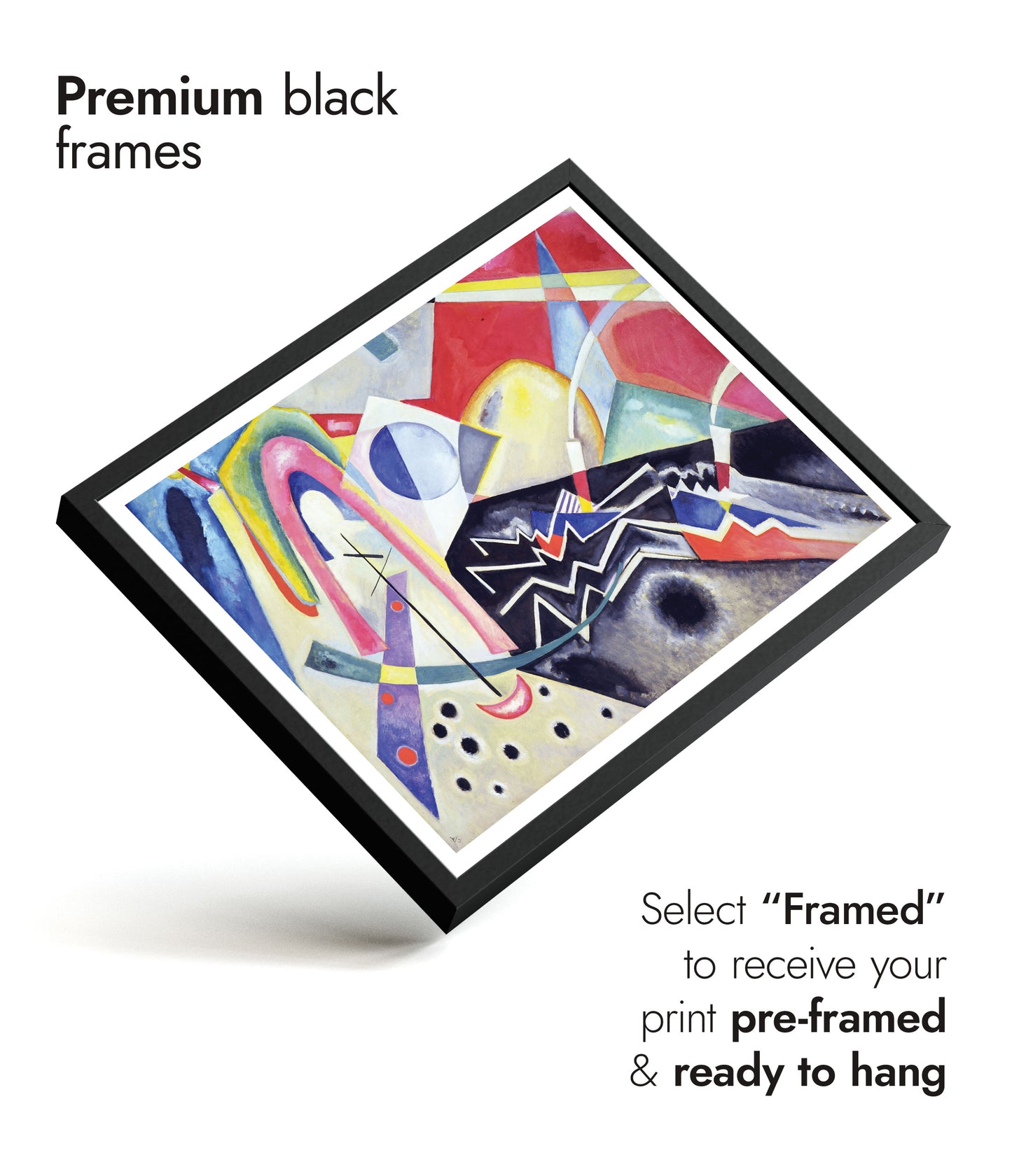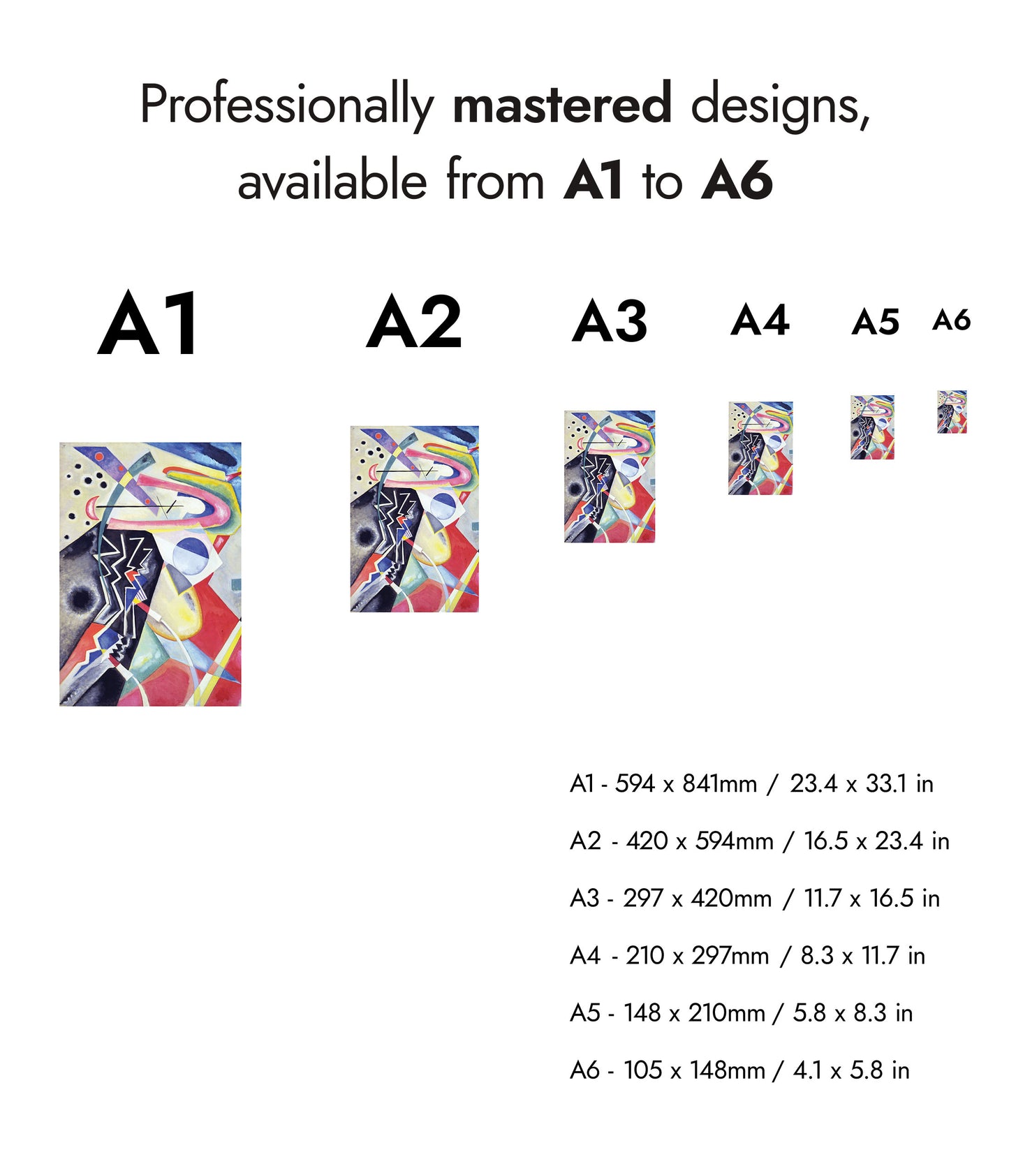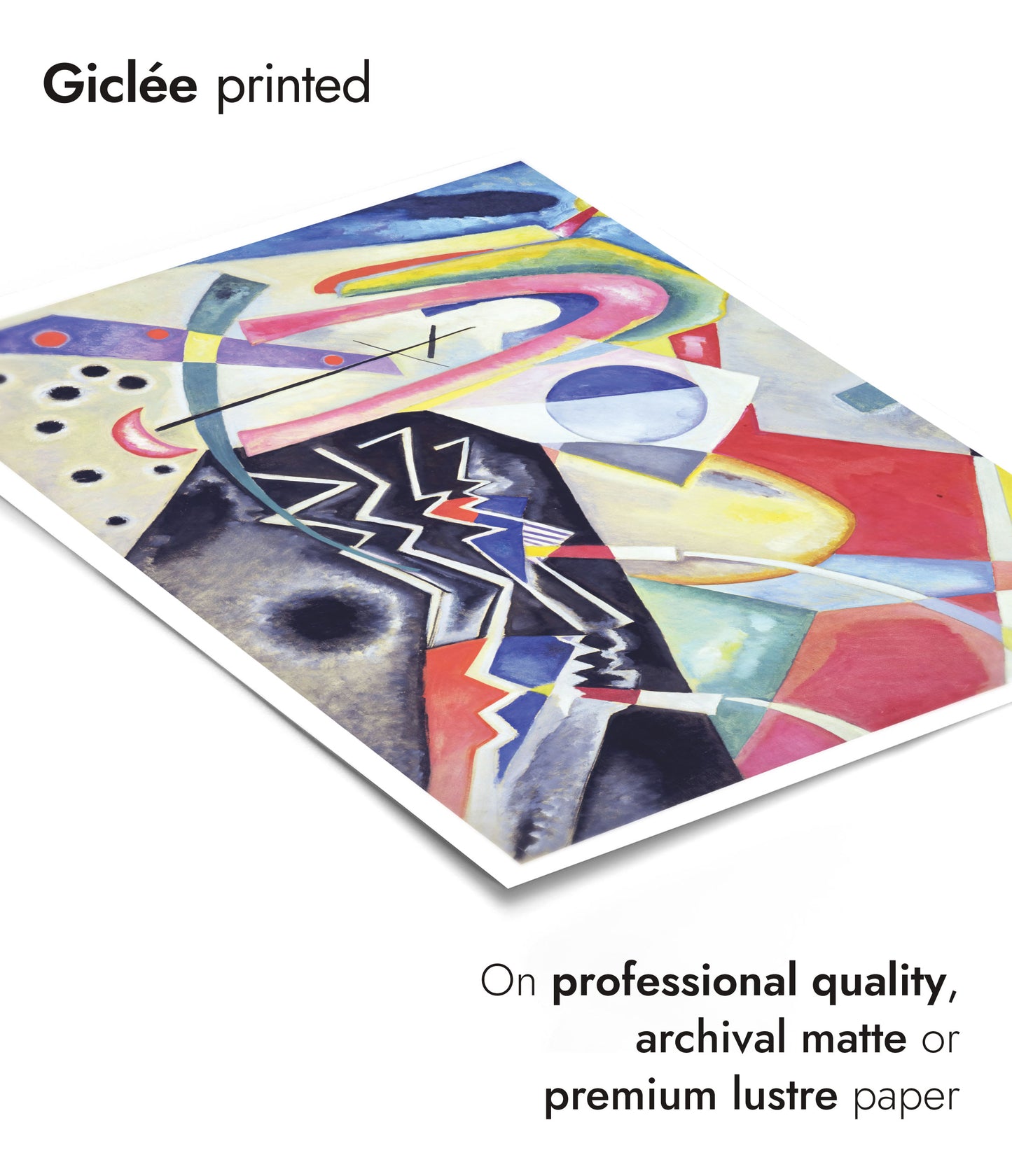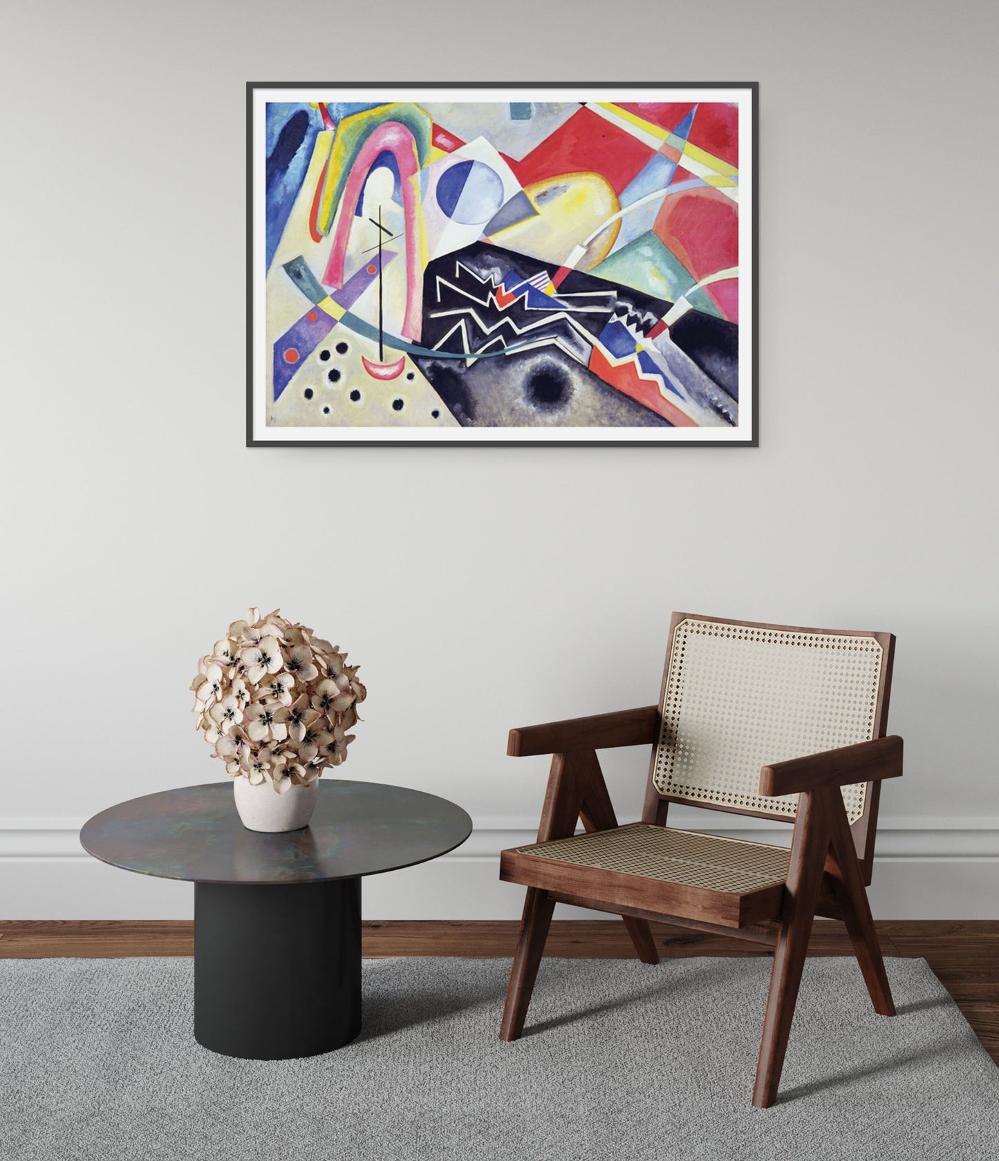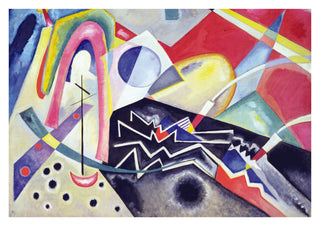 This geometric "White Zig Zags" poster by Wassily Kandinsky features a vibrant interplay of abstract shapes and lines, embodying Bauhaus aesthetics. Highlighting dynamic zigzag patterns and a spectrum of bold colours, it creates a visual symphony. Suitable for modern and mid-century decor, this abstract landscape captures the essence of modern art trends. Ideal for enthusiasts of contemporary paintings.