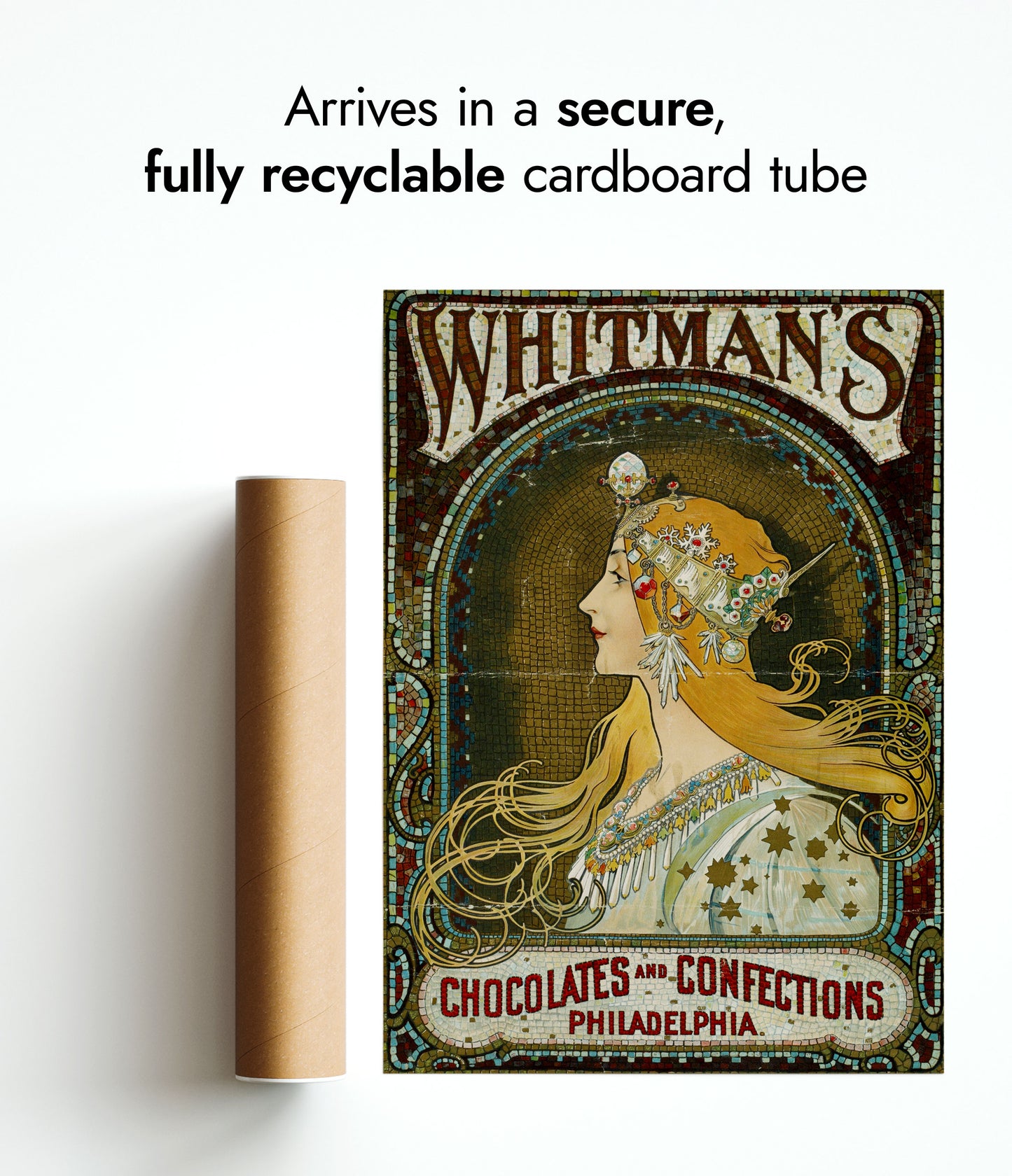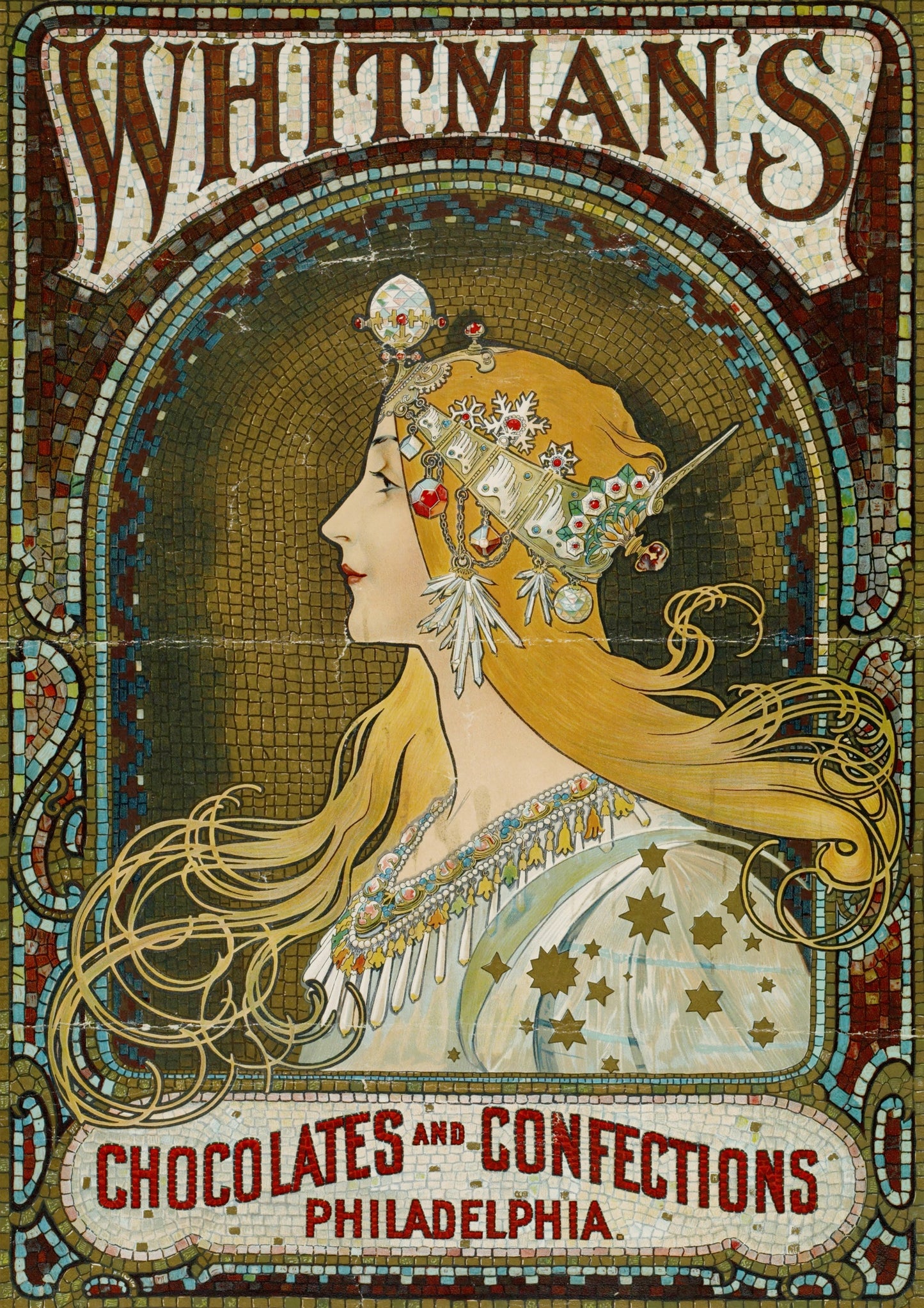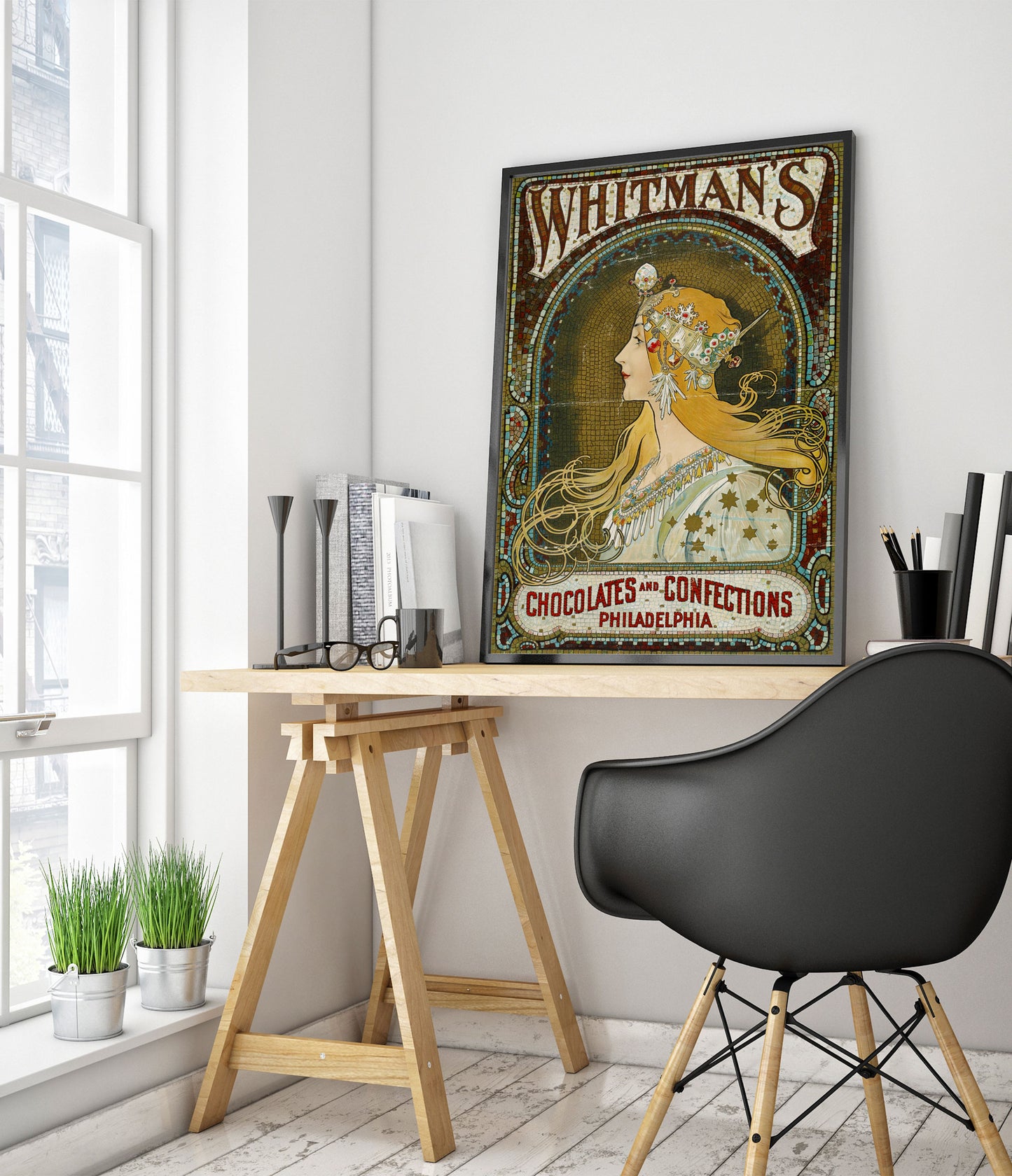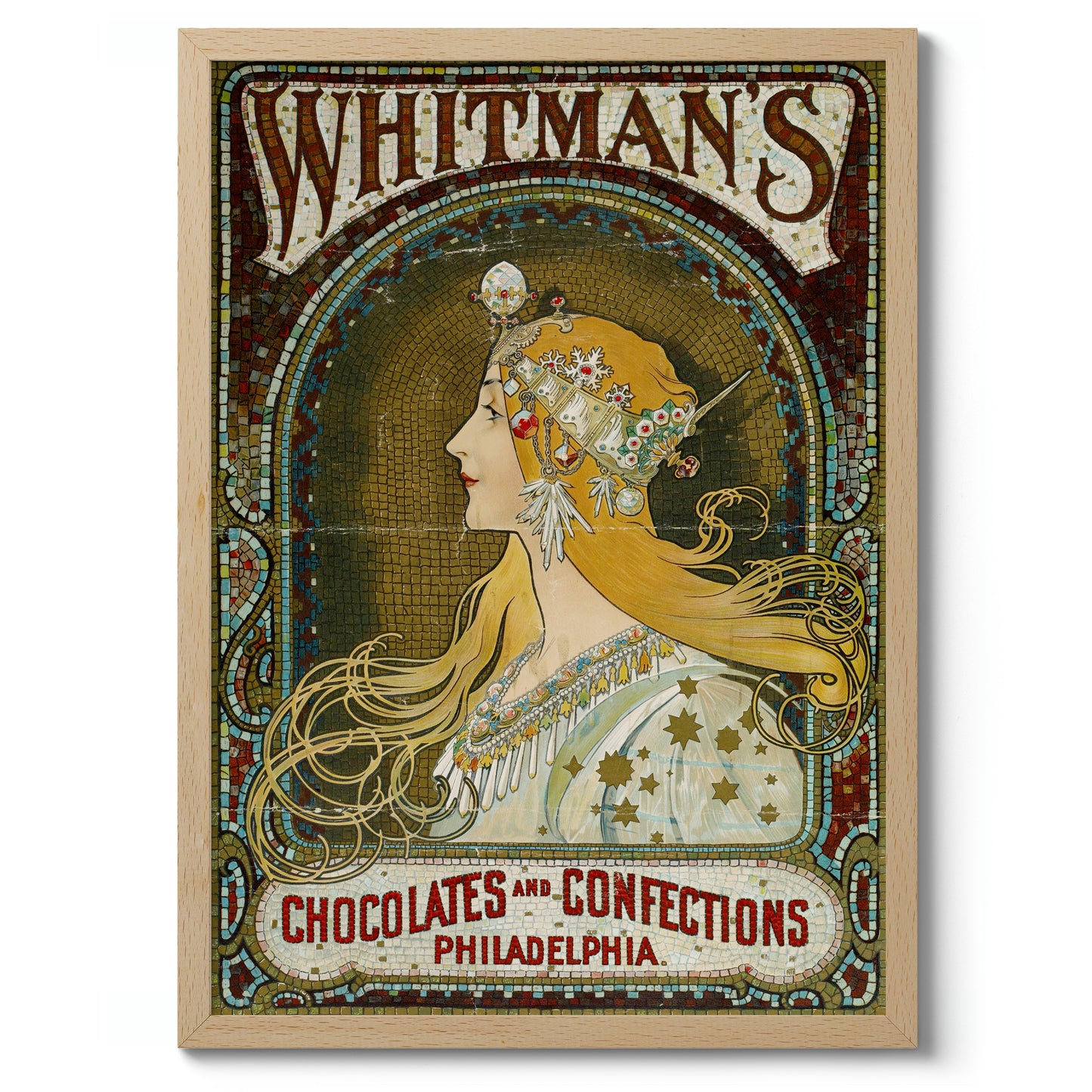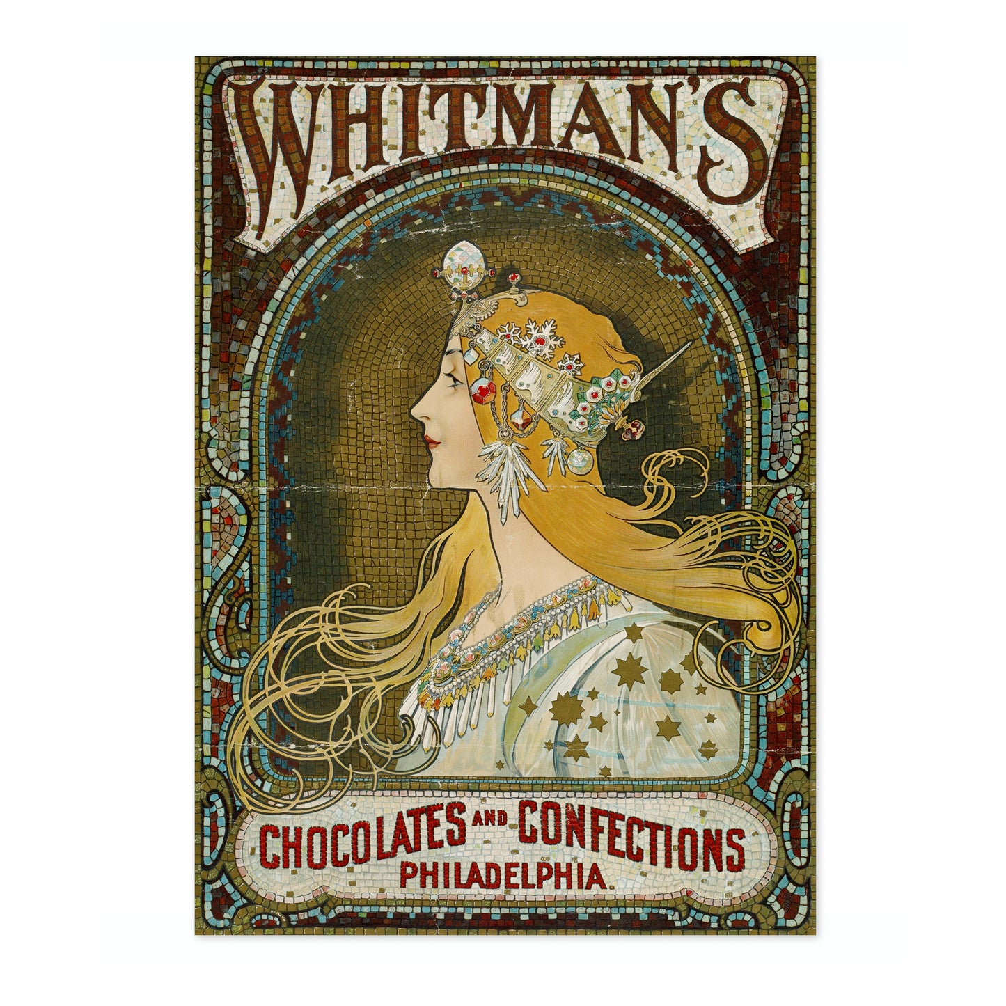 This vintage poster features an elegant Art Deco illustration promoting Whitman's Chocolates and Confections from Philadelphia. The art showcases a profile of a woman adorned with ornamental headpieces and flowing blonde hair, surrounded by a mosaic-style background, embodying timeless elegance and nostalgia. Perfect for vintage art enthusiasts and food advertisement collectors.