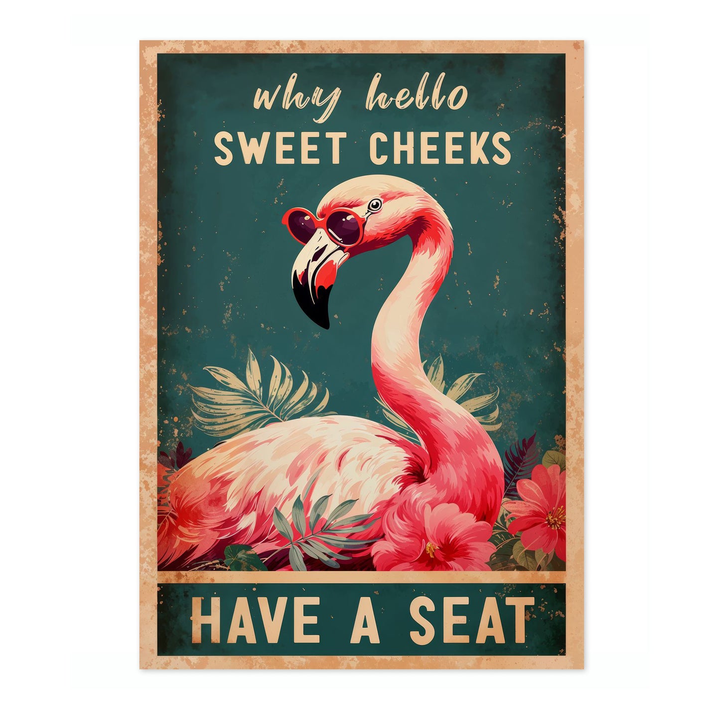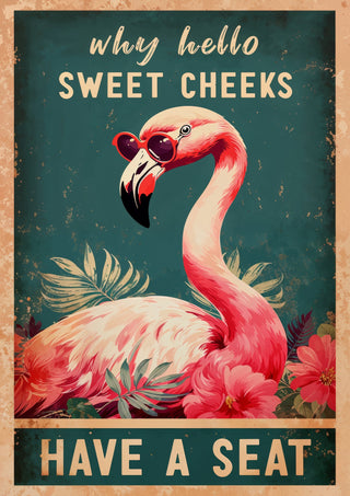 This vibrant poster features a charming pink flamingo donning sunglasses against a rich green background. Tropical foliage and bright flowers frame the flamingo, adding a playful touch. The bold, humorous text "Why Hello Sweet Cheeks, Have a Seat" makes it ideal for bathroom decor. This artwork combines humor with whimsical design, perfect for adding a splash of personality to any space.